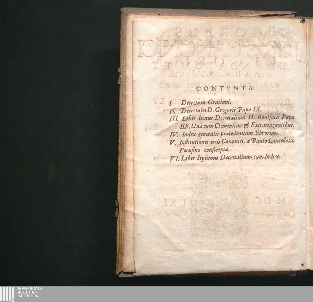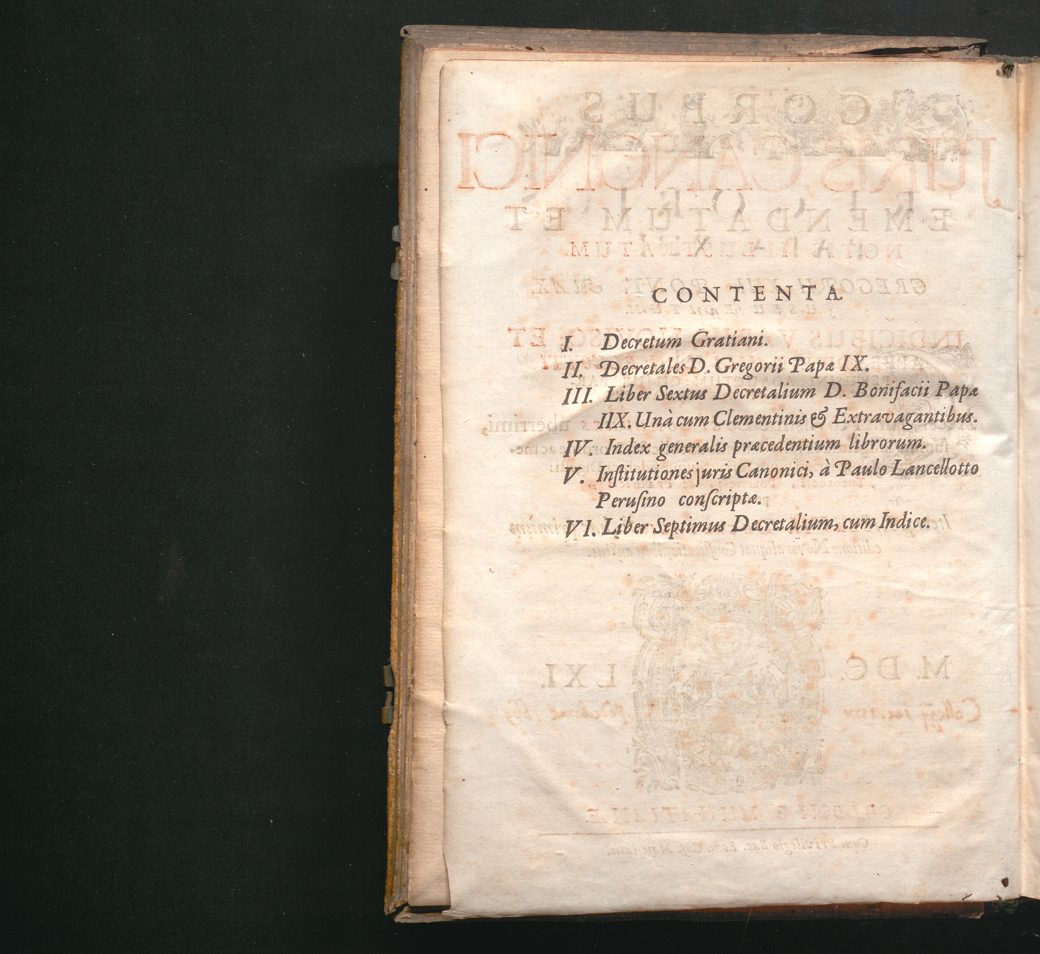 Corpus Juris Canonici : Emendatum Et Notis Illustratum. Indicibus Variis, Novisq[ue] Et Appendice Pauli Lancelotti Perusini Adauctum: Cujus Partes Indicat Aversa Pagina. Accesserunt Novissimè Loci Communes uberrimi, summâ diligentiâ ex ipsis Canonibus collecti, & ordine ac methodo singulari ad usum Fori utriusque fideliter Digesti: Theologis, Politicis, & Practicis pernedessarij. Itemq[ue] Liber VII. Decretalium hac primùm editione Novis aliquot Constitutionibus auctus / Gregorii XIII. Pont. Max. Jussu Editum