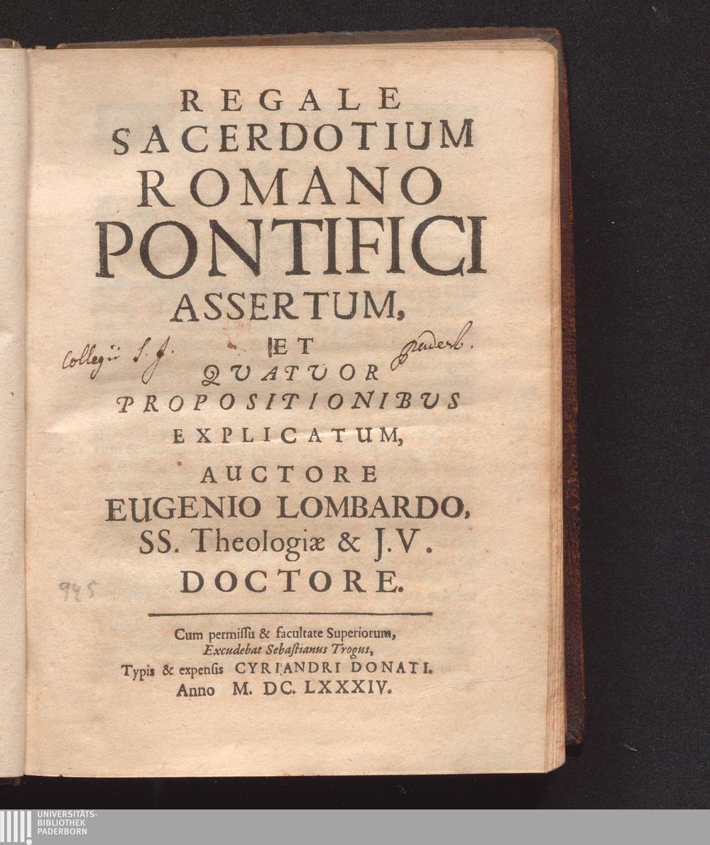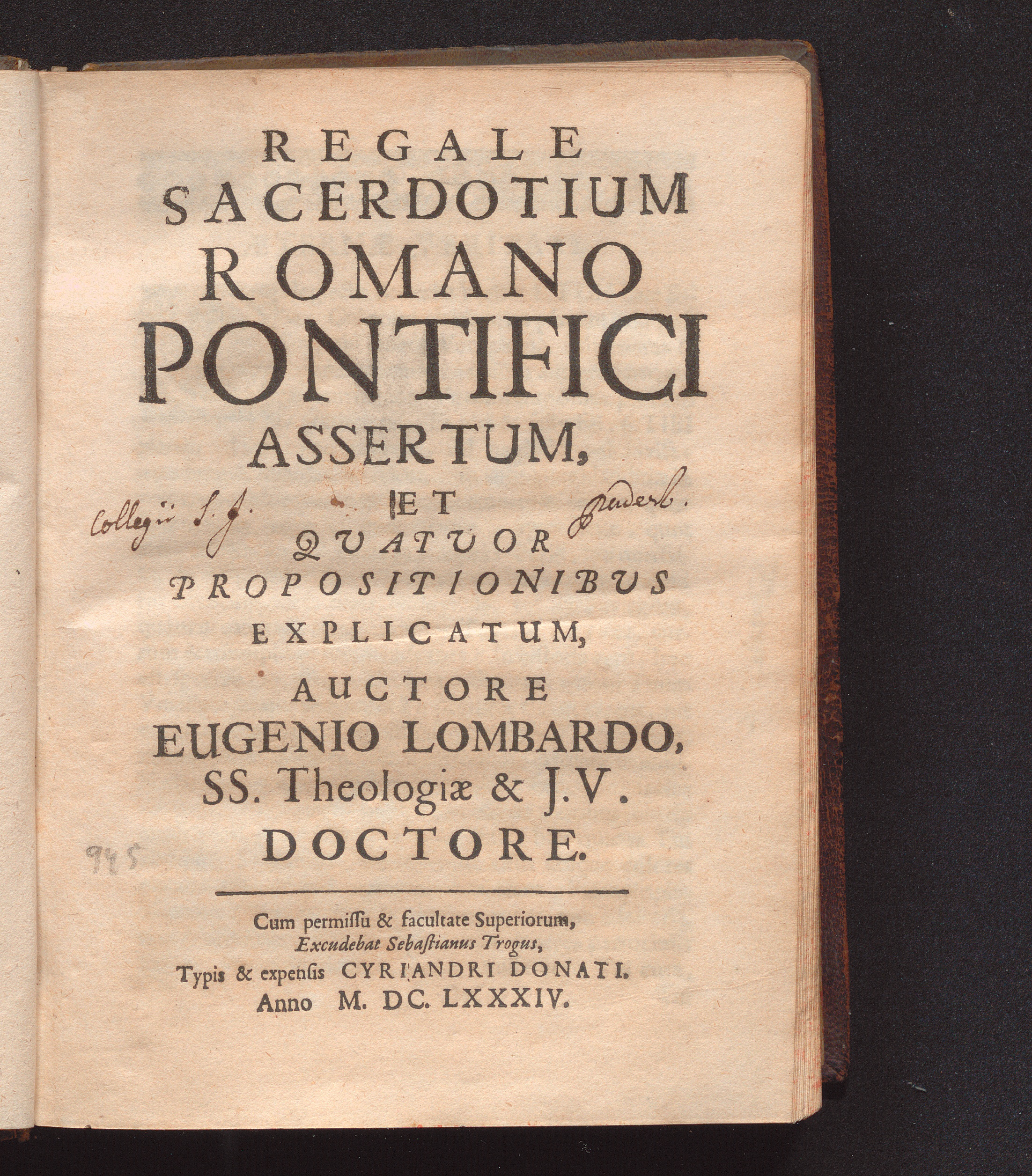 Regale Sacerdotium Romano Pontifici Assertum : Et Quatuor Propositionibus Explicatum / Auctore Eugenio Lombardo, SS. Theologiæ & J. V. Doctore