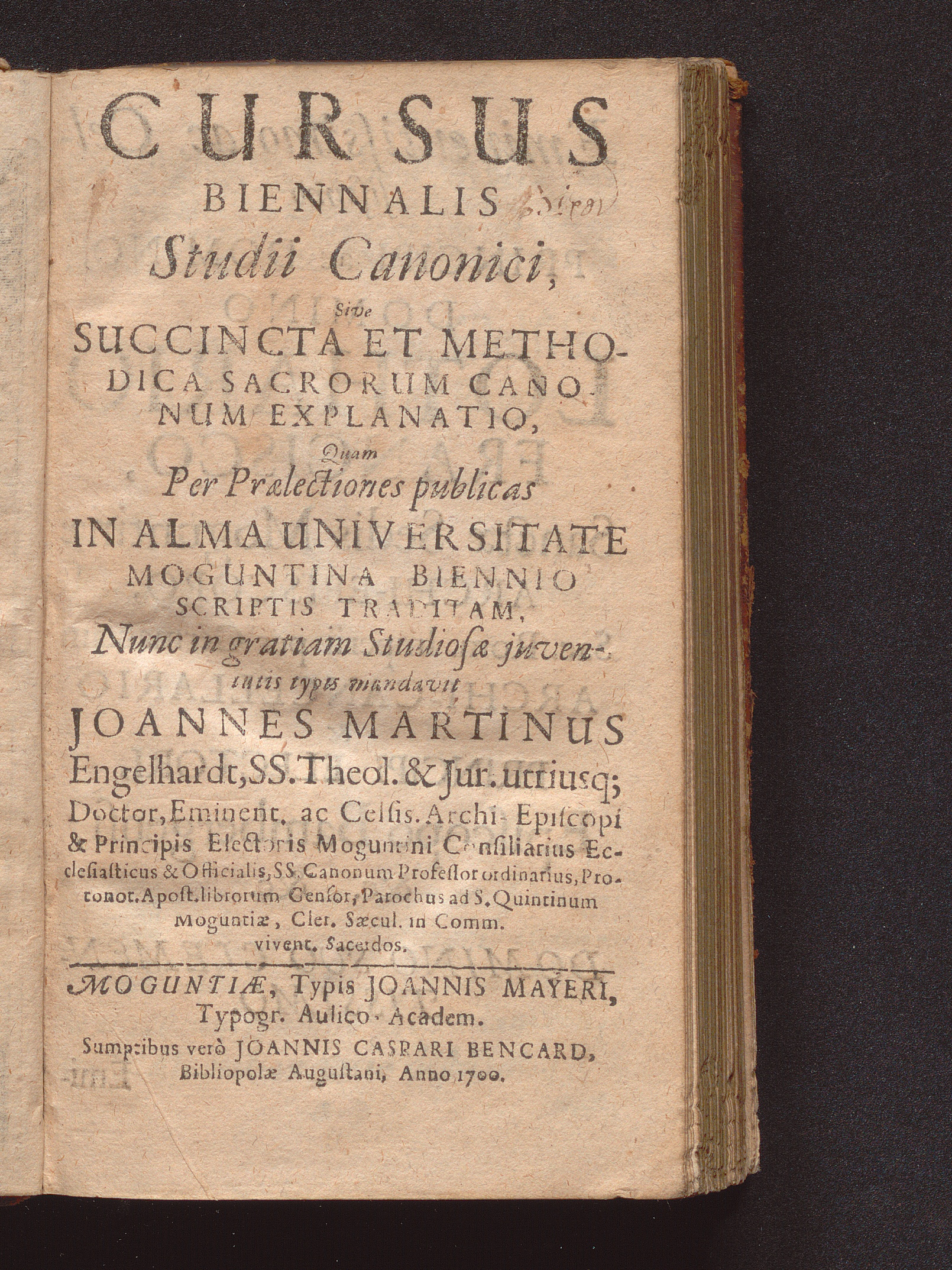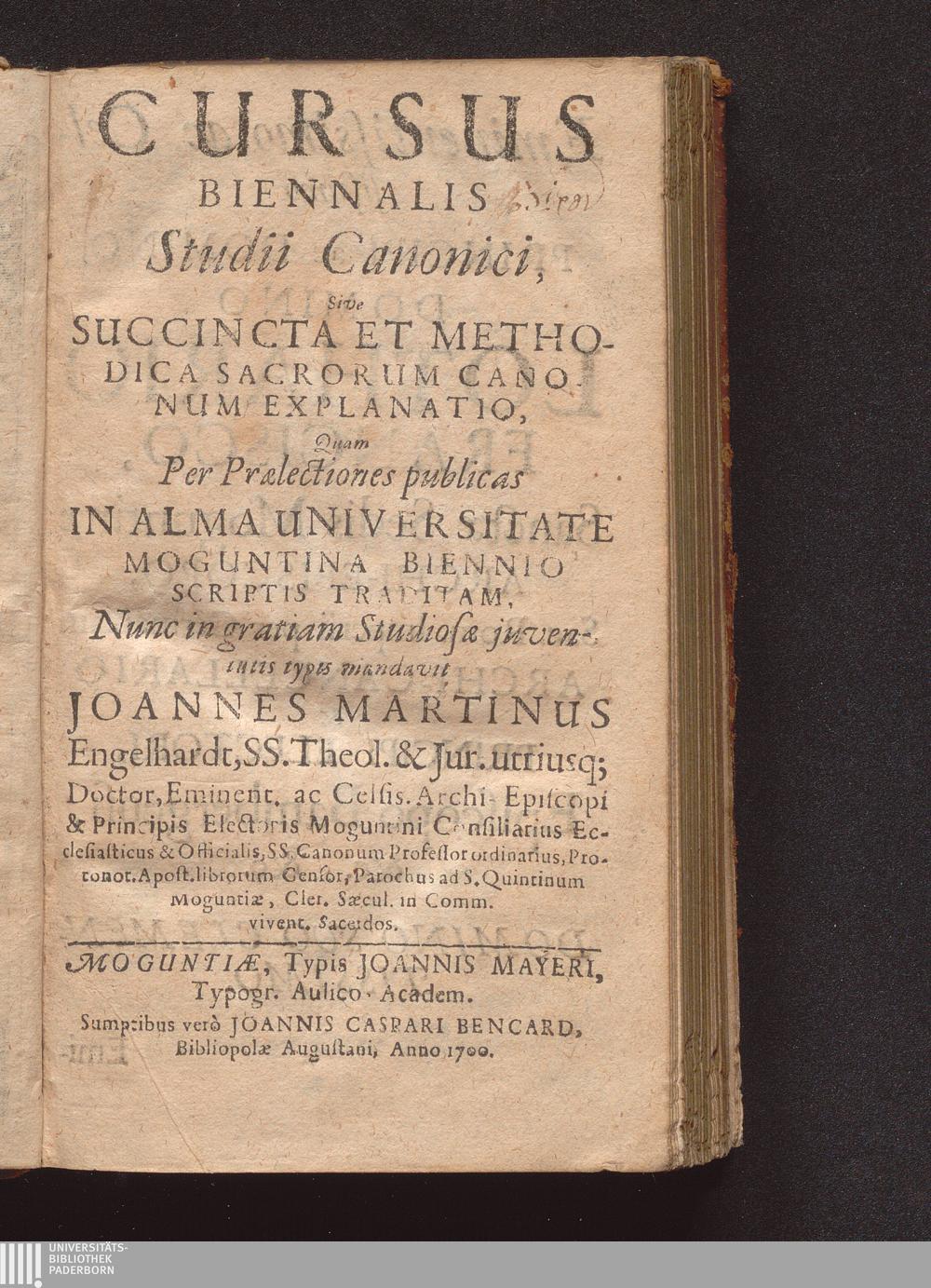 Cursus Biennalis Studii Canonici, Sive Succincta Et Methodica Sacrorum Canonum Explanatio : Quam Per Prælectiones publicas In Alma Universitate Moguntina Biennio Scriptis Traditam / Nunc in gratiam Studiosæ juventutis typis mandavit Joannes Martinus Engelhardt, SS. Theol. & Jur. utriusq[ue] Doctor, Eminent. ac Celsis. Archi-Episcopi & Principis Electoris Moguntini Consiliarius Ecclesiasticus & Officialis, SS. Canonum Professor ordinarius, Protonor. Apost. librorum Censor, Parochus ad S. Quintinum Moguntiæ, Cler. Sæcul. in Comm. vivent. Sacerdos.
