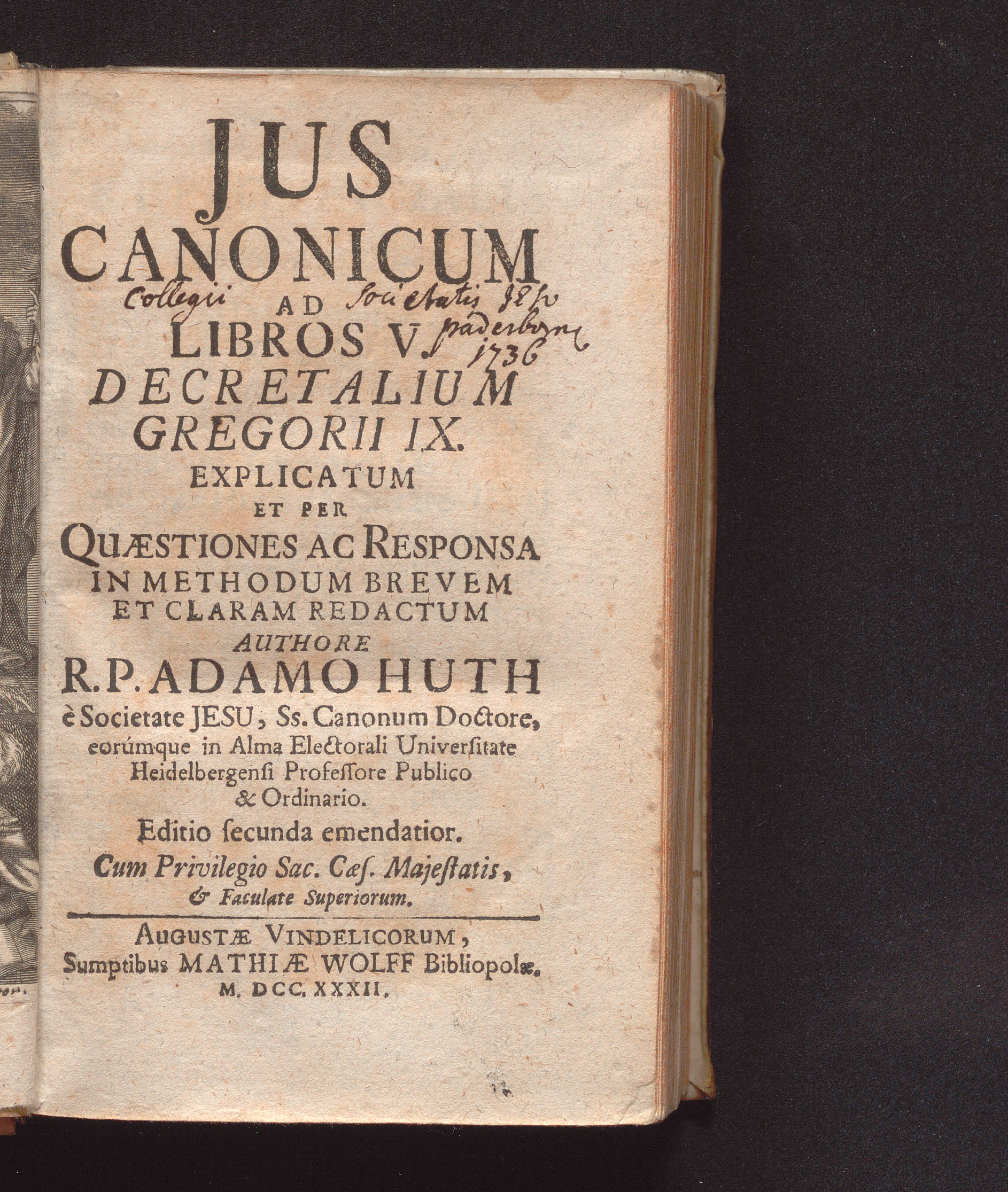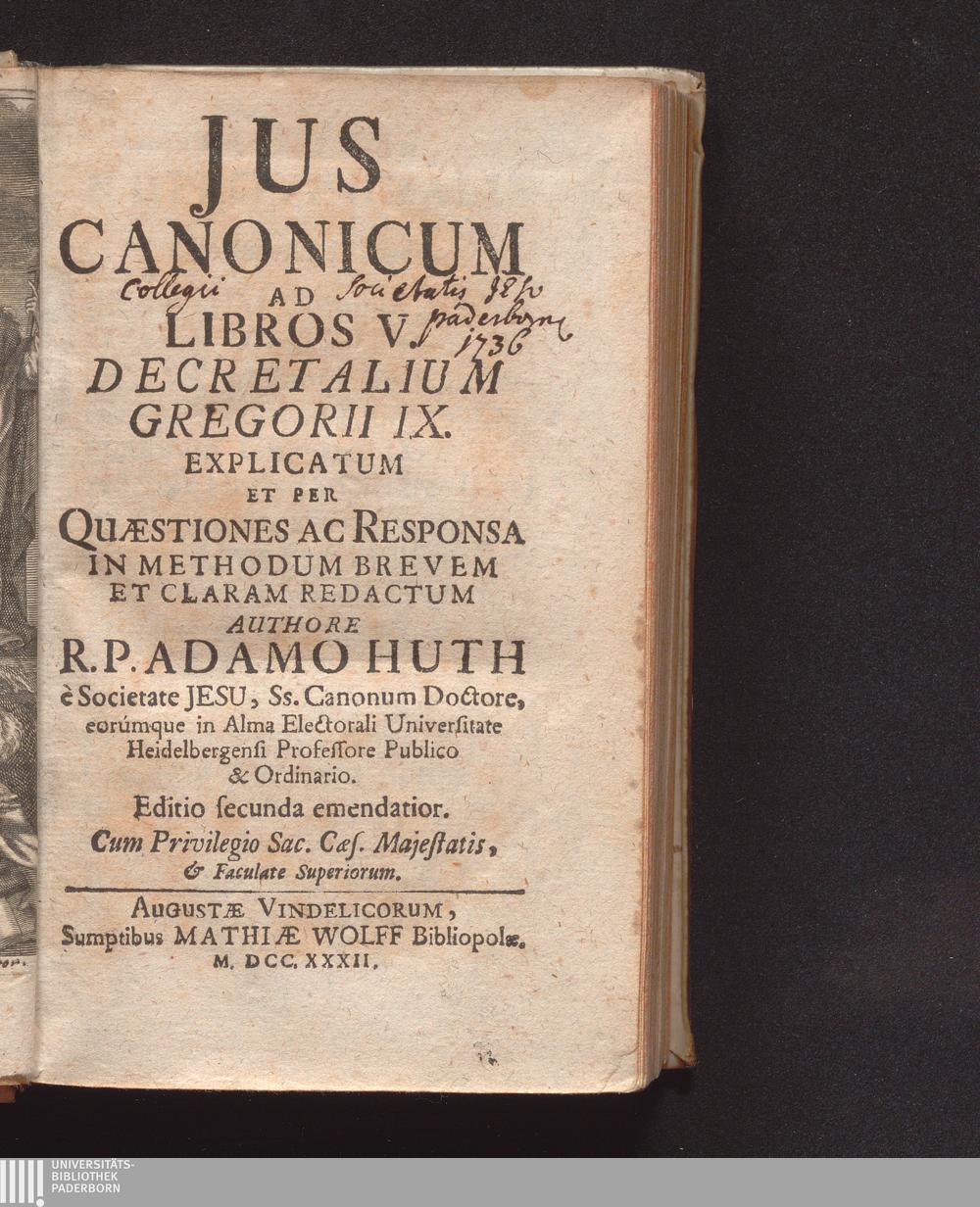 Jus Canonicum Ad Libros V. Decretalium Gregorii IX. / Explicatum Et Per Quaestiones Ac Responsa In Methodum Brevem Et Claram Redactum Authore R. P. Adamo Huth e Societate Jesu ...