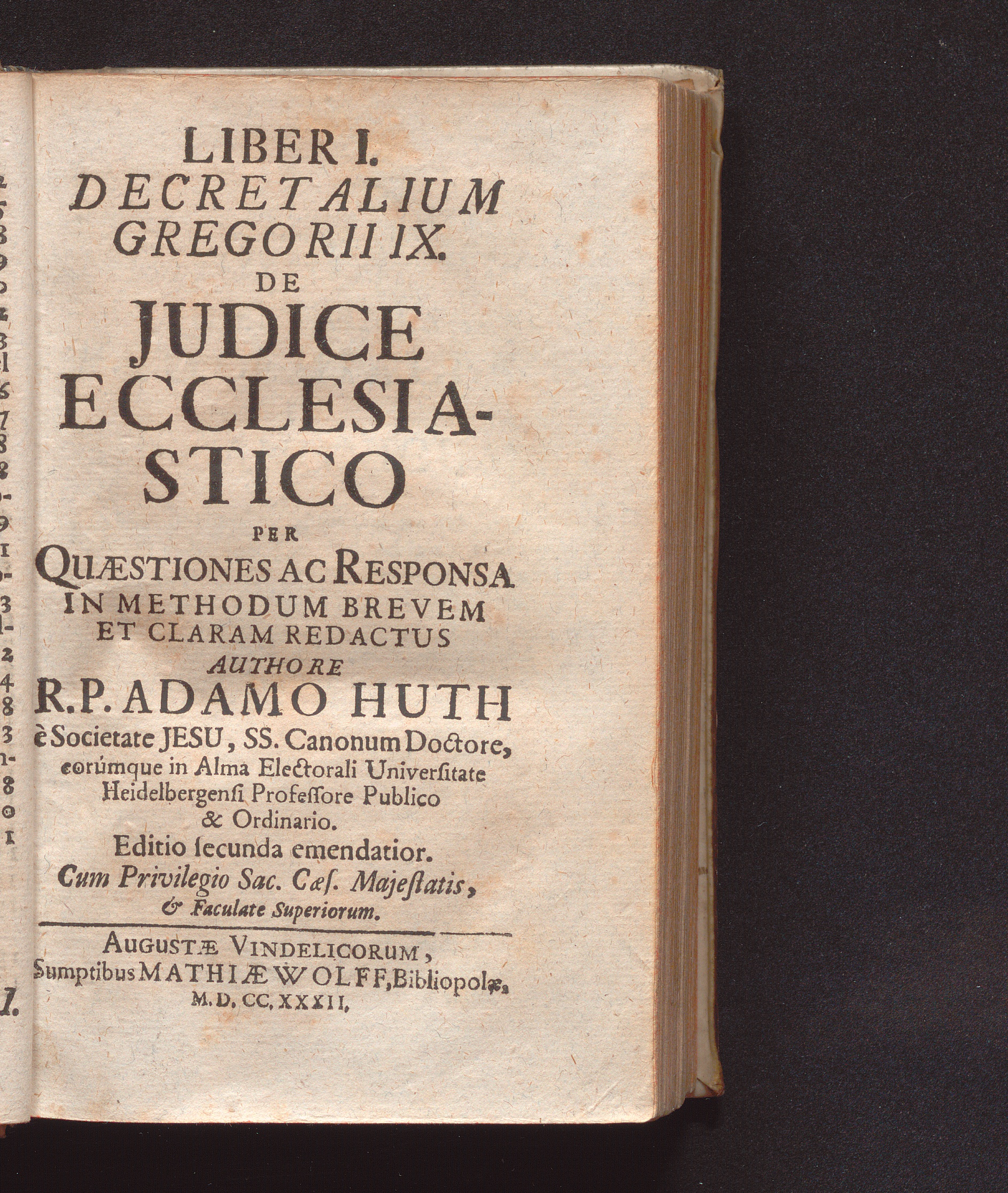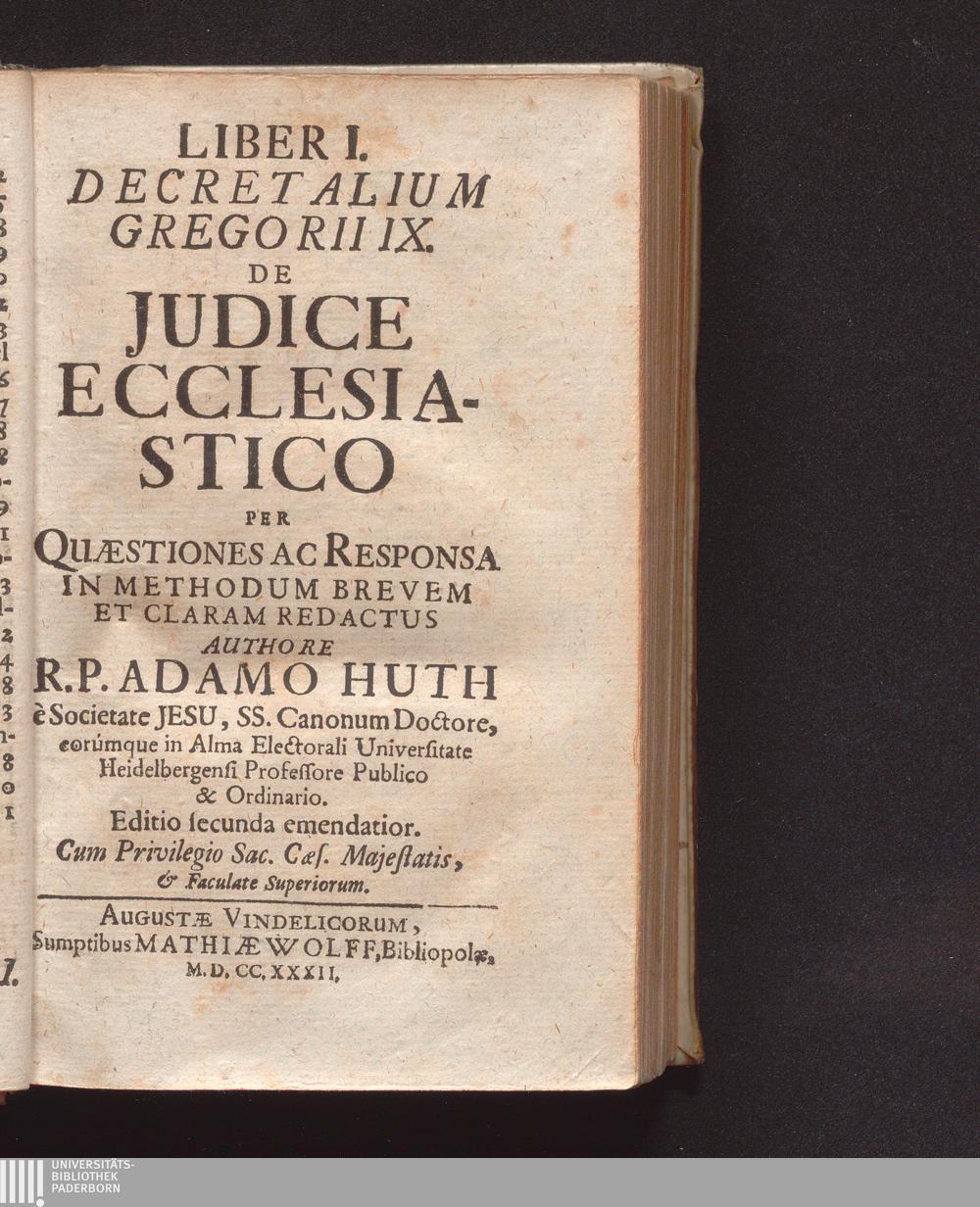 Jus Canonicum Ad Libros V. Decretalium Gregorii IX. / Explicatum Et Per Quaestiones Ac Responsa In Methodum Brevem Et Claram Redactum Authore R. P. Adamo Huth e Societate Jesu ...