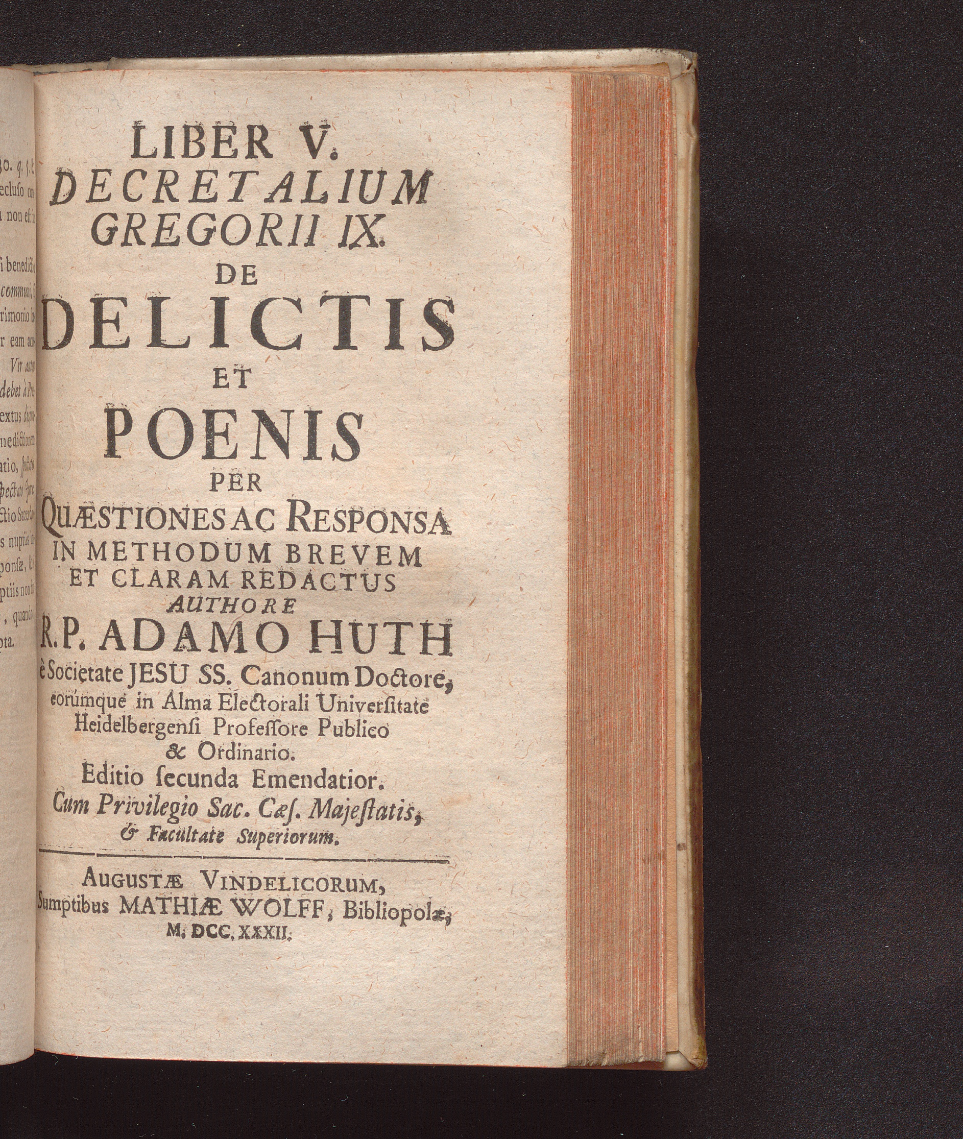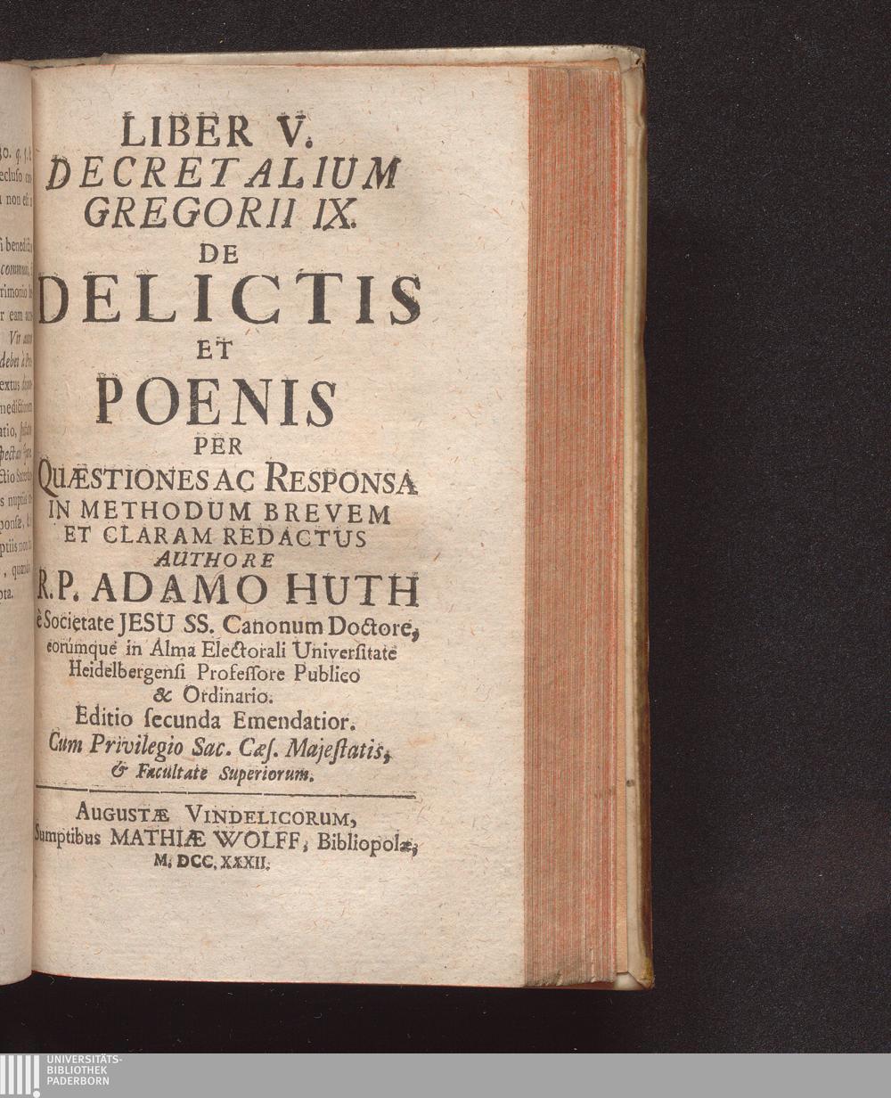 Jus Canonicum Ad Libros V. Decretalium Gregorii IX. / Explicatum Et Per Quaestiones Ac Responsa In Methodum Brevem Et Claram Redactum Authore R. P. Adamo Huth e Societate Jesu ...