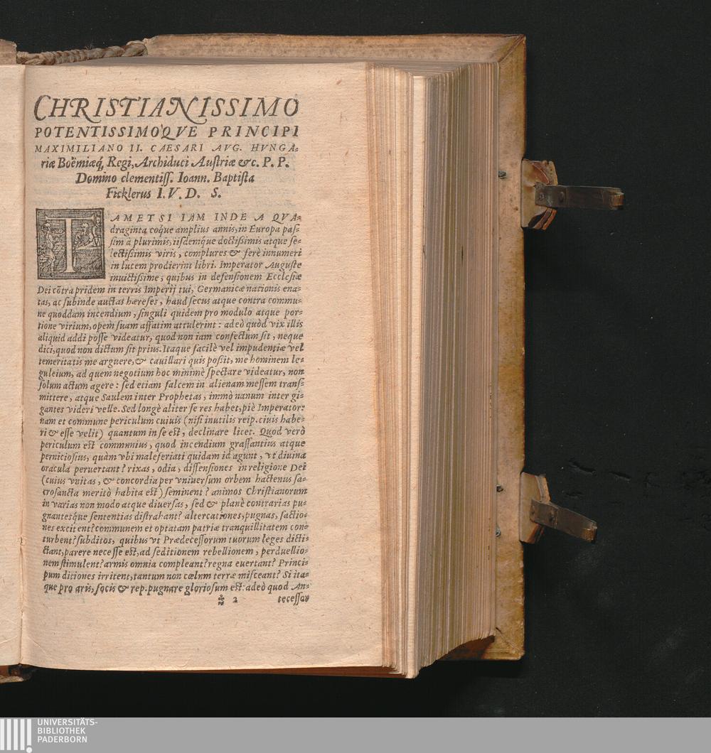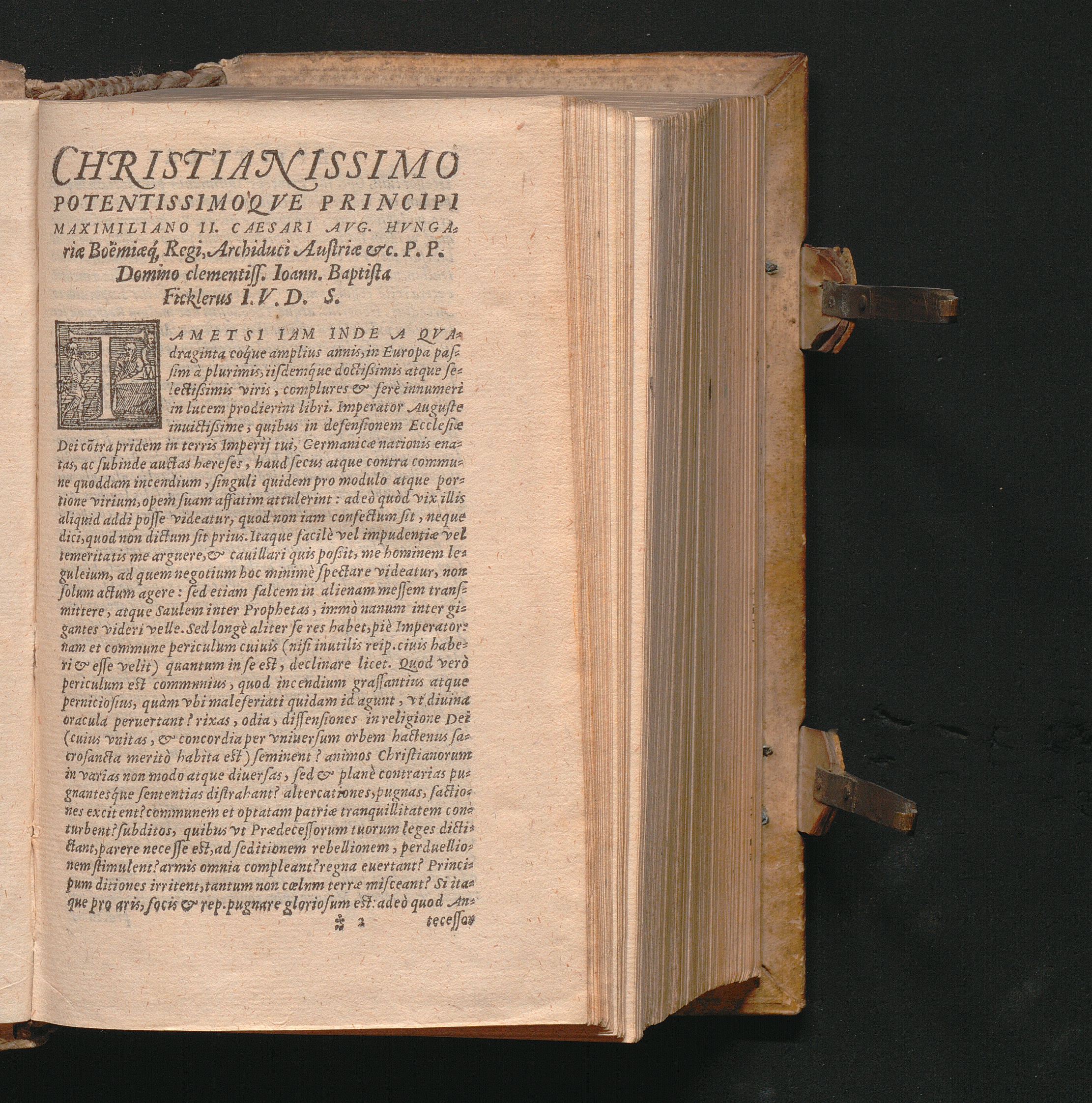 Theologia|| Ivridica,|| Sev Ivs Civile Theologicvm,|| : quo ex omnium ferè Imperatorum Christiano-||rum, & vetustissimorum quidem à Constantino Magno vsq[ue]|| ad Sigismundum, sacratiss. legibus, edictis, constitutionibus|| & Epistolis declaratur, eam quam hodiè à maioribus nostris,|| ... ab ea semetipsos|| segregant.|| / Avthore Ioanne Baptista|| Ficklero I.V.D. Etc. Ex VVila|| ante Herciniam, ciuitate Impe-||riali oriundo.||