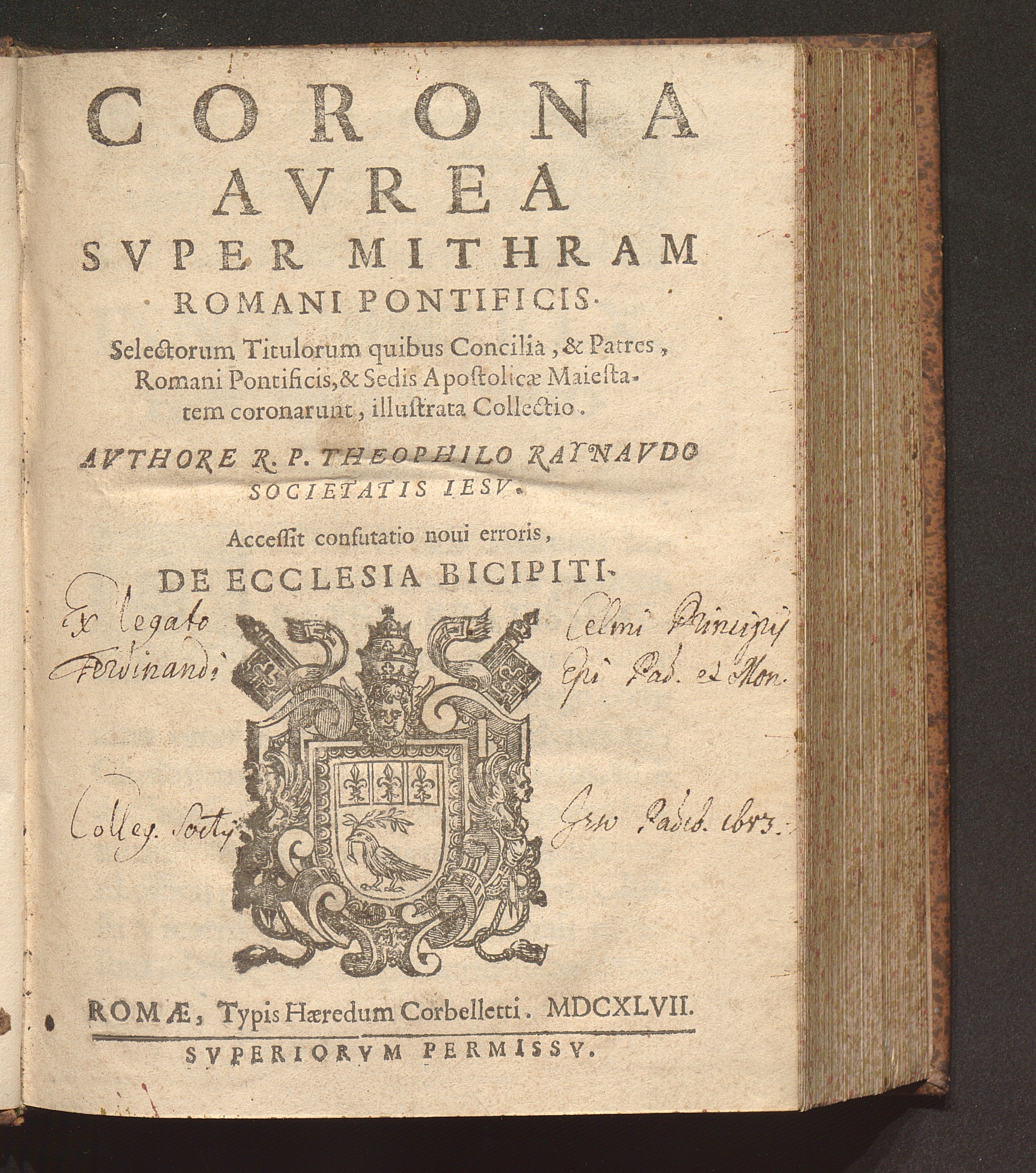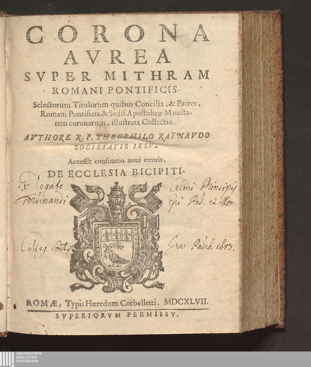 Corona Avrea Svper Mithram Romani Pontificis : Selectorum Titulorum quibus Concilia, & Patres, Romani Pontificis, & Sedis Apostolicae Maiestatem coronarunt, illustrata Collectio / Avthore R. P. Theophilo Raynavdo Societatis Iesv