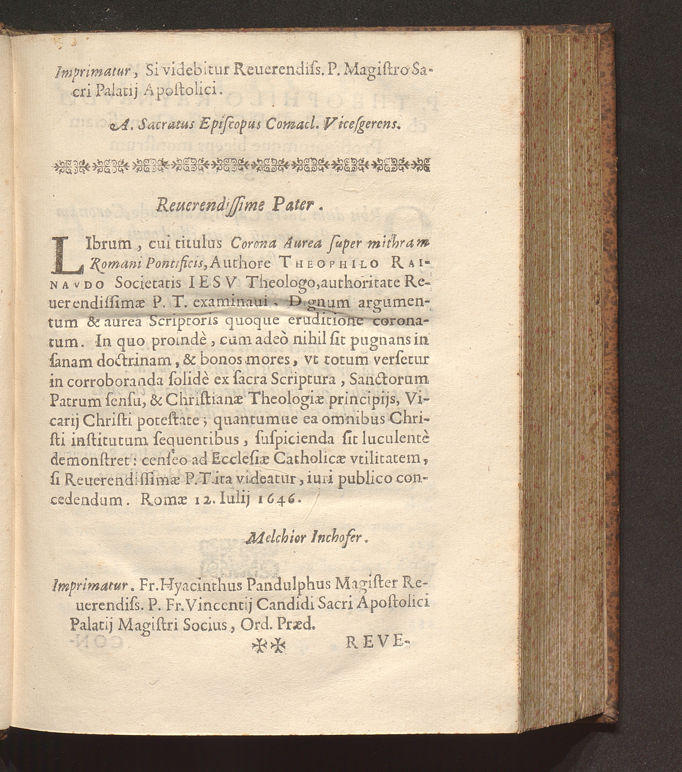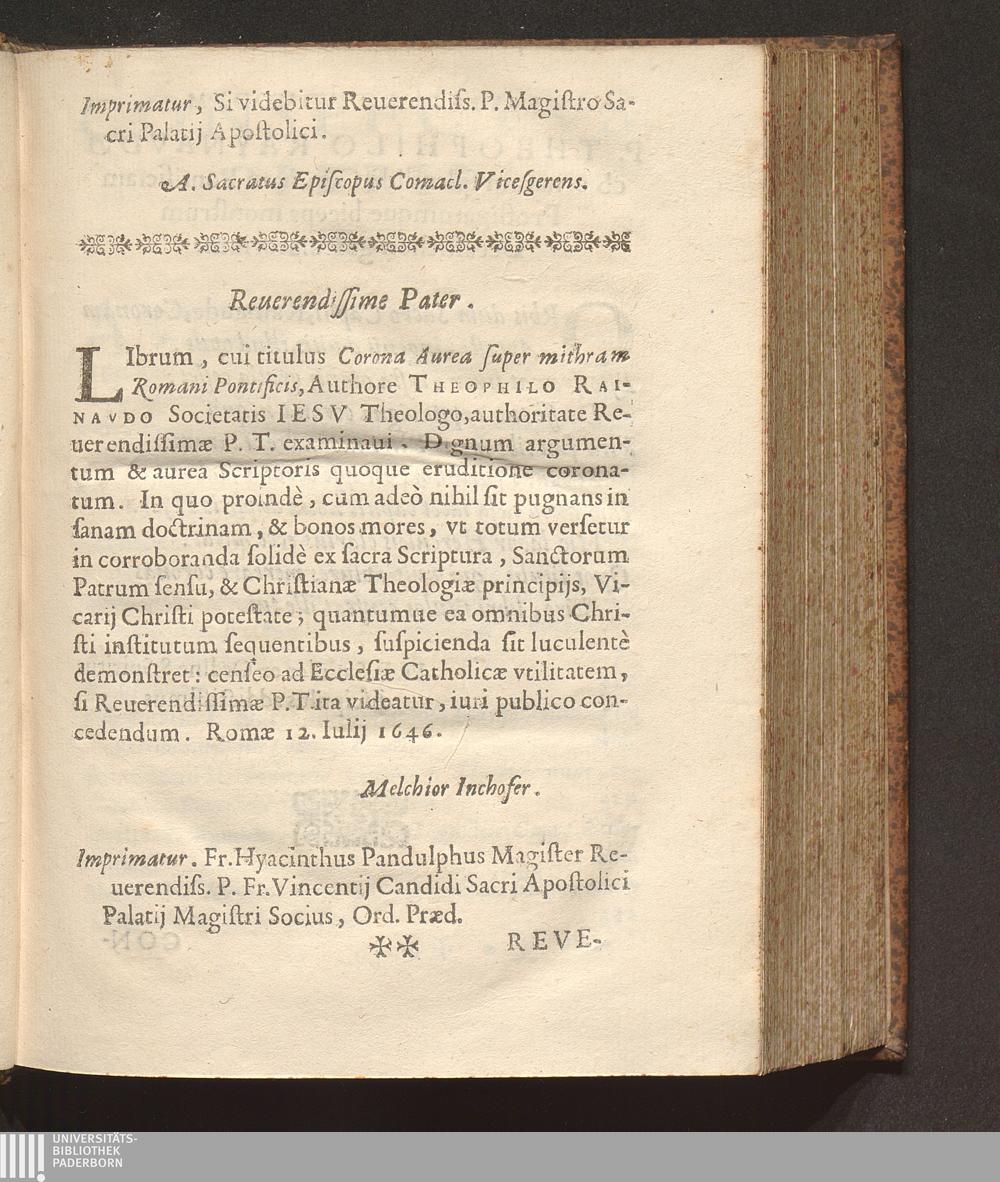 Corona Avrea Svper Mithram Romani Pontificis : Selectorum Titulorum quibus Concilia, & Patres, Romani Pontificis, & Sedis Apostolicae Maiestatem coronarunt, illustrata Collectio / Avthore R. P. Theophilo Raynavdo Societatis Iesv