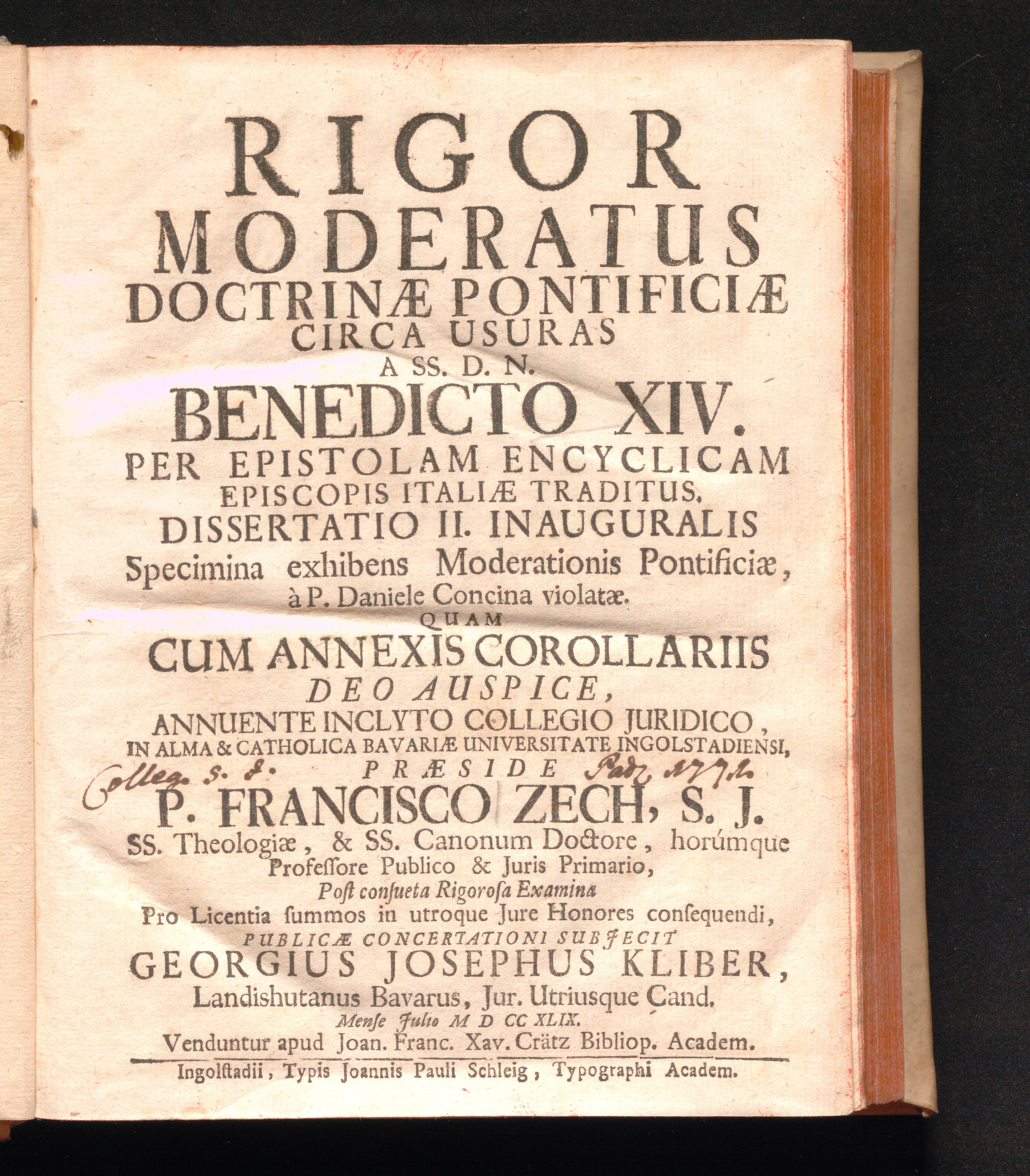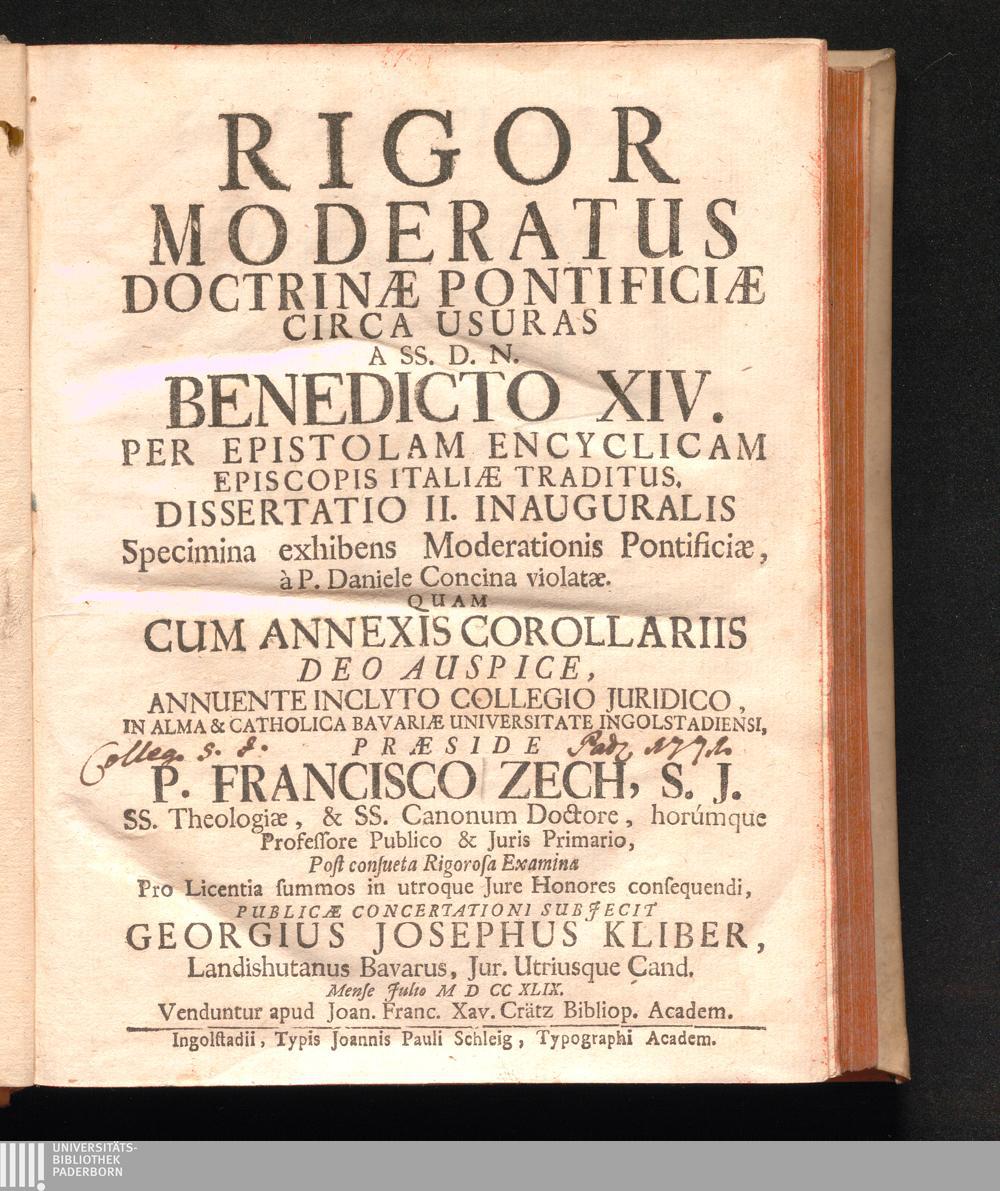 Dissertatio II. Inauguralis (1749) Specimina exhibens Moderationis Pontificiæ, à P. Daniele Concina violatæ / Quam Cum Annexis Corollariis ... Præside P. Francisco Zech ... Post consueta Rigorosa Examina ... Publicæ Concertationi Subjecit Georgius Josephus Kliber ... Mense Julio M D CC XLIX