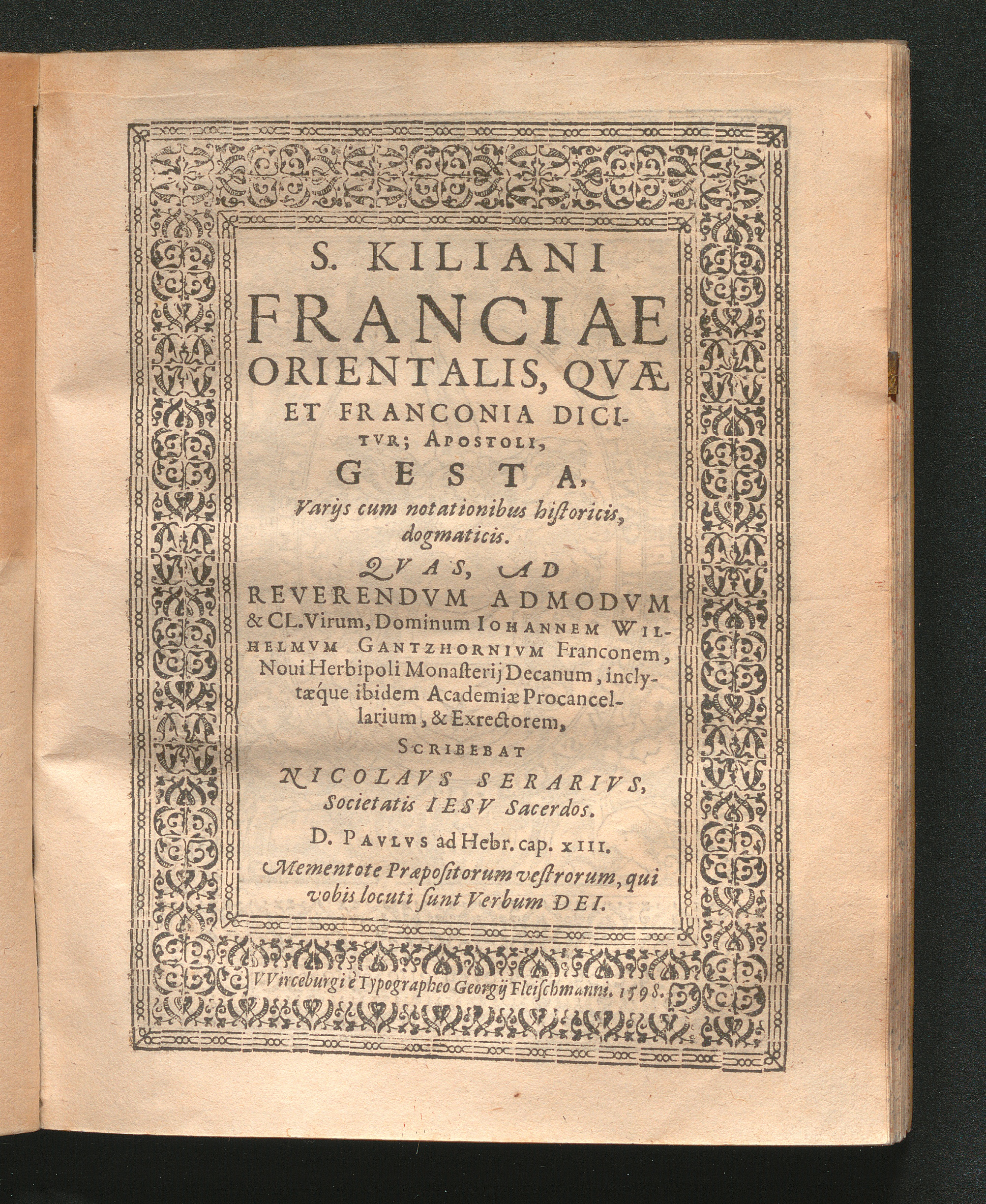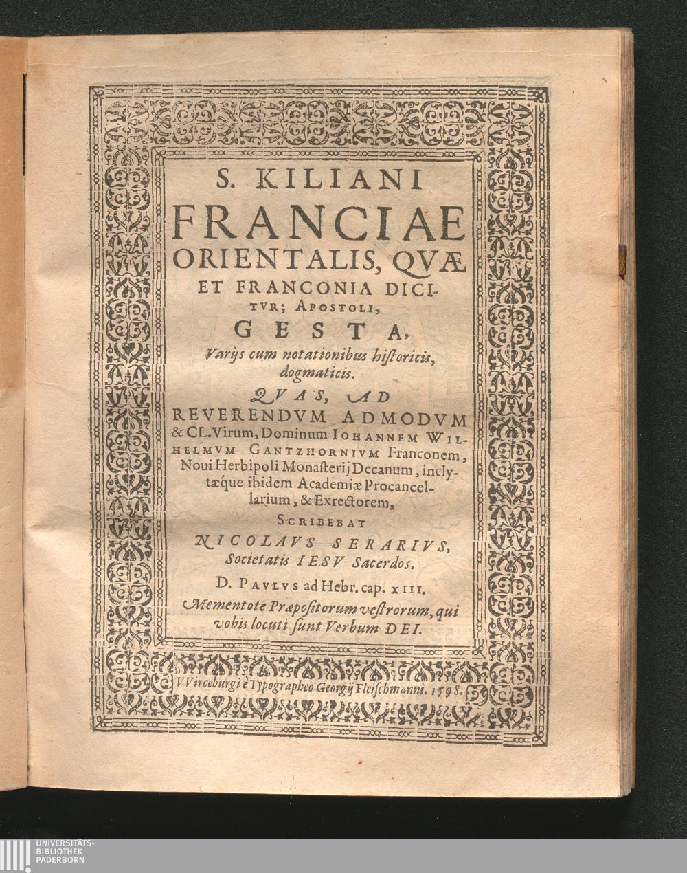 S. Kiliani Franciae Orientalis, Qvæ Et Franconia Dicitvr; Apostoli, Gesta, Varijs cum notationibus historicis, dogmaticis / Qvas, Ad Reverendvm Admodvm & CL. Virum, Dominum Iohannem Wilhelmvm Gantzhornivm Franconem, Noui Herbipoli Monasterij Decanum, inclytæque ibidem Academiæ Procancellarium, & Exrectorem, Scribebat Nicolavs Serarivs, Societatis Iesv Sacerdos