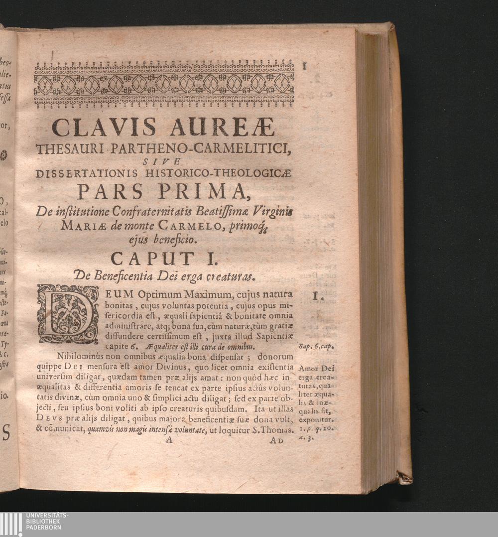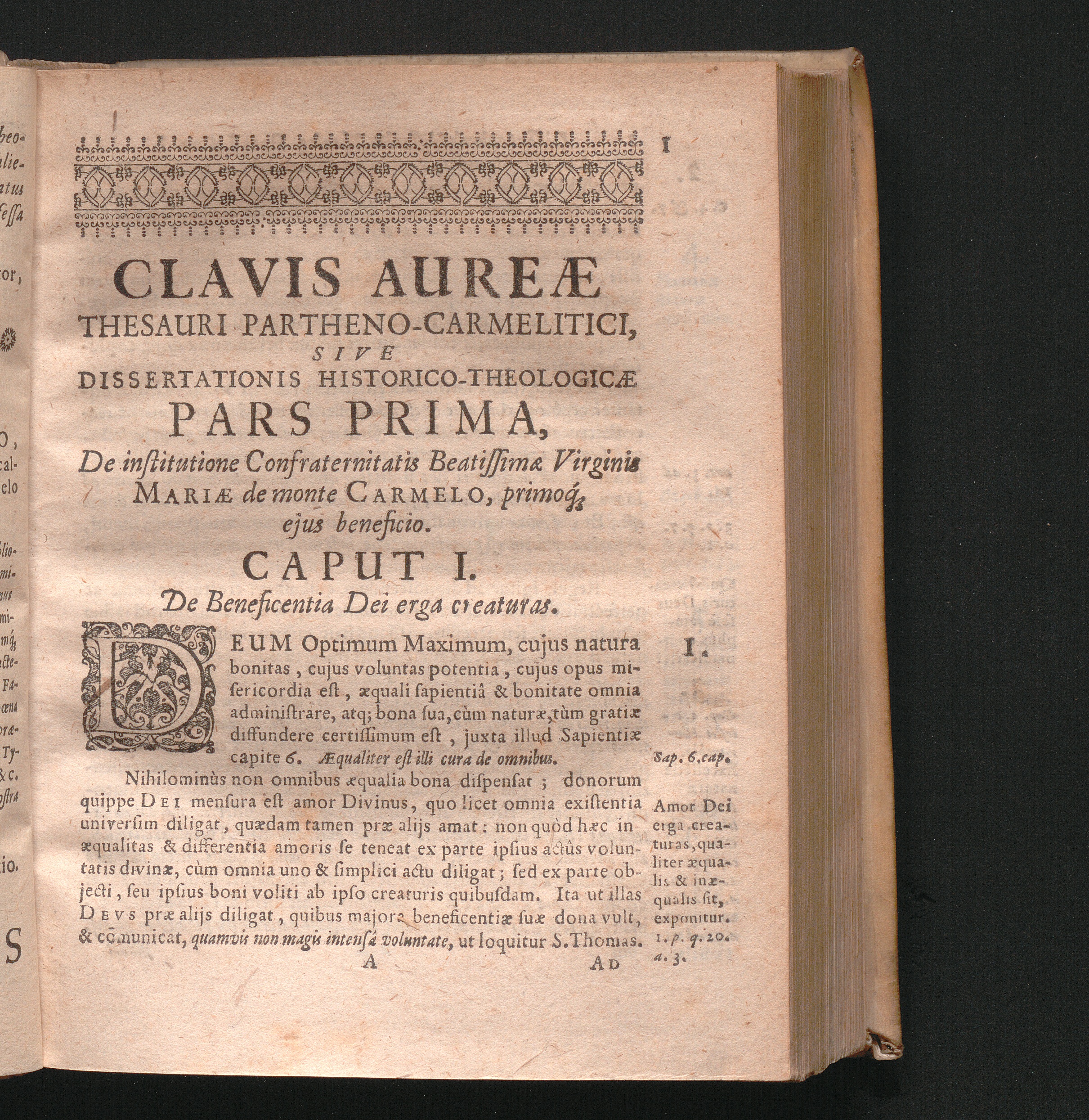 Clavis Aurea Thesauri Partheno-Carmelitici, Sive Dissertatio Historico-Theologica, Referans atque Exponens Antiquitatem & originem, confirmationem ac propagationem, beneficia ac privilegia, gratias & indulgentias, munera & obligatione celeberrimae Confraternitatis Scapularis Mariani Dei parae Virginis de monte Carmelo : Per Quam Etiam ... Theologorumq[ue] selectiores opiniones ... declaratur / Authore R.P. Paulo Ab Omnibus Sanctis, Carmelita Excalceato, Provinciae Germaniae Definitore