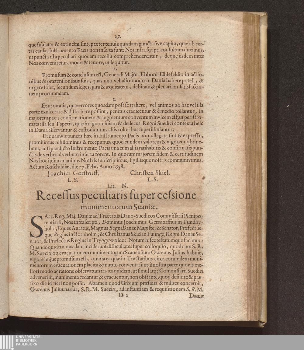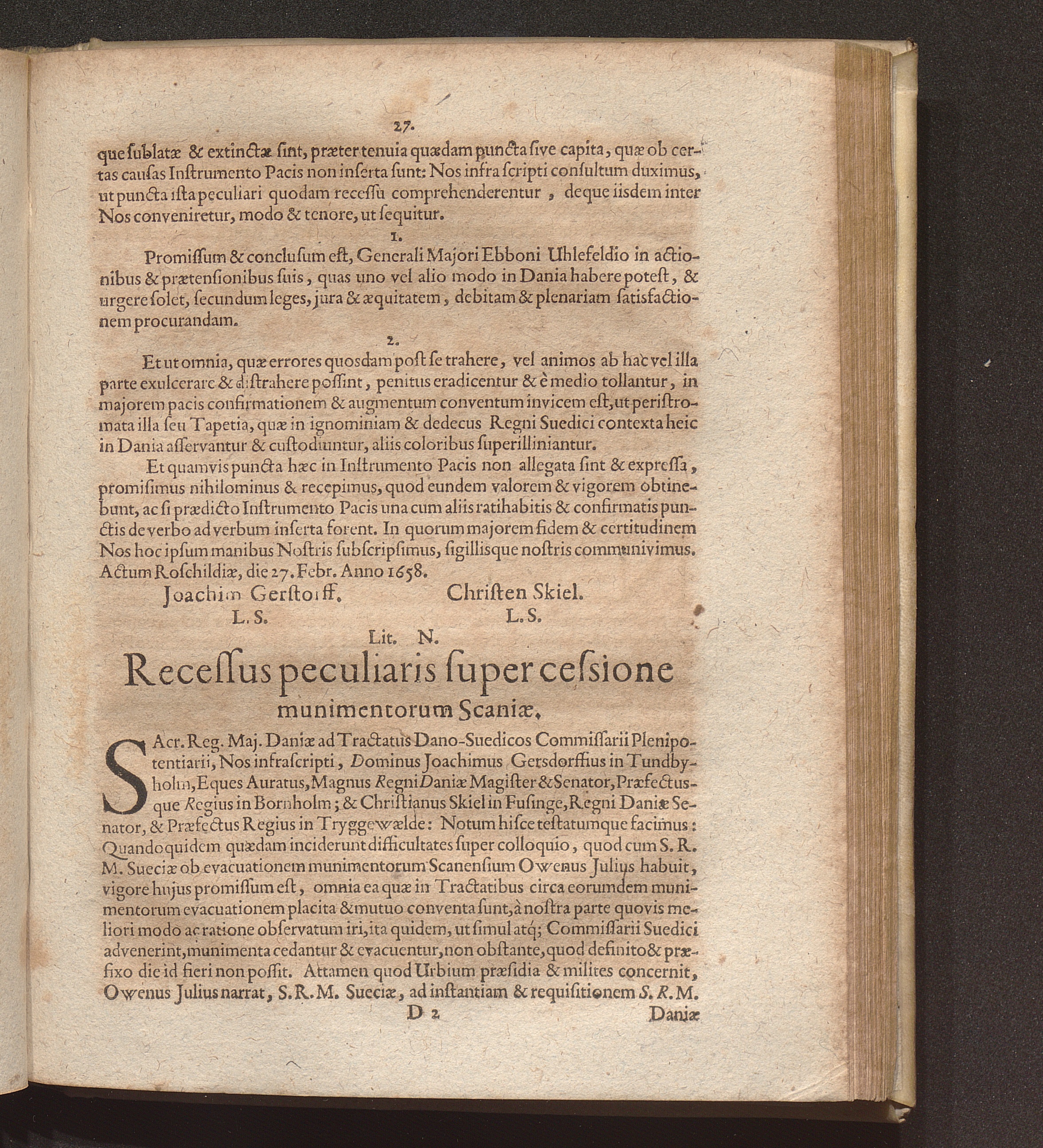Lit. N. Recessus peculiaris super cessione munimentorum Scaniae.