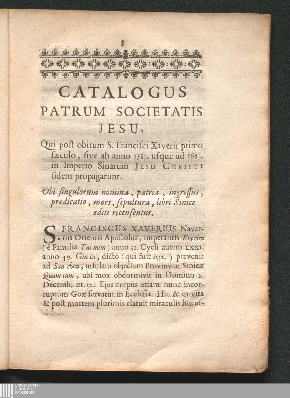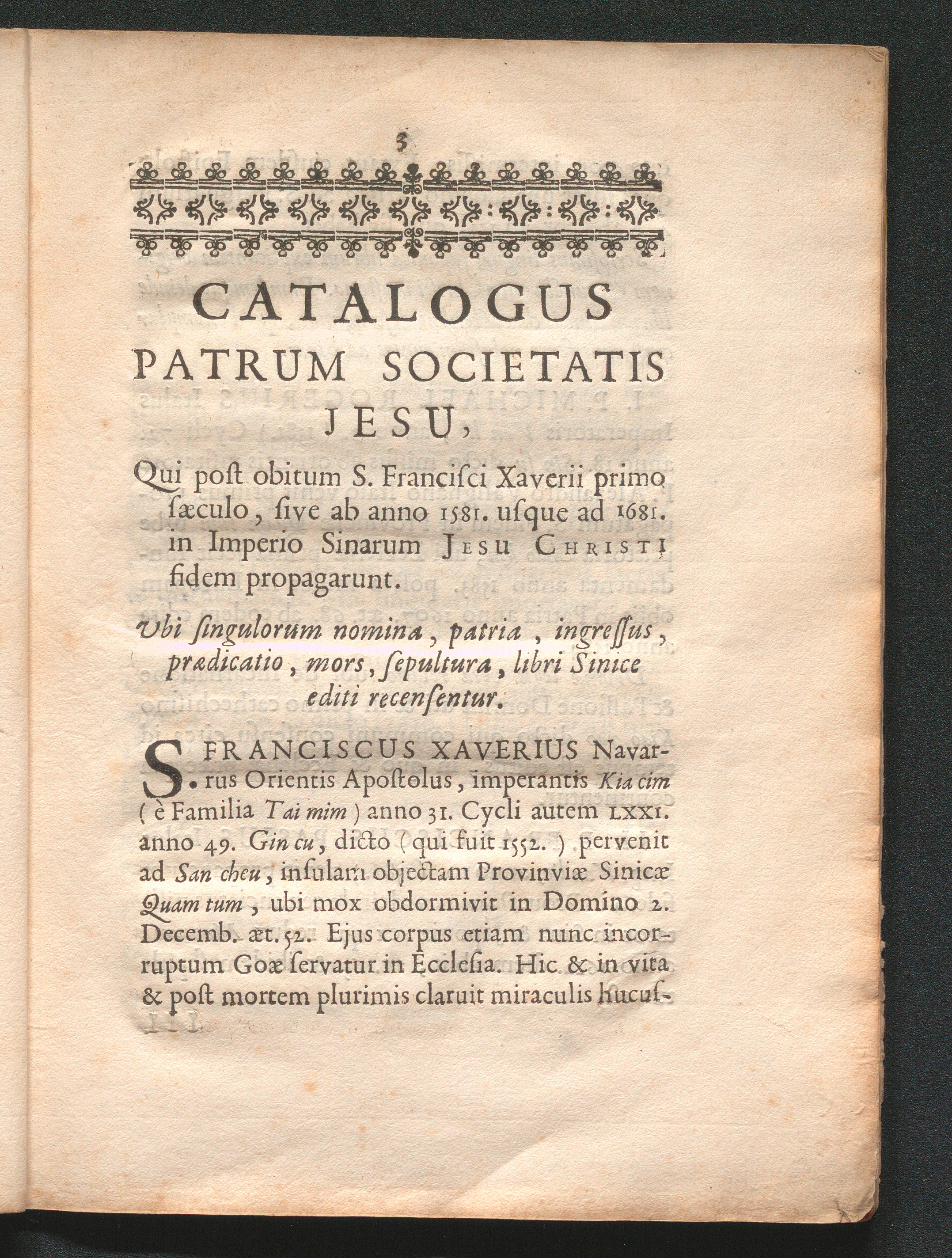 Catalogus Patrum Societatis Jesu : Qui Post Obitum S. Francisci Xaverii primo sæculo, sive ab anno 1581. usque ad 1681. in Imperio Sinarum Jesu-Christi fidem propagarunt. Ubi singulorum nomina, patria, ingressus, prædicatio, mors, sepultura, libri Sinice editi recensentur / [Philippe Couplet]