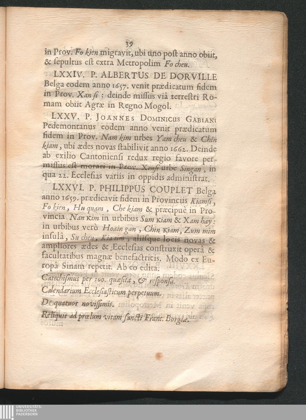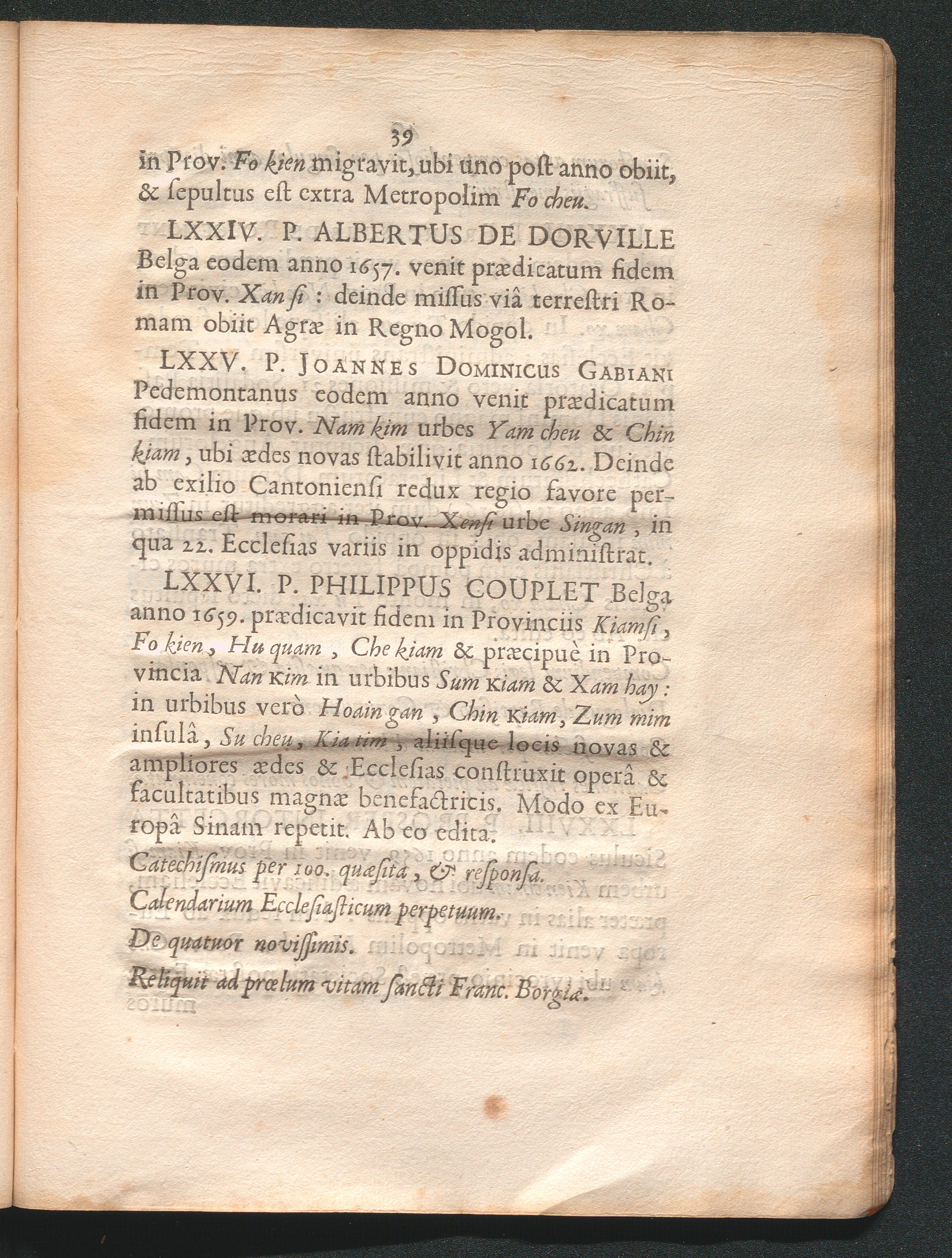 Catalogus Patrum Societatis Jesu : Qui Post Obitum S. Francisci Xaverii primo sæculo, sive ab anno 1581. usque ad 1681. in Imperio Sinarum Jesu-Christi fidem propagarunt. Ubi singulorum nomina, patria, ingressus, prædicatio, mors, sepultura, libri Sinice editi recensentur / [Philippe Couplet]