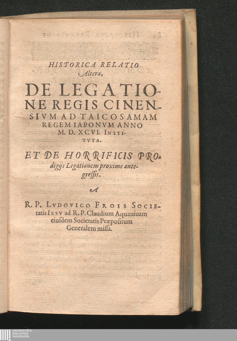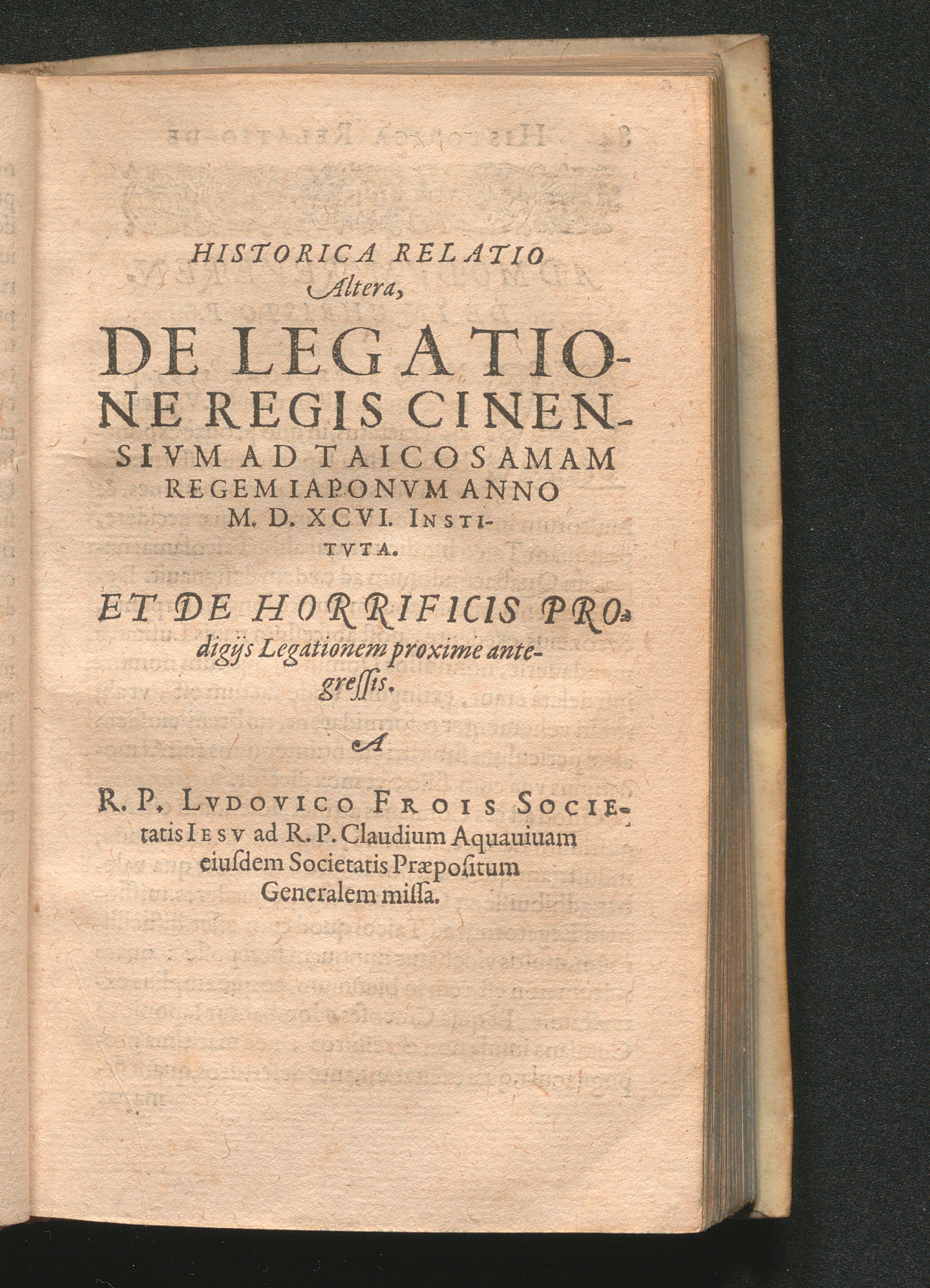 De Rebvs Iaponicis// Historica// Relatio, : Ea-//Qve Triplex: I. De gloriosa morte 26. cruxifixorum.// II. De Legatione Regis Chinensium ad Regem Iapo-//niae, [et] de Prodigiis legationem antegressis.// III. De rebus per Iaponiam anno 1596. a P.P. Soc.// IESV durante persecutione gestis / A R.P. Lvdovico Frois Societatis Iesv, Ad R.P. Clavdivm Aquauiuam eiusdem Societatis Praepositum Generalem missa: Et Ex Italico Idiomate Moguntiae in Latinam linguam translata