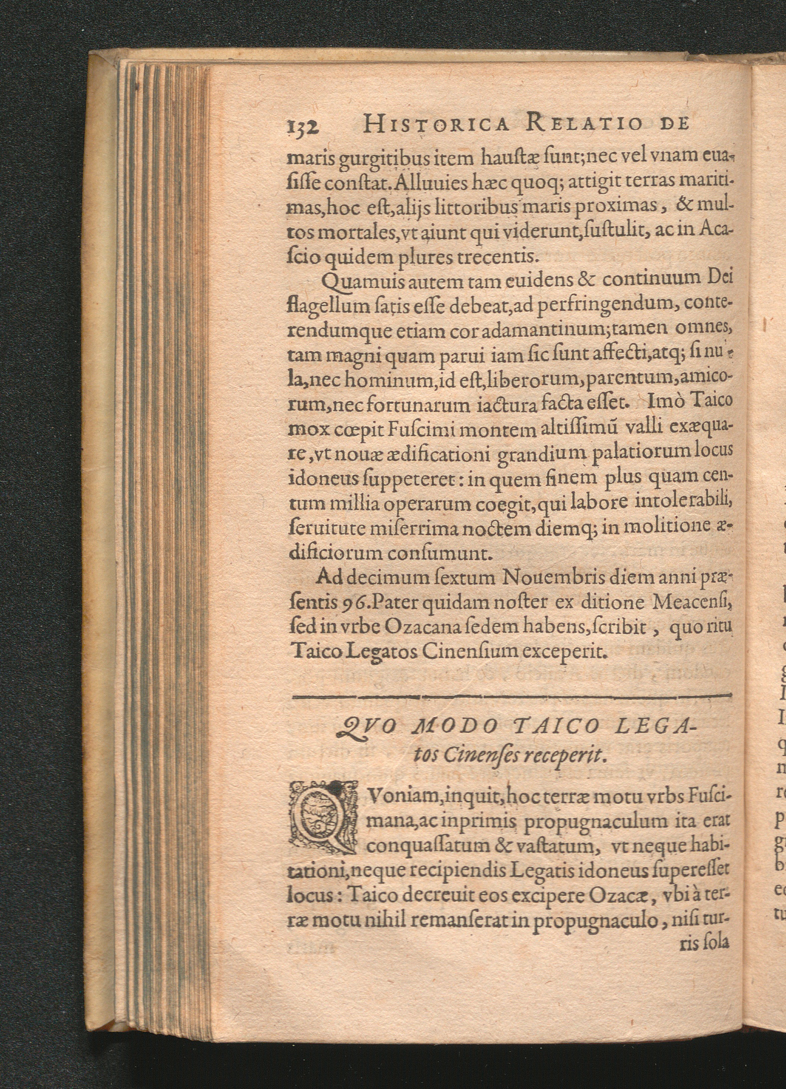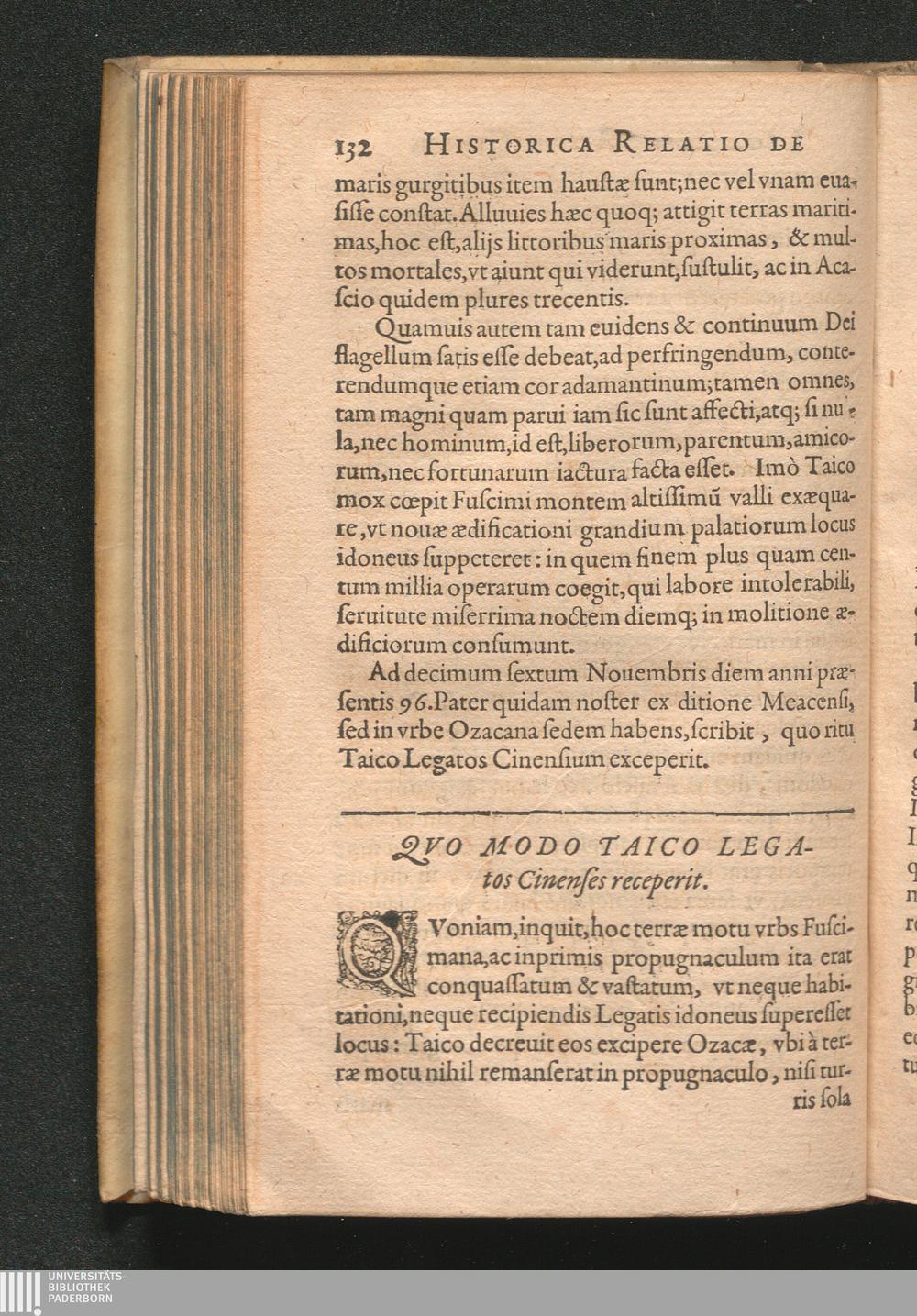 De Rebvs Iaponicis// Historica// Relatio, : Ea-//Qve Triplex: I. De gloriosa morte 26. cruxifixorum.// II. De Legatione Regis Chinensium ad Regem Iapo-//niae, [et] de Prodigiis legationem antegressis.// III. De rebus per Iaponiam anno 1596. a P.P. Soc.// IESV durante persecutione gestis / A R.P. Lvdovico Frois Societatis Iesv, Ad R.P. Clavdivm Aquauiuam eiusdem Societatis Praepositum Generalem missa: Et Ex Italico Idiomate Moguntiae in Latinam linguam translata