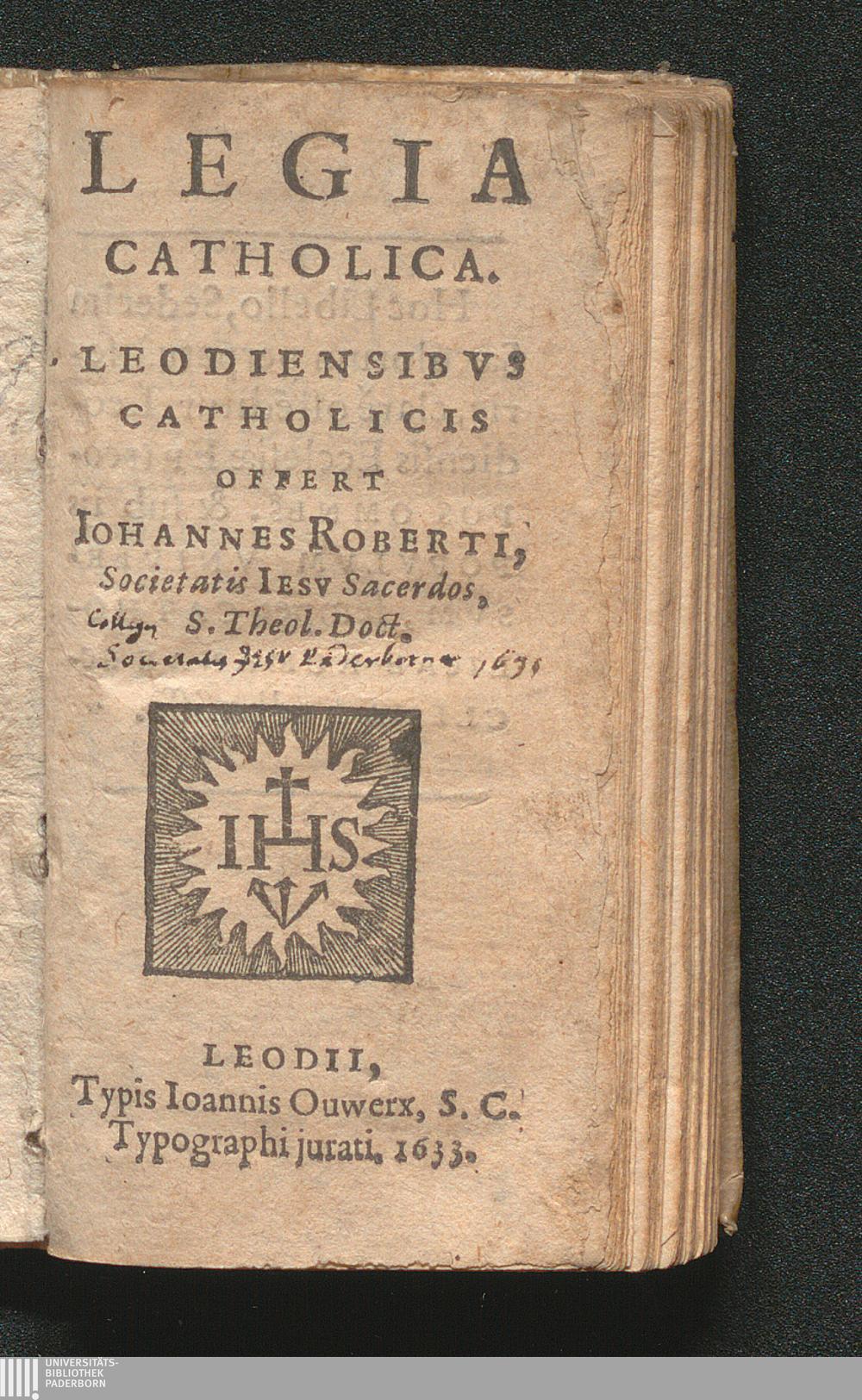 Legia Catholica : Leodiensibvs Catholicis / Offert Iohannes Roberti, Societatis Iesv Sacerdos, S. Theol. Doct.