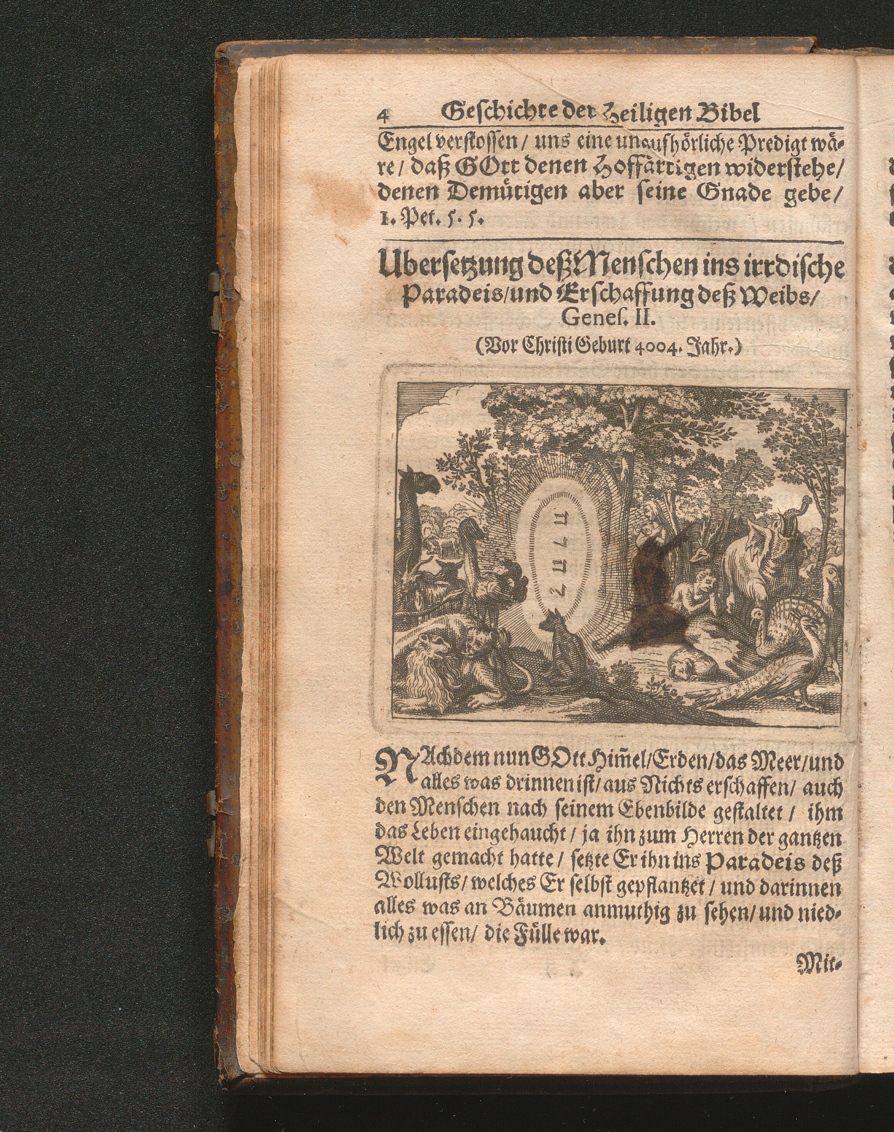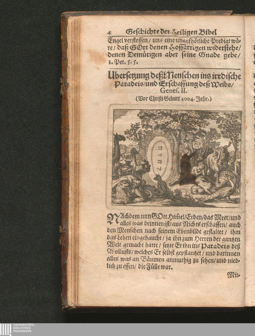 Catholischer Geschicht-Spiegel : Das ist: Historischer Auszug aller Begebenheiten Altes und Neuen Testaments/ mit erbaulichen und Lehrreichen Auslegungen der Heiligen Kirchen-Vätter untermengt; Zur Beförderung Göttlicher Erkandtnuß und Ausbreitung beydes der Macht- und Gnaden-Wercke deß Allerhöchsten/ sowol auf eine anmuhtige Erzehl- als Erklärungs-Art eingerichtet / Anfangs in Frantzösischer Sprach beschrieben durch Herrn de Royaumont, Priorn von Sombreval. Anitzo aber in die Hochteutsche reinlich überbracht durch M. K.