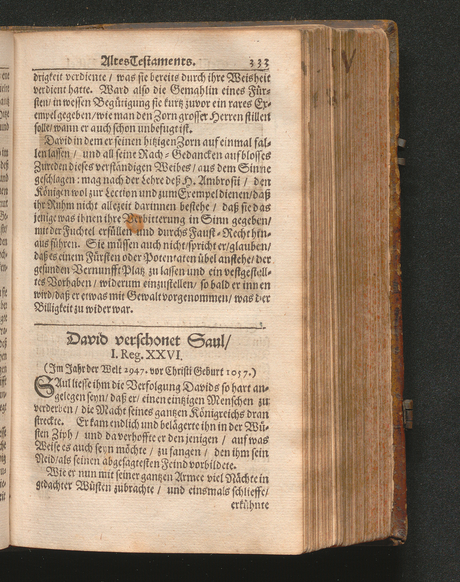 Catholischer Geschicht-Spiegel : Das ist: Historischer Auszug aller Begebenheiten Altes und Neuen Testaments/ mit erbaulichen und Lehrreichen Auslegungen der Heiligen Kirchen-Vätter untermengt; Zur Beförderung Göttlicher Erkandtnuß und Ausbreitung beydes der Macht- und Gnaden-Wercke deß Allerhöchsten/ sowol auf eine anmuhtige Erzehl- als Erklärungs-Art eingerichtet / Anfangs in Frantzösischer Sprach beschrieben durch Herrn de Royaumont, Priorn von Sombreval. Anitzo aber in die Hochteutsche reinlich überbracht durch M. K.