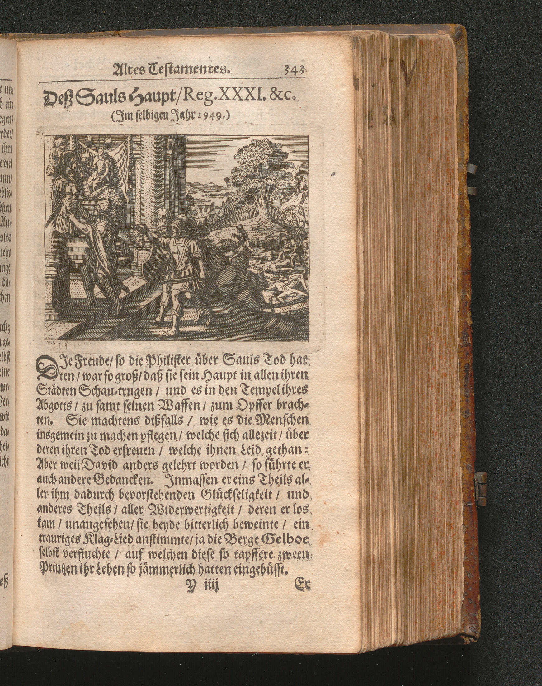 Catholischer Geschicht-Spiegel : Das ist: Historischer Auszug aller Begebenheiten Altes und Neuen Testaments/ mit erbaulichen und Lehrreichen Auslegungen der Heiligen Kirchen-Vätter untermengt; Zur Beförderung Göttlicher Erkandtnuß und Ausbreitung beydes der Macht- und Gnaden-Wercke deß Allerhöchsten/ sowol auf eine anmuhtige Erzehl- als Erklärungs-Art eingerichtet / Anfangs in Frantzösischer Sprach beschrieben durch Herrn de Royaumont, Priorn von Sombreval. Anitzo aber in die Hochteutsche reinlich überbracht durch M. K.