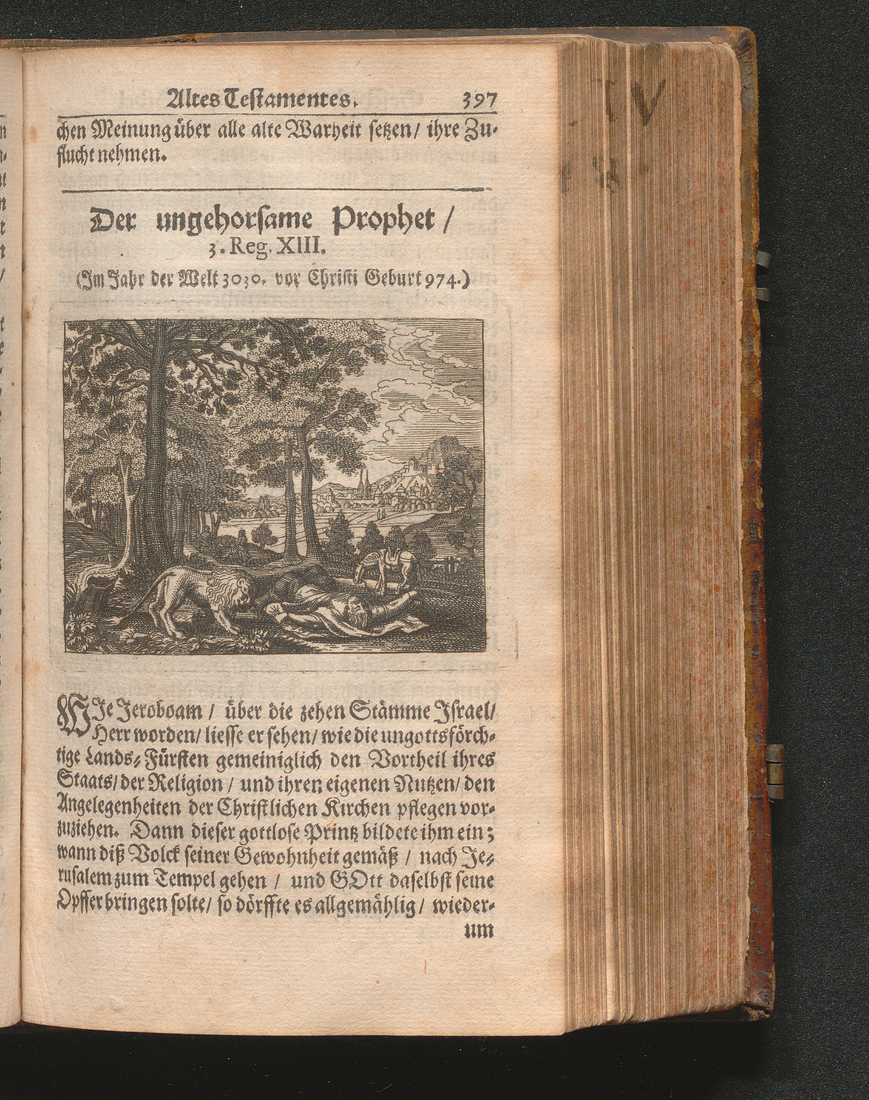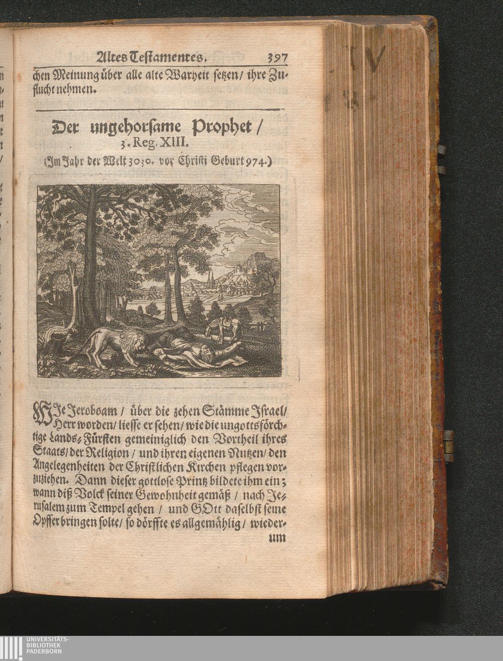 Catholischer Geschicht-Spiegel : Das ist: Historischer Auszug aller Begebenheiten Altes und Neuen Testaments/ mit erbaulichen und Lehrreichen Auslegungen der Heiligen Kirchen-Vätter untermengt; Zur Beförderung Göttlicher Erkandtnuß und Ausbreitung beydes der Macht- und Gnaden-Wercke deß Allerhöchsten/ sowol auf eine anmuhtige Erzehl- als Erklärungs-Art eingerichtet / Anfangs in Frantzösischer Sprach beschrieben durch Herrn de Royaumont, Priorn von Sombreval. Anitzo aber in die Hochteutsche reinlich überbracht durch M. K.