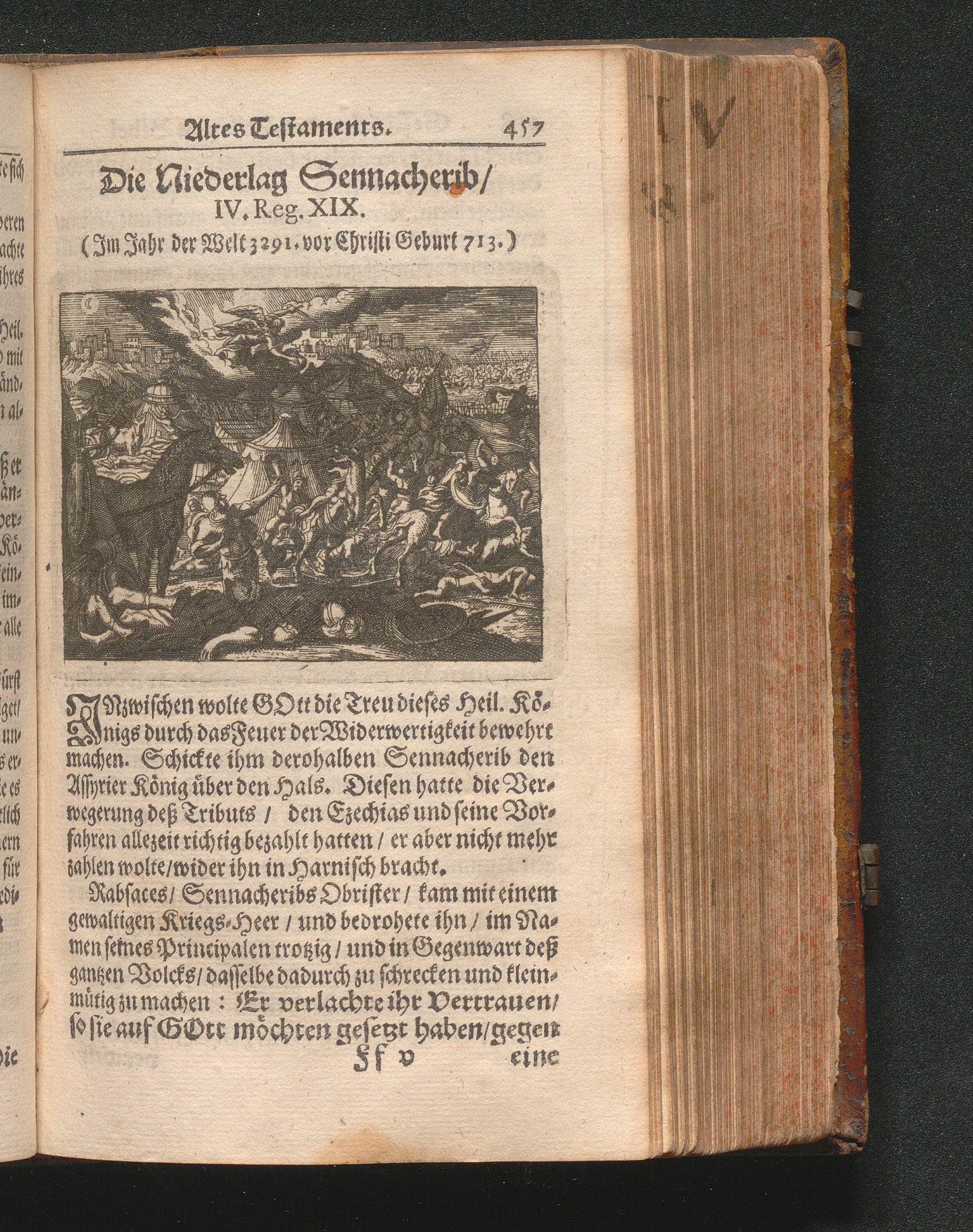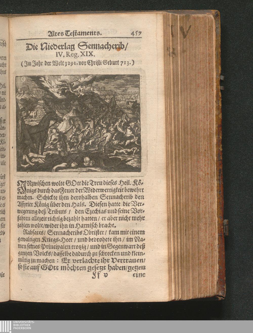 Catholischer Geschicht-Spiegel : Das ist: Historischer Auszug aller Begebenheiten Altes und Neuen Testaments/ mit erbaulichen und Lehrreichen Auslegungen der Heiligen Kirchen-Vätter untermengt; Zur Beförderung Göttlicher Erkandtnuß und Ausbreitung beydes der Macht- und Gnaden-Wercke deß Allerhöchsten/ sowol auf eine anmuhtige Erzehl- als Erklärungs-Art eingerichtet / Anfangs in Frantzösischer Sprach beschrieben durch Herrn de Royaumont, Priorn von Sombreval. Anitzo aber in die Hochteutsche reinlich überbracht durch M. K.