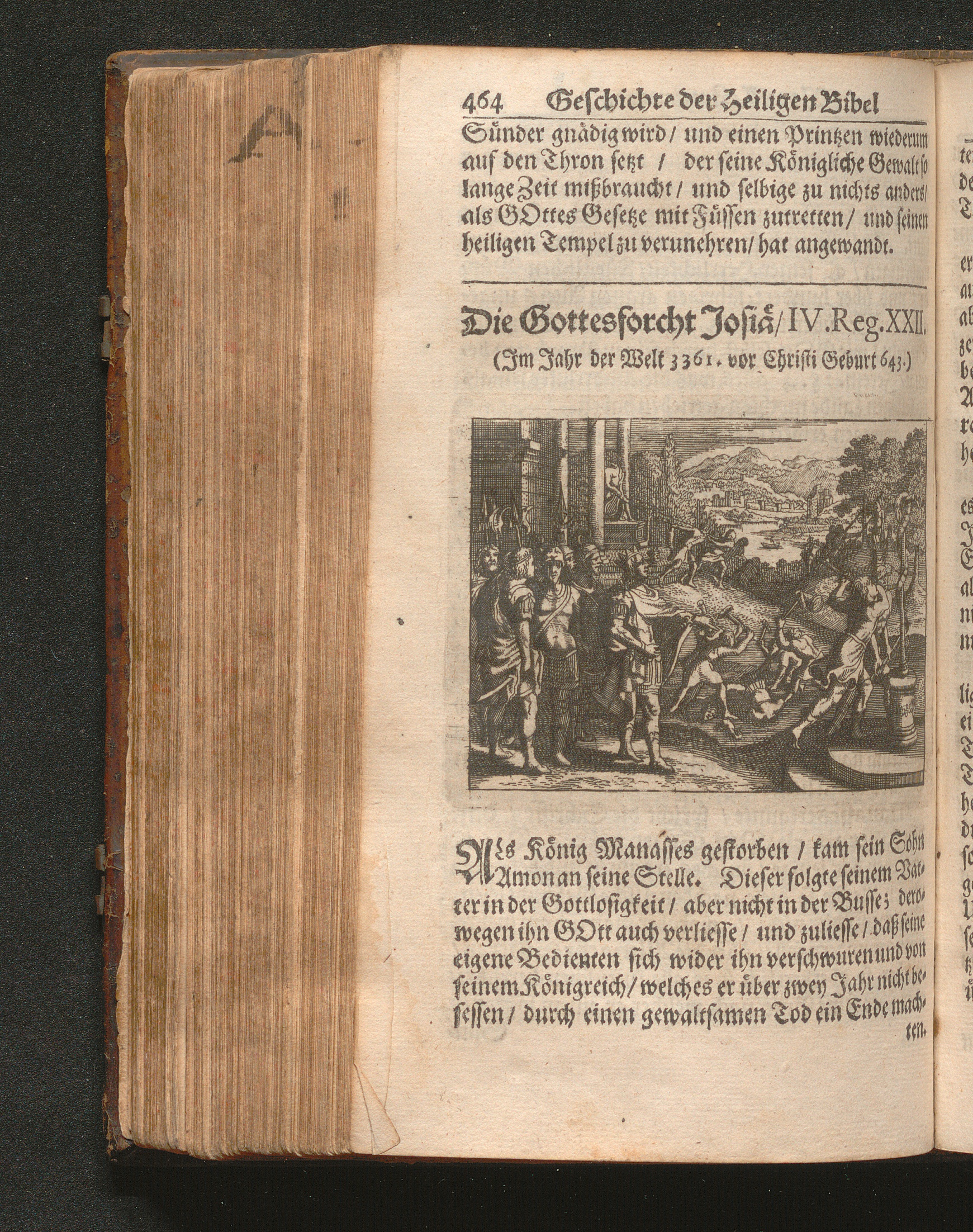 Catholischer Geschicht-Spiegel : Das ist: Historischer Auszug aller Begebenheiten Altes und Neuen Testaments/ mit erbaulichen und Lehrreichen Auslegungen der Heiligen Kirchen-Vätter untermengt; Zur Beförderung Göttlicher Erkandtnuß und Ausbreitung beydes der Macht- und Gnaden-Wercke deß Allerhöchsten/ sowol auf eine anmuhtige Erzehl- als Erklärungs-Art eingerichtet / Anfangs in Frantzösischer Sprach beschrieben durch Herrn de Royaumont, Priorn von Sombreval. Anitzo aber in die Hochteutsche reinlich überbracht durch M. K.