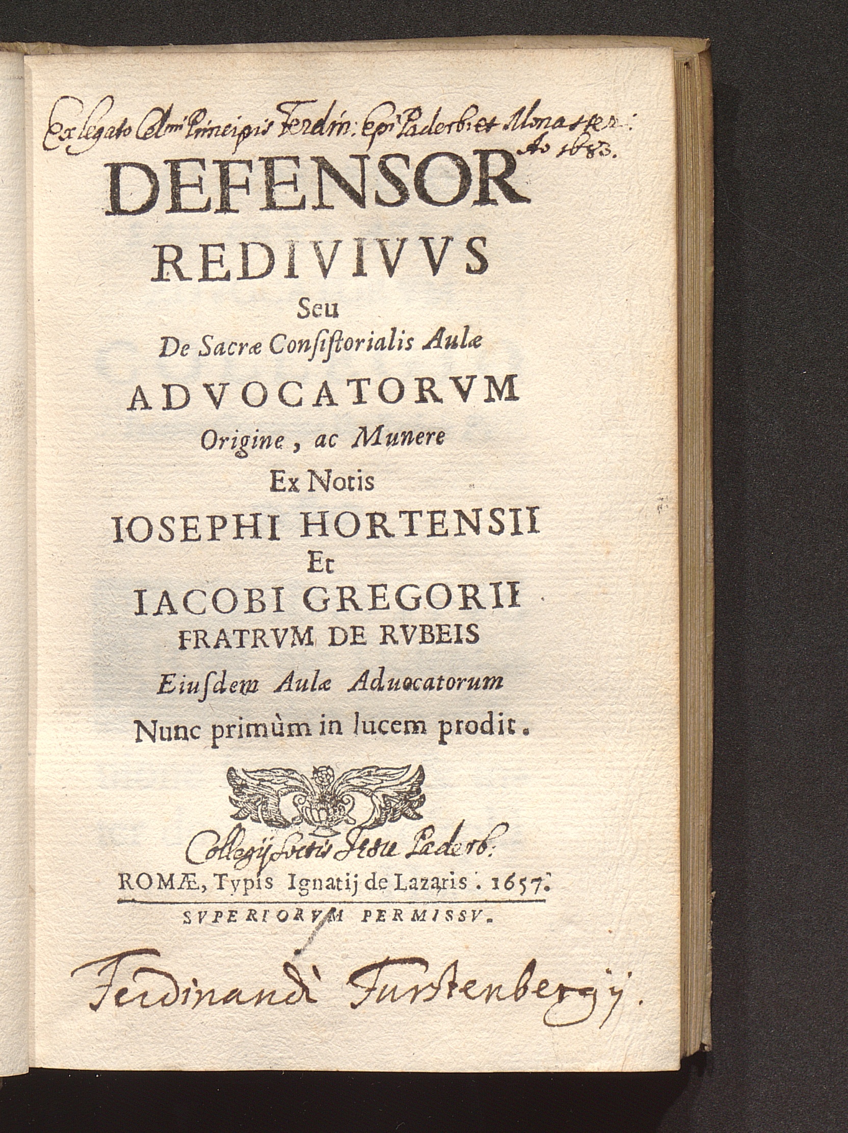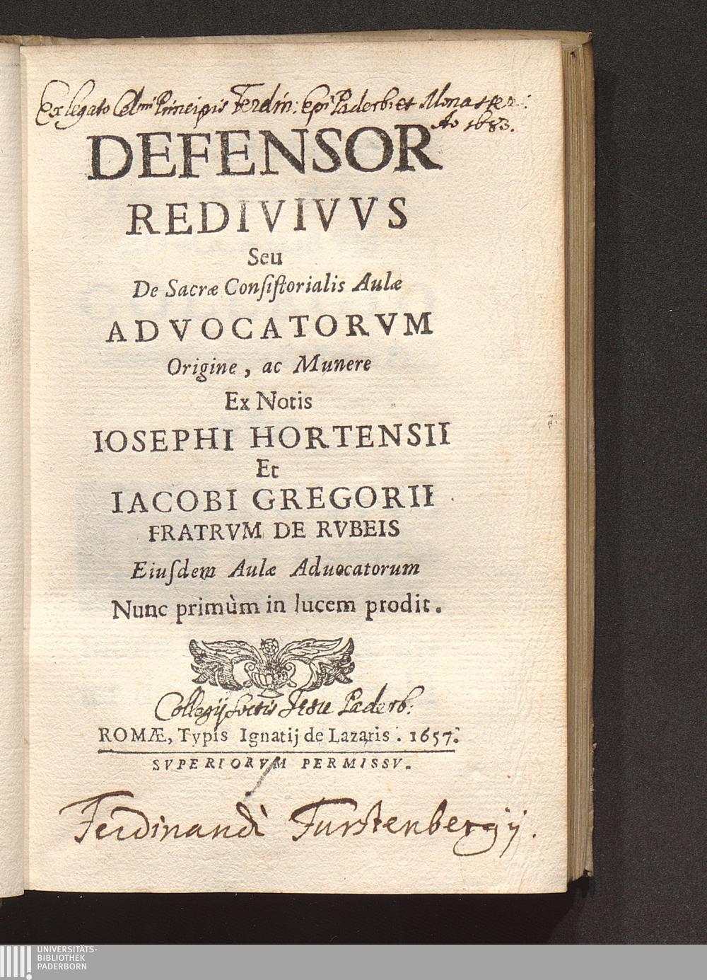 Defensor Redivivvs Seu De Sacrae Consistorialis Aulae Advocatorvm Origine, ac Munere / Ex Notis Iosephi Hortensii Et Iacobi Gregorii Fratrvm De Rvbeis Eiusdem Aulae Aduocatorum
