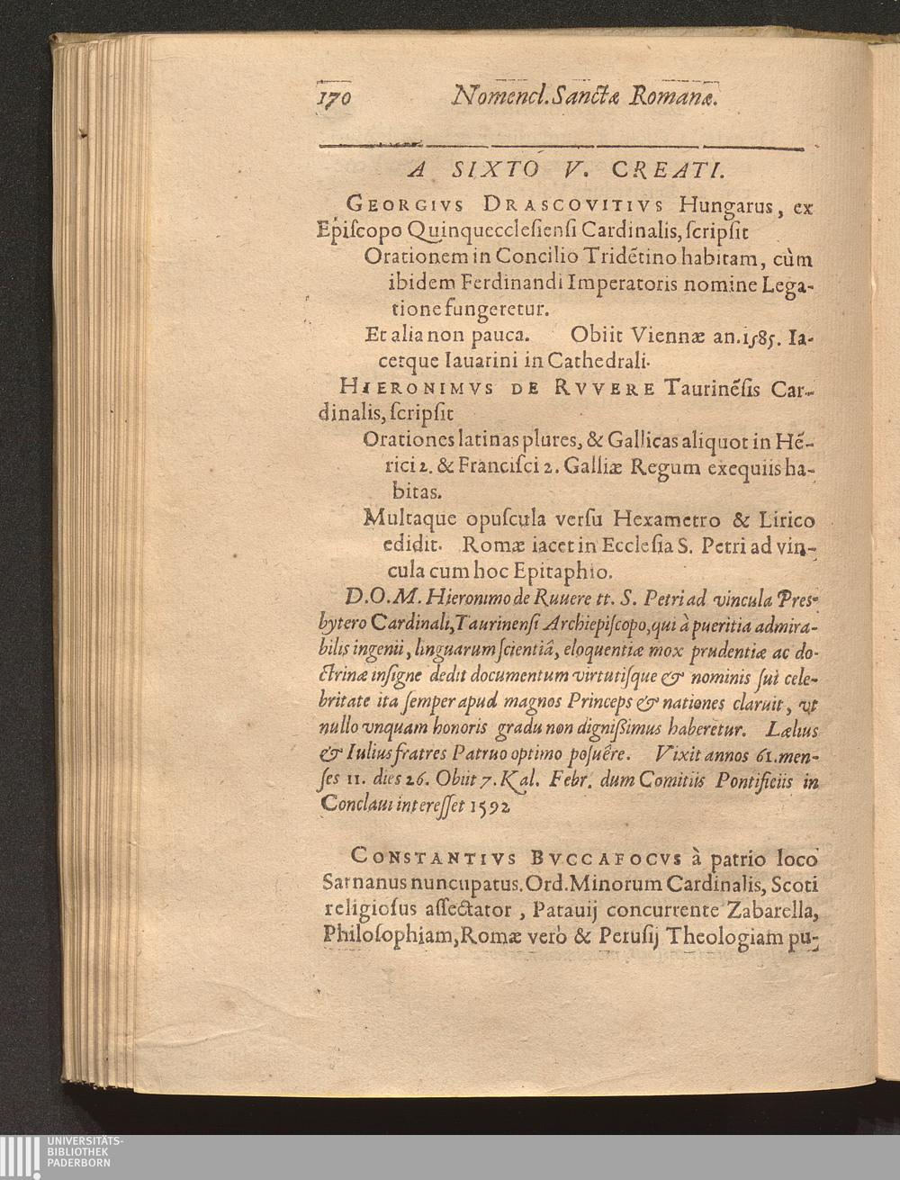 Nomenclator Sanctae Romanae Ecclesiae Cardinalivm Qvi Ab Anno Christi Millesimo quippiam commentati sunt, Sev Ab Eo Tempore quo Pontificis electione ad eos tantùm ob Romani cleri multitudinem reuocatâ, maximus illis honor (qualem videmus) haberi coeptus est : Accesserunt ad calcem Pontificum & Cardinalium Epitaphia supra ducenta, quae Alphonsi Ciaconi libro de Pontificum gestis appositè interseri operae est / [Verf.: Henri-Louis Chasteigner de la Rocheposay]