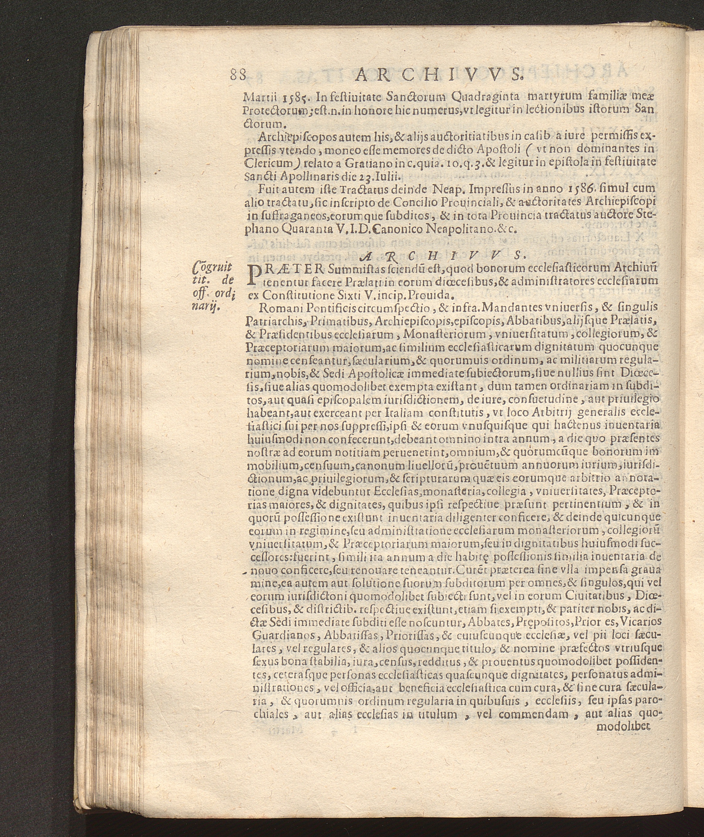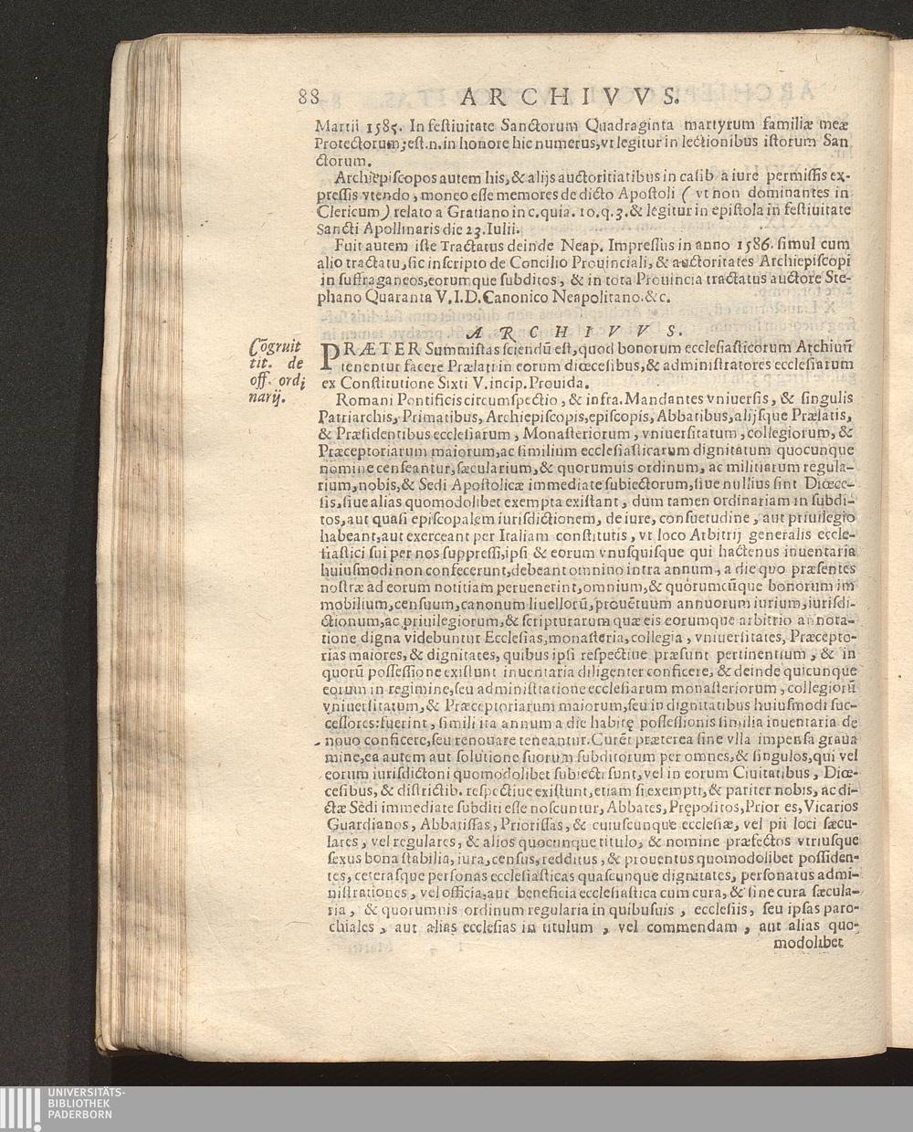 Svmma Bvllarii Earvmve Svmmorvm Pontificvm Constitvtionvm Qvae Ad Commvnem Ecclesiae Vsvm post volumina Iuris Canonicis, vsq[ue] ad Sanctissimum D. N. D. Pavlvm Papam V. emanarunt : Et vltra proximioris editionis Constitutiones Apostolicas, & Additiones denuo adauctas, in hac postrema appositae sunt ipsiusmet Auctoris aliae quam plures, quae amplius non desiderantur ... Accesserunt etiam quatuor Tractatus Canonici, necnon extrauagantium communium Liber Sextus, & alia prout versa pagina indicabit / Avthore Stephano Qvaranta I. V. D. Canonico, & Iudice Synodali Neapolitano, cum Adnotationibus, & Additionibus eiusdem ... vnà cum Additionibus Prosperi de Avgvstino I. V. D. Presbyteri Neapolitani