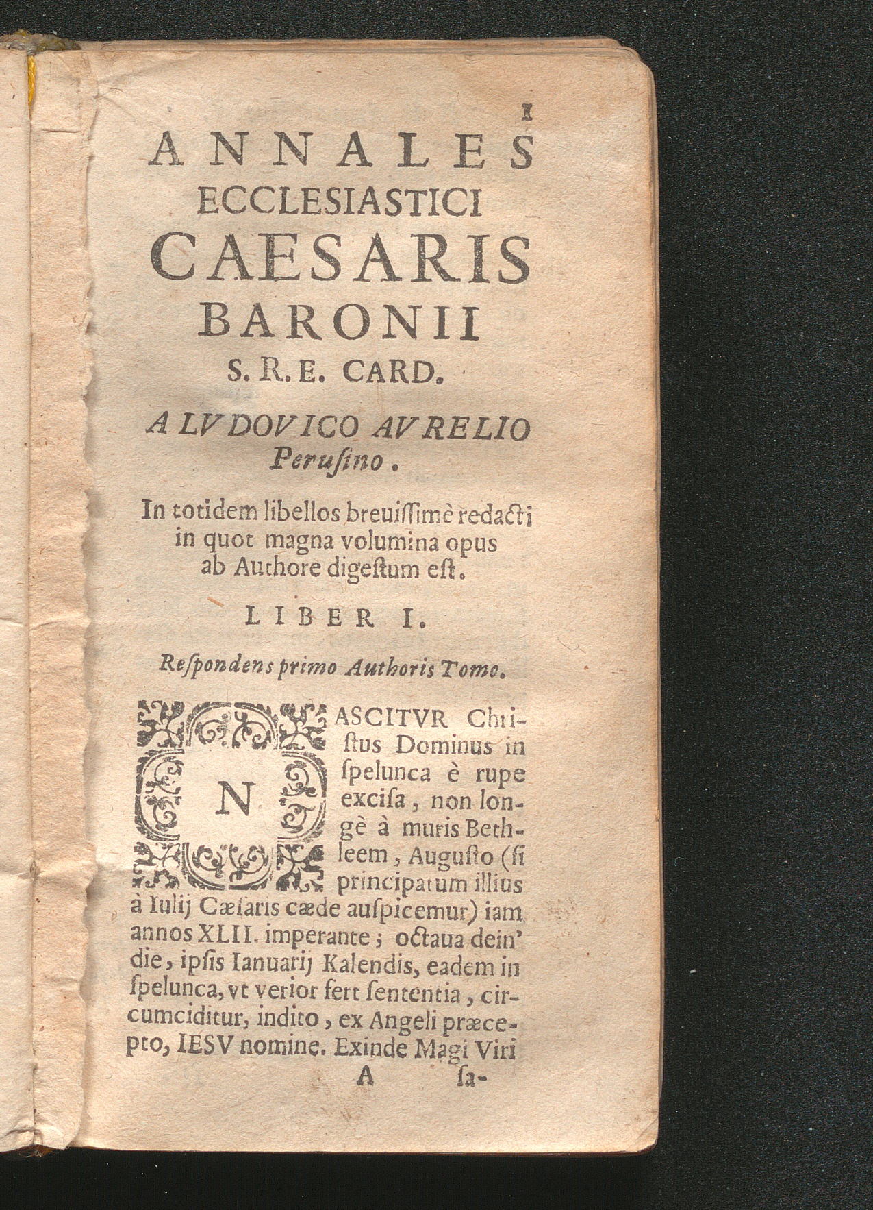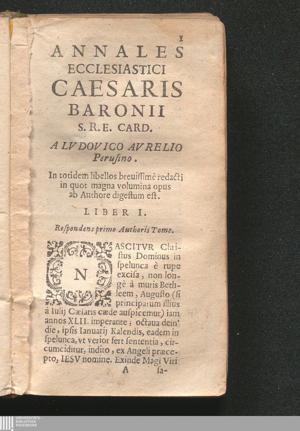 Annales Ecclesiastici Caesaris Baronii S.R.E. Card. A Lvdovico Avrelio Perusino. In totidem libellos breuissimè redacti in quot magna volumina opus ab Authore digestum est. Liber I.