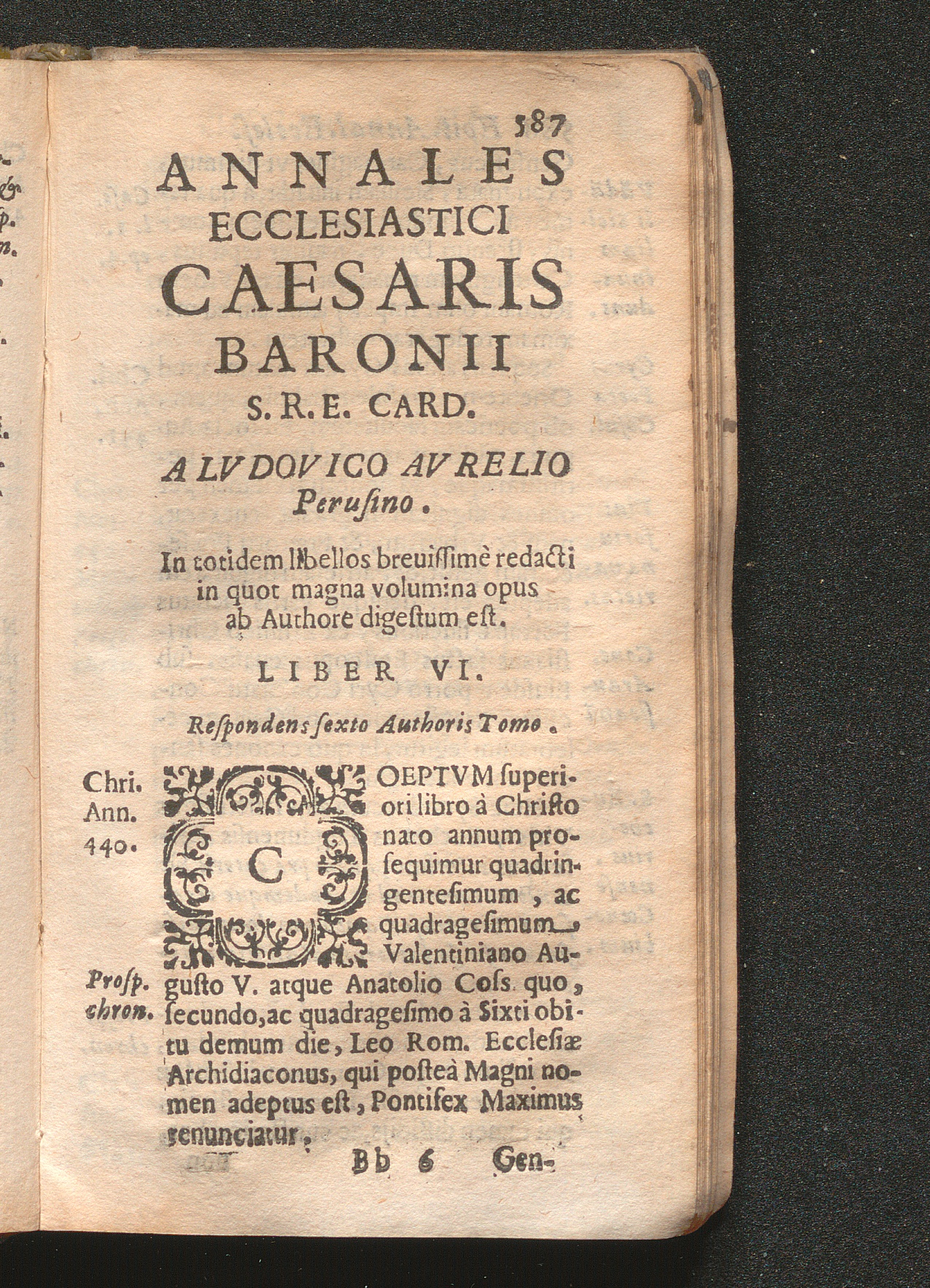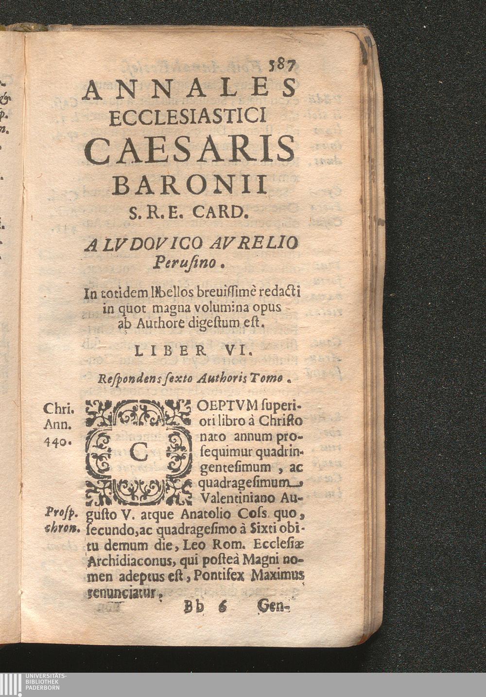 Annales Ecclesiastici Caesaris Baronii S.R.E. Card. A Lvdovico Avrelio Perusino. In totidem libellos breuissimè redacti in quot magna volumina opus ab Authore digestum est. Liber VI.
