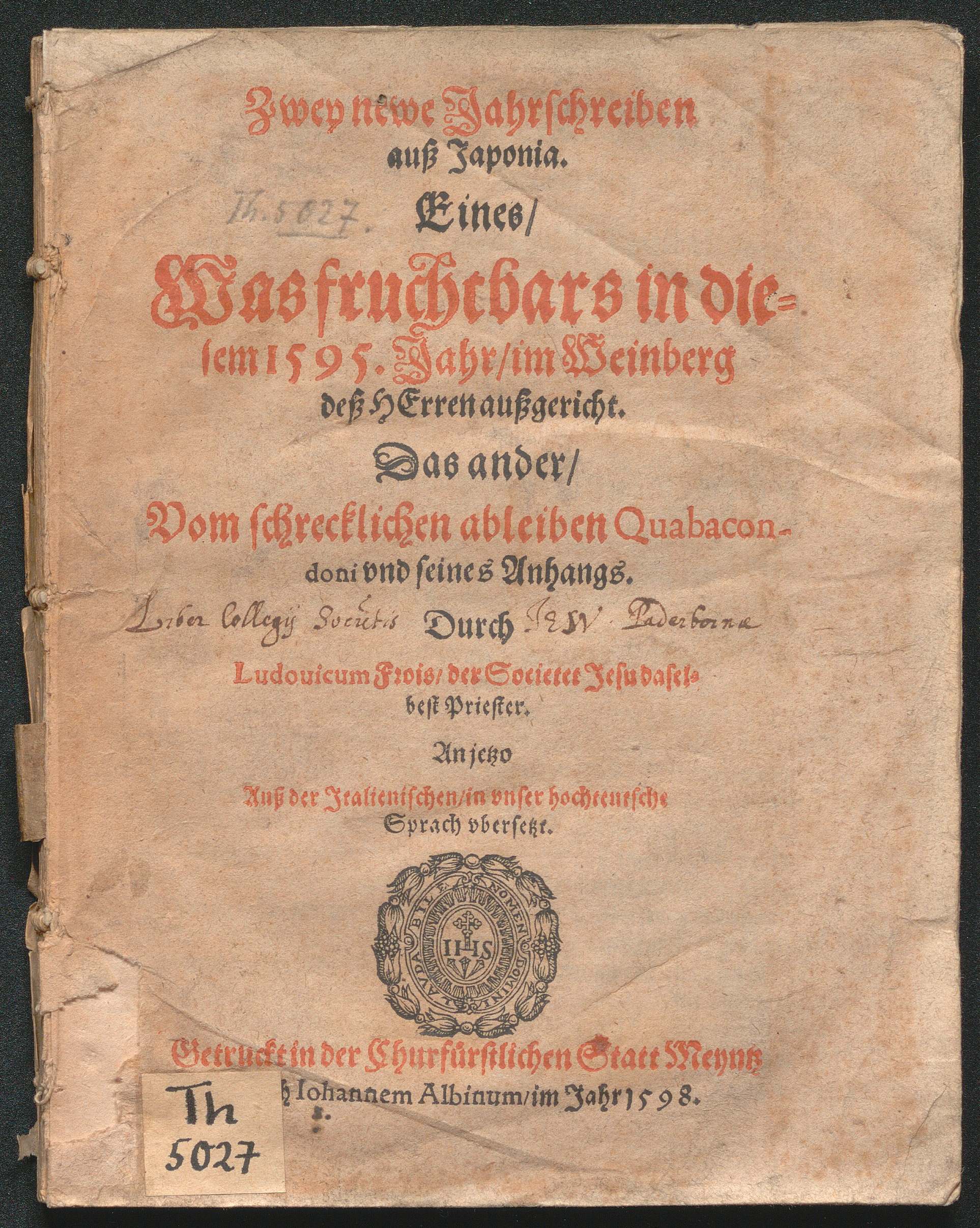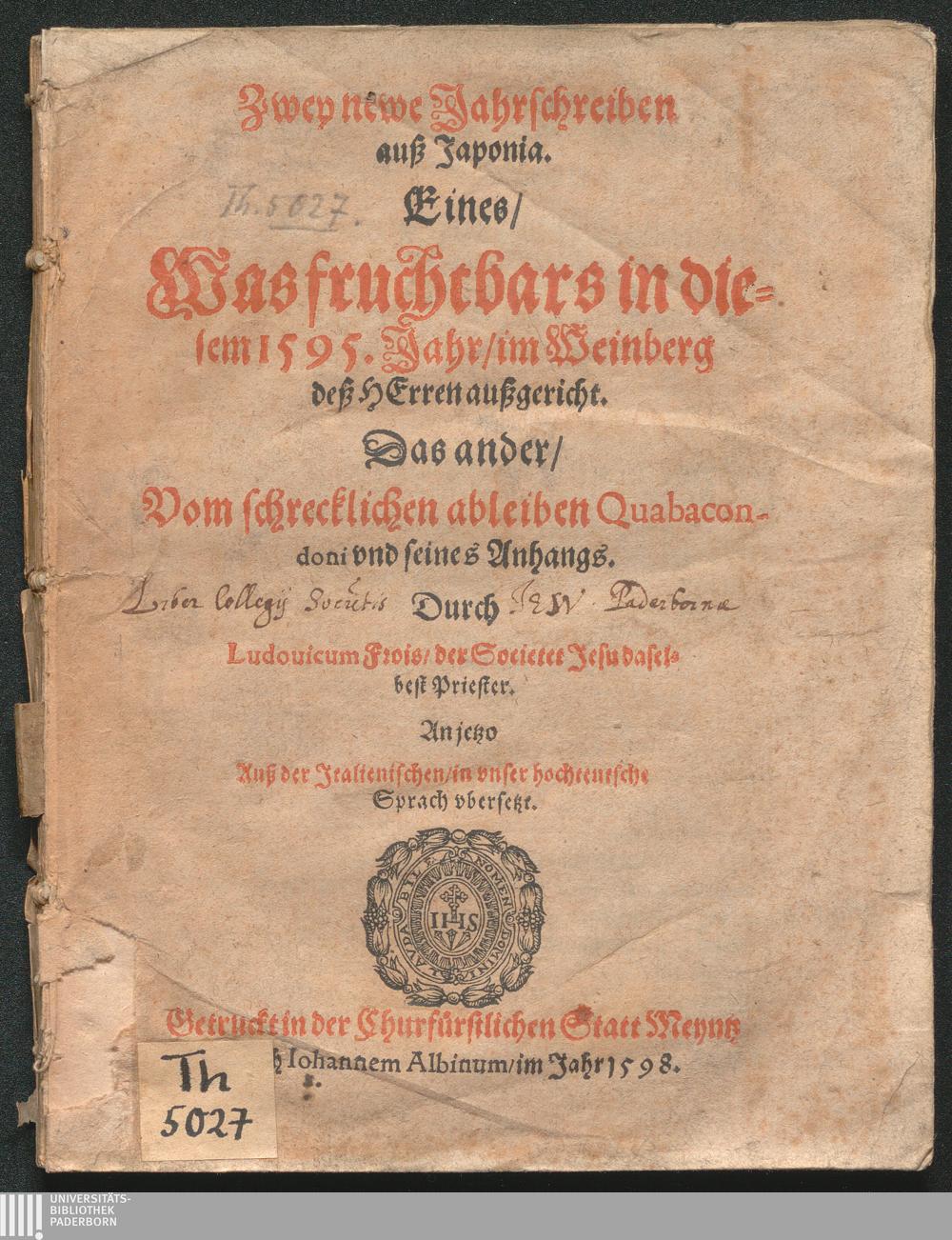 Zwey newe Jahrschreiben auß Japonia : Eines/ Was fruchtbars in diesem 1595. Jahr/ im Weinberg deß Herren außgericht. Das ander/ Vom schrecklichen ableiben Quabacondoni und seines Anhangs / Durch Ludouicum Frois/ der Societet Jesu daselbst Priester. Anjetzo Auß der Jtalienischen/ in vnser hochteutsche Sprach vbersetzt