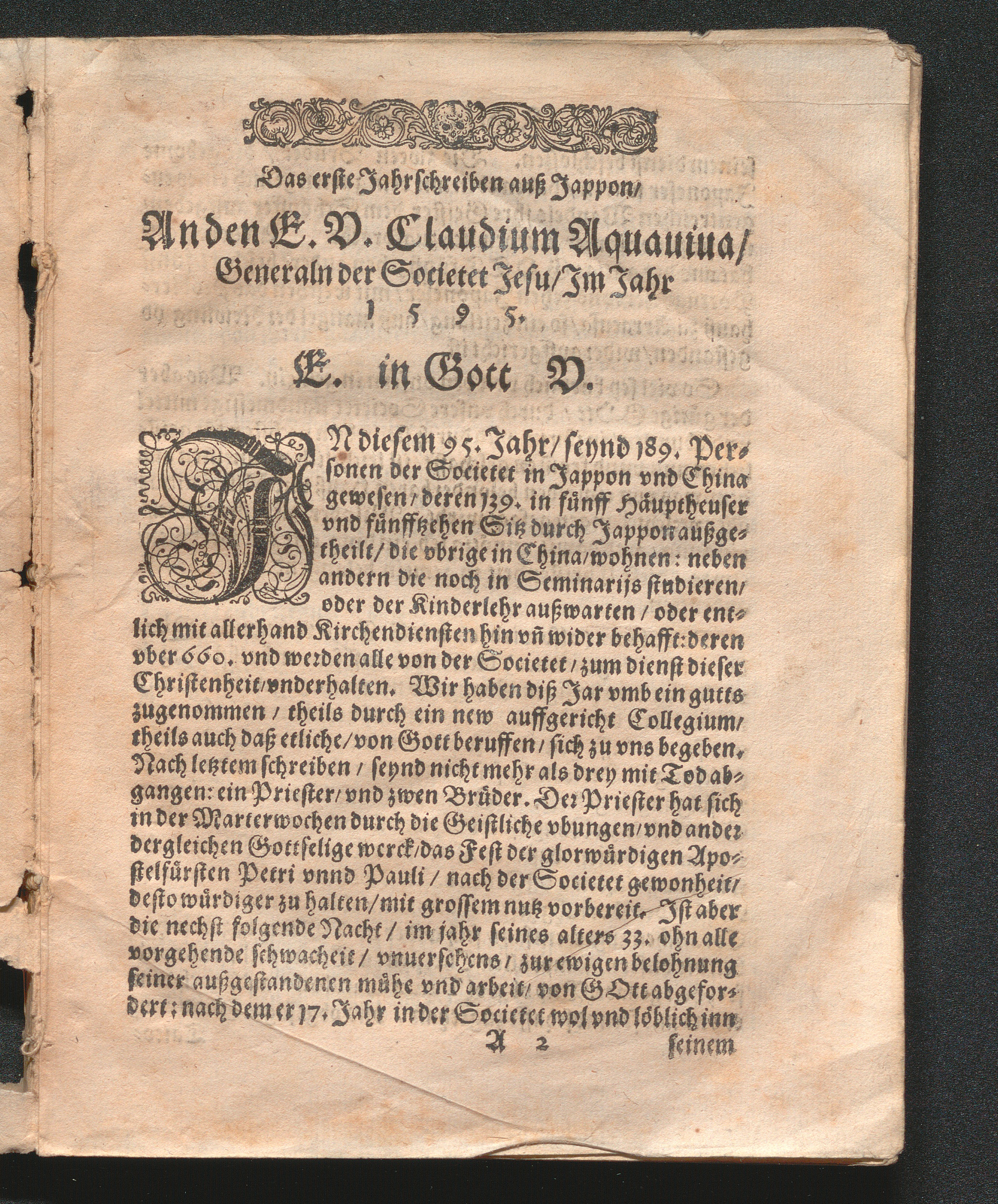 Zwey newe Jahrschreiben auß Japonia : Eines/ Was fruchtbars in diesem 1595. Jahr/ im Weinberg deß Herren außgericht. Das ander/ Vom schrecklichen ableiben Quabacondoni und seines Anhangs / Durch Ludouicum Frois/ der Societet Jesu daselbst Priester. Anjetzo Auß der Jtalienischen/ in vnser hochteutsche Sprach vbersetzt