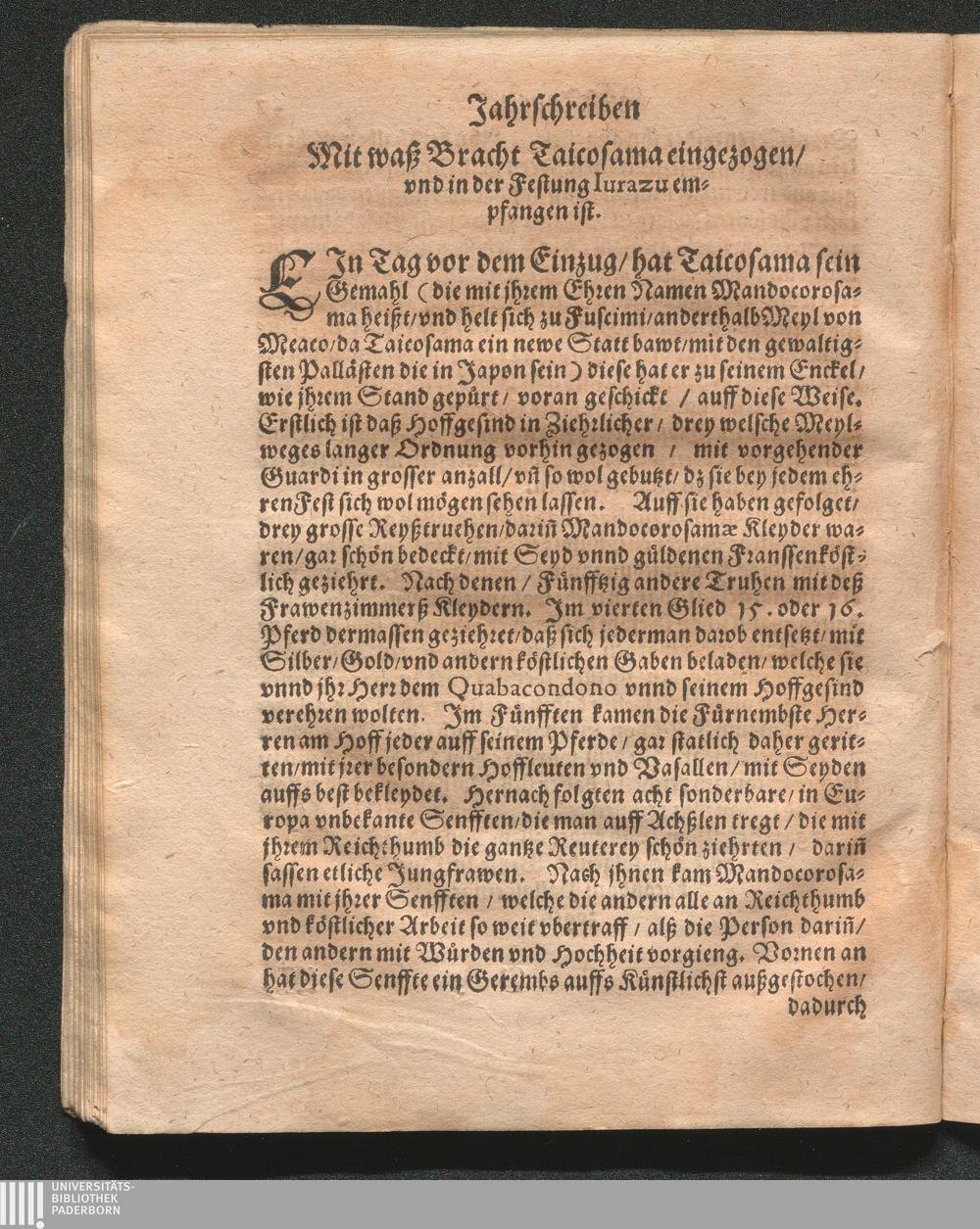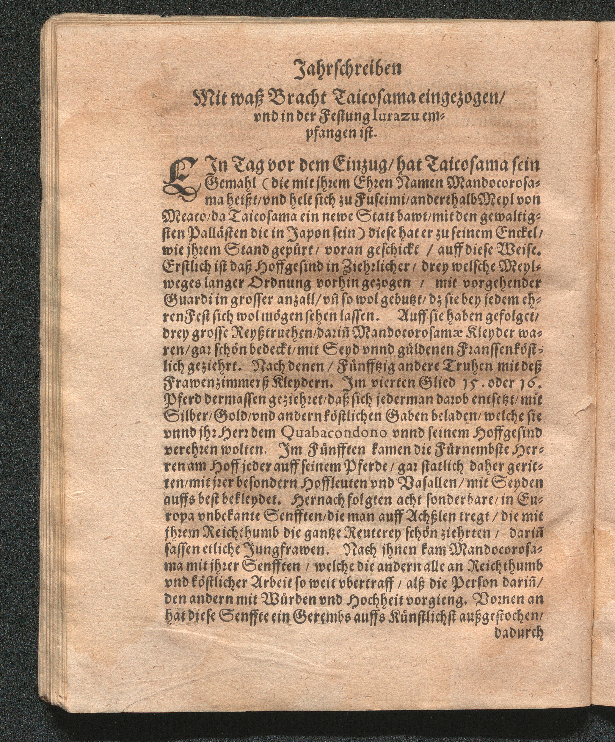 Zwey newe Jahrschreiben auß Japonia : Eines/ Was fruchtbars in diesem 1595. Jahr/ im Weinberg deß Herren außgericht. Das ander/ Vom schrecklichen ableiben Quabacondoni und seines Anhangs / Durch Ludouicum Frois/ der Societet Jesu daselbst Priester. Anjetzo Auß der Jtalienischen/ in vnser hochteutsche Sprach vbersetzt