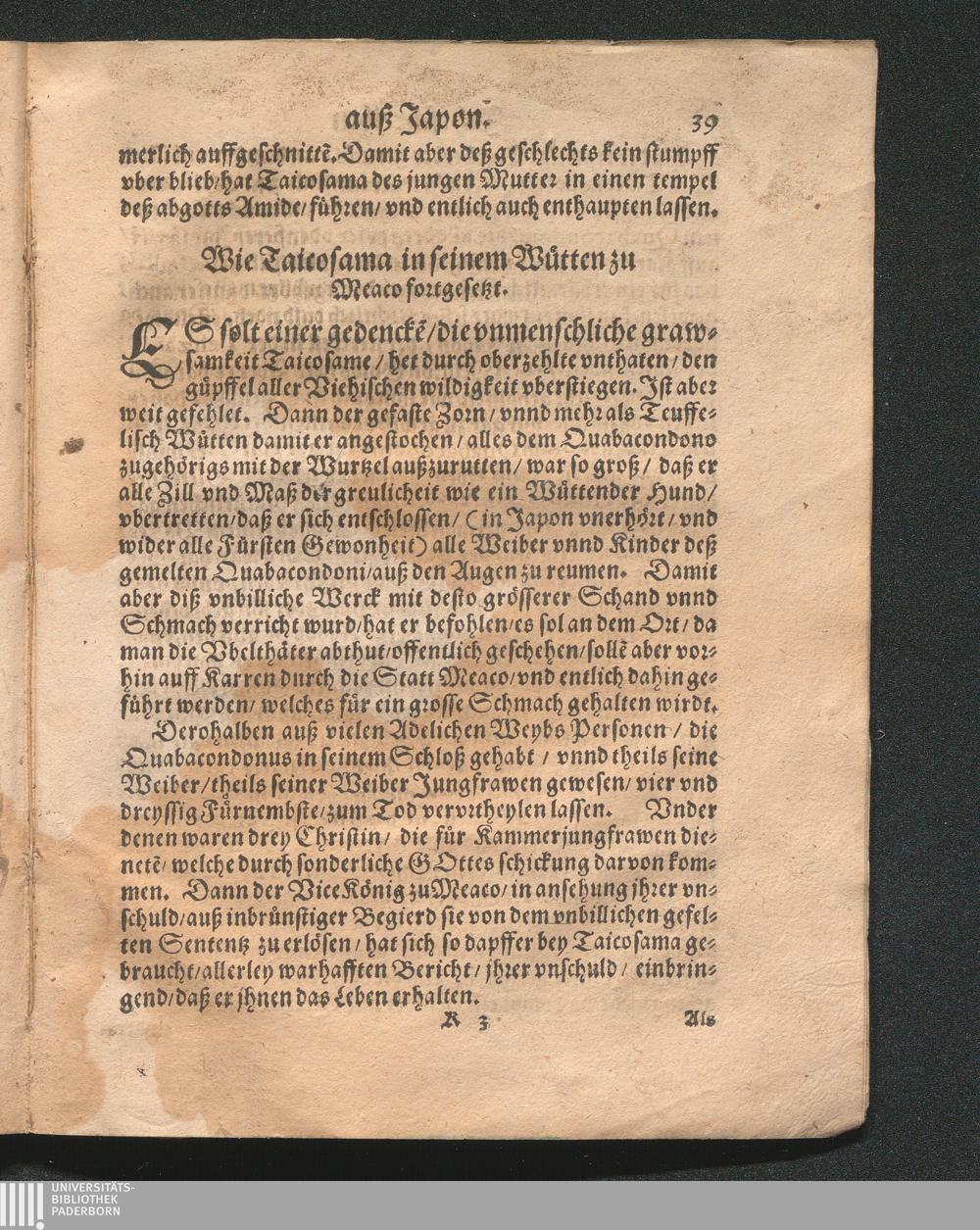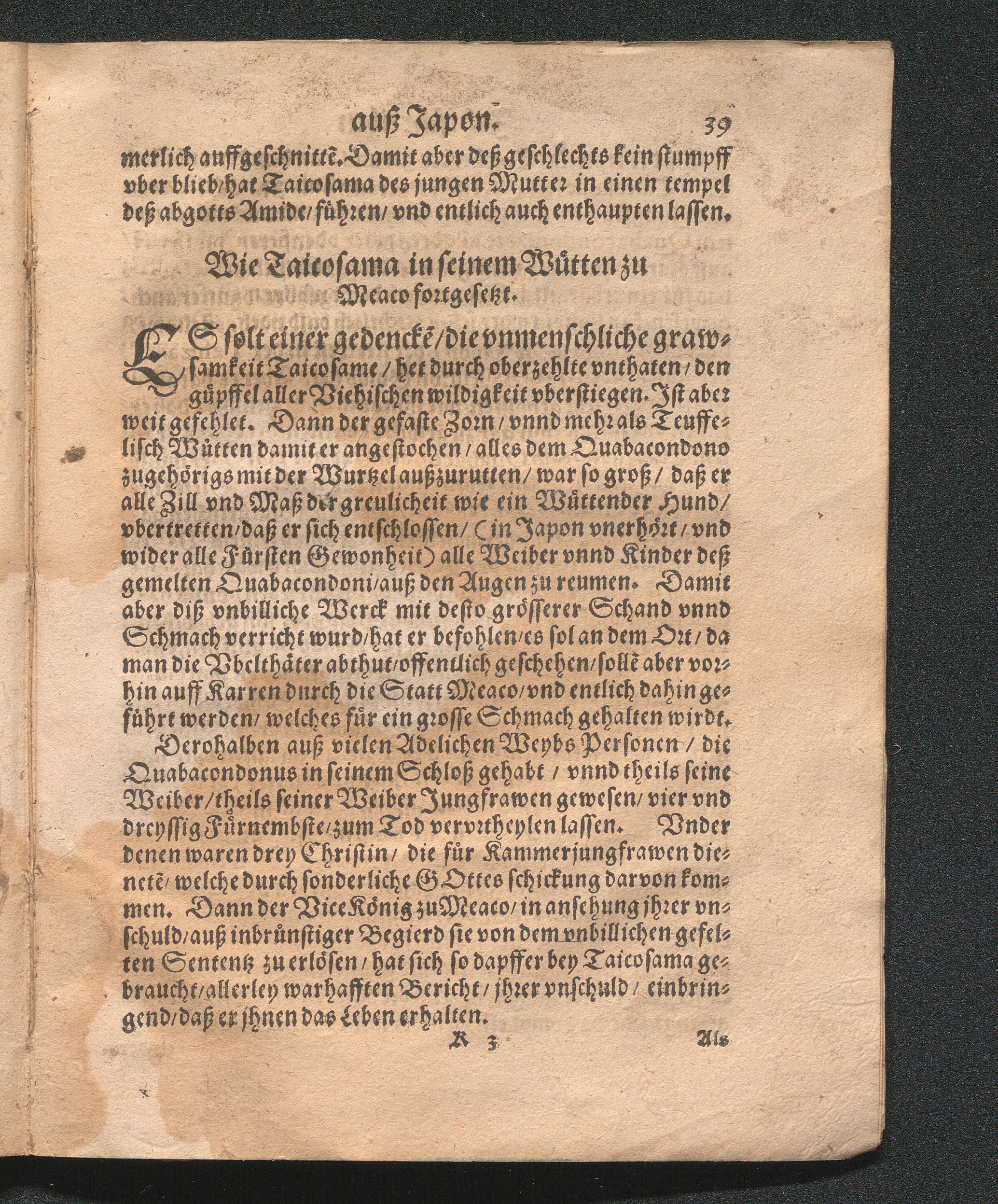 Zwey newe Jahrschreiben auß Japonia : Eines/ Was fruchtbars in diesem 1595. Jahr/ im Weinberg deß Herren außgericht. Das ander/ Vom schrecklichen ableiben Quabacondoni und seines Anhangs / Durch Ludouicum Frois/ der Societet Jesu daselbst Priester. Anjetzo Auß der Jtalienischen/ in vnser hochteutsche Sprach vbersetzt