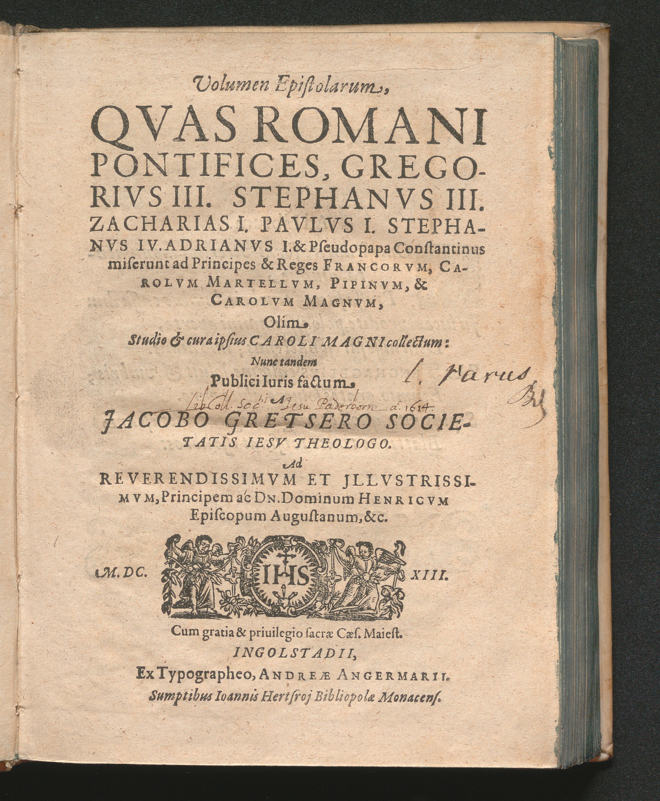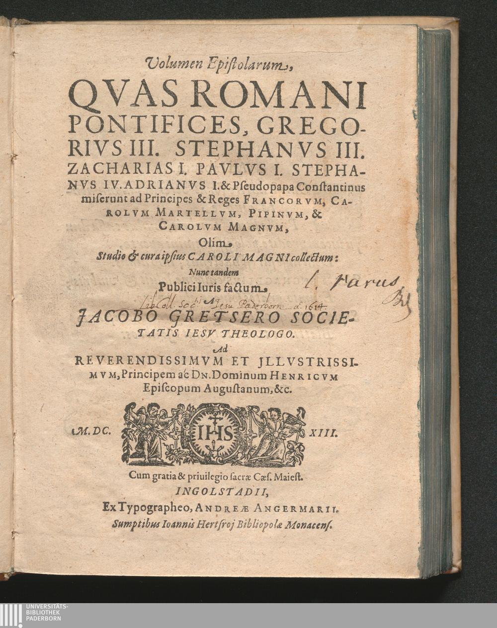 Volumen Epistolarum, Qvas Romani Pontifices, Gregorivs III., Stephanvs III., Zacharias I., Pavlvs I., Stephanvs IV., Adrianvs et Pseudopapa Constantinus miserunt& reges Francorvm, Carolvm Martellvm, Pipinvm, & Carolvm Magnvm, Olim Studio & cura ipsius Caroli Magni collectum / Nunc tandem Publici Iuris factum A Jacobo Gretsero Societatis Iesv Theologo