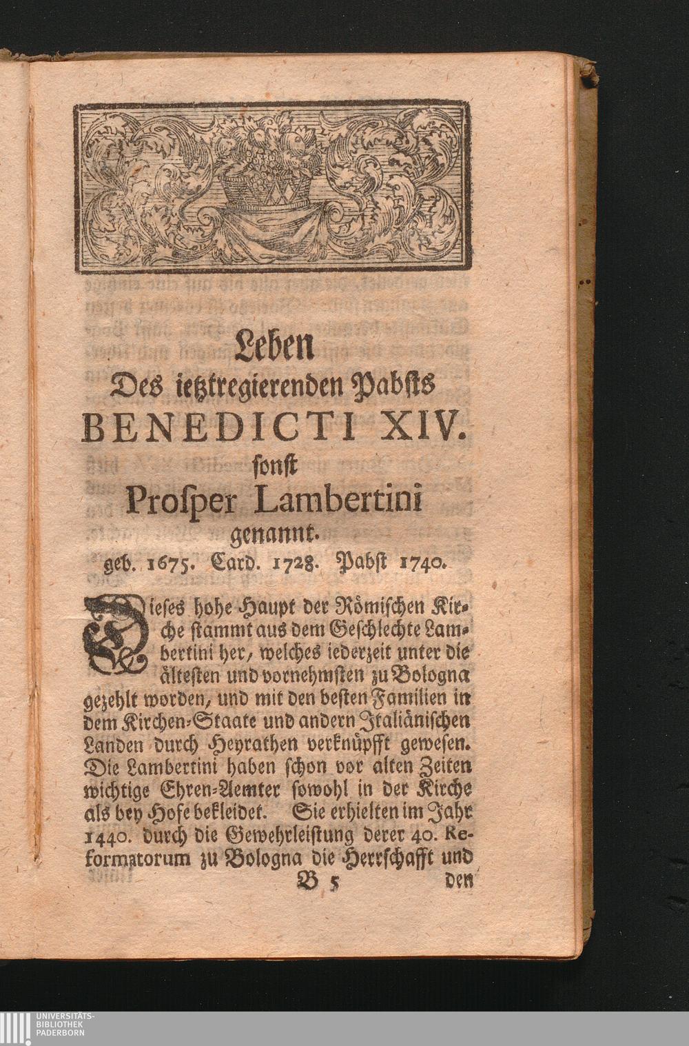 Leben Des ietztregierenden Pabsts Benedicti XIV. sonst Prosper Lambertini genannt.[...]