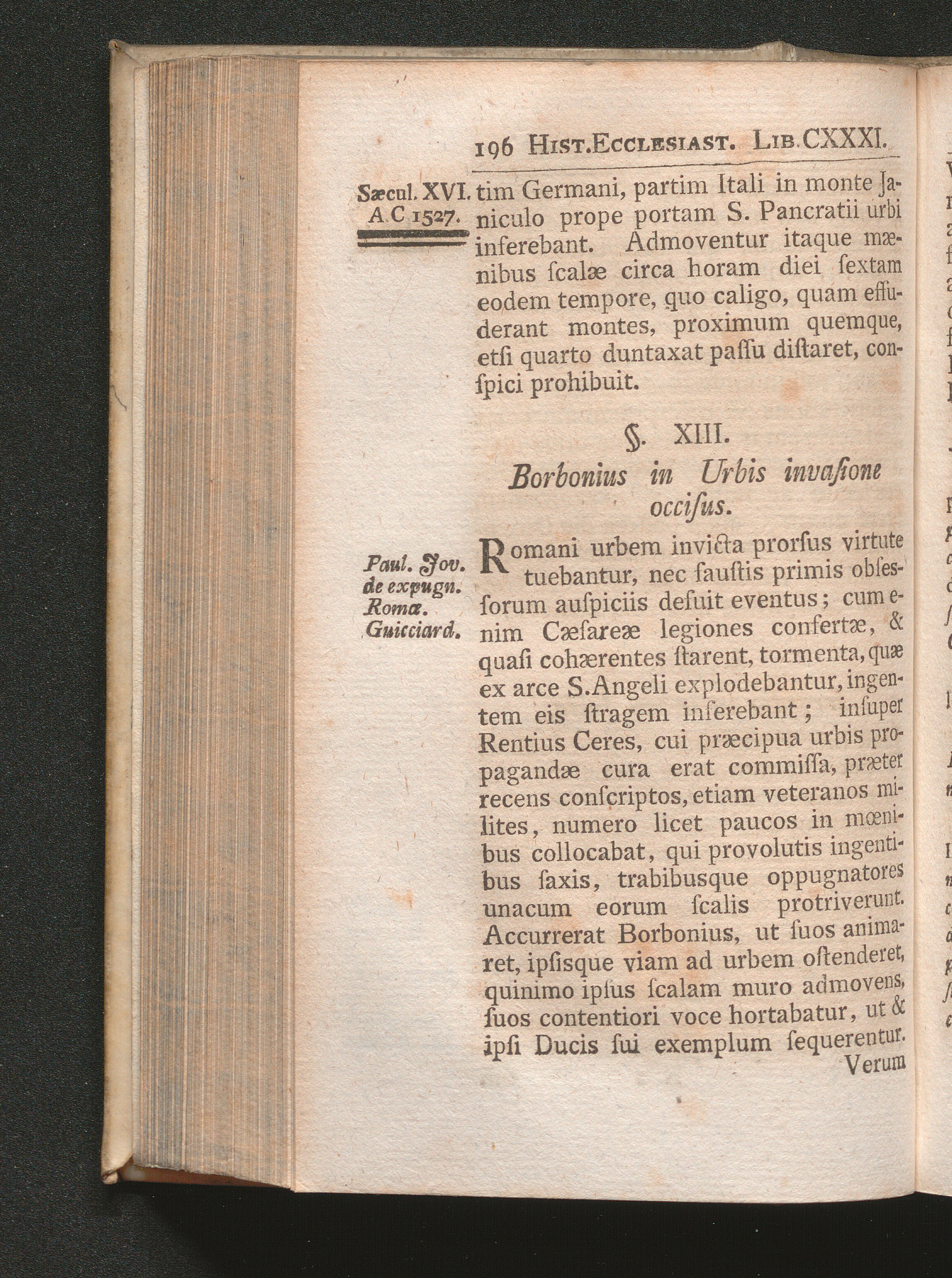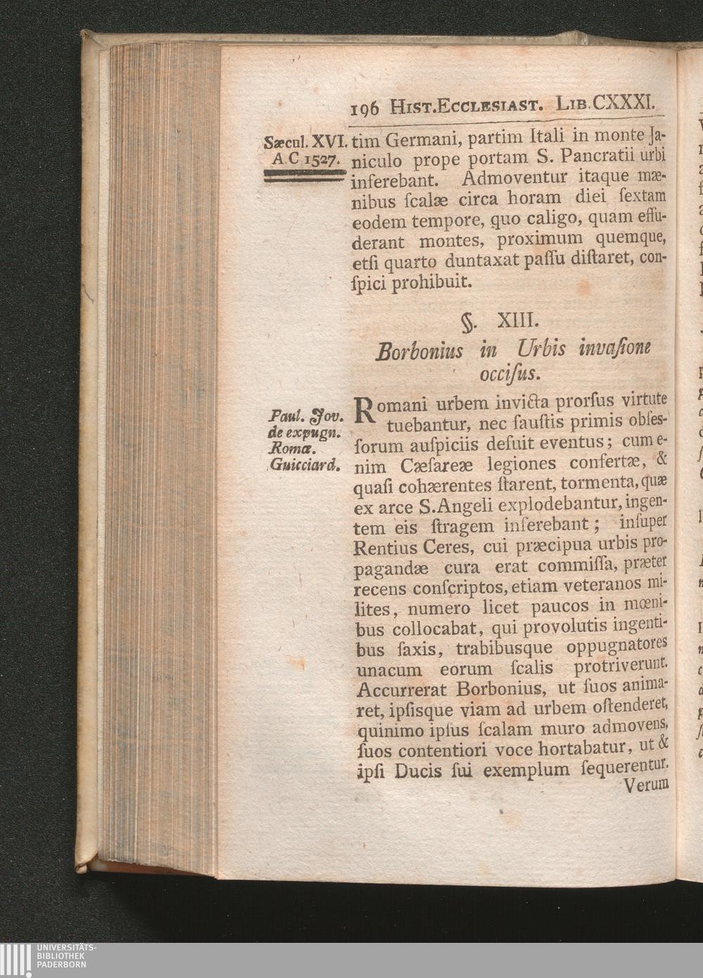 §. 13. Borbonius in Urbis invasione occisus.