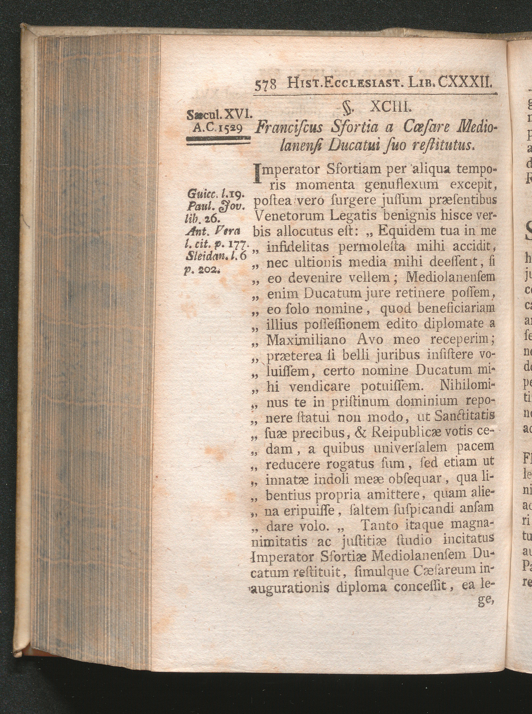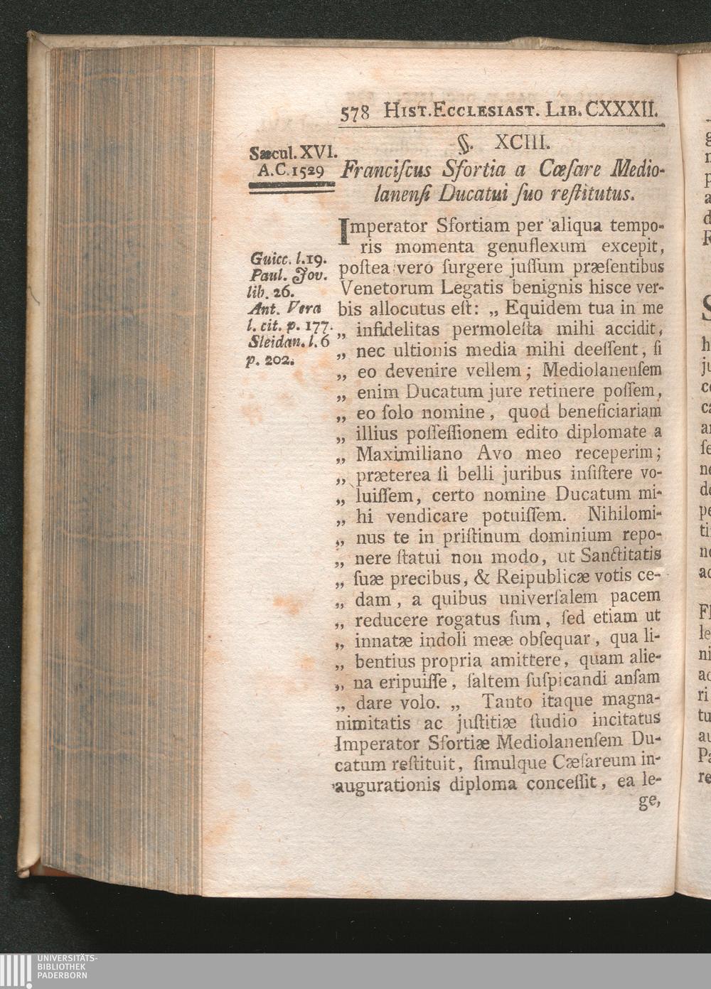 §. 93. Franciscus Sfortia a Cæsare Mediolanensi Ducatui suo restitutus.
