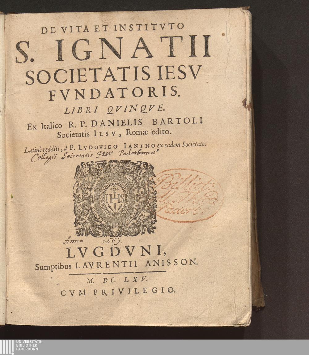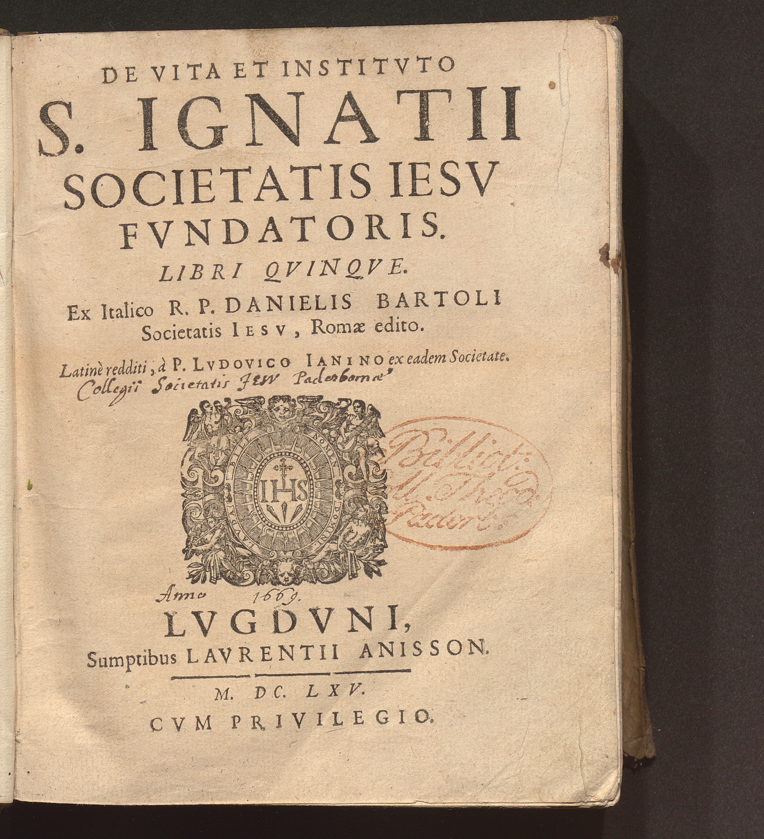 De Vita Et Institvto S. Ignatii Societatis Iesv Fvndatoris. Libri Qvinqve / Ex Italico R. P. Danielis Bartoli Societatis Iesv, Romae edito. Latinè redditi à P. Ludovico Ianino ex eadem Societate
