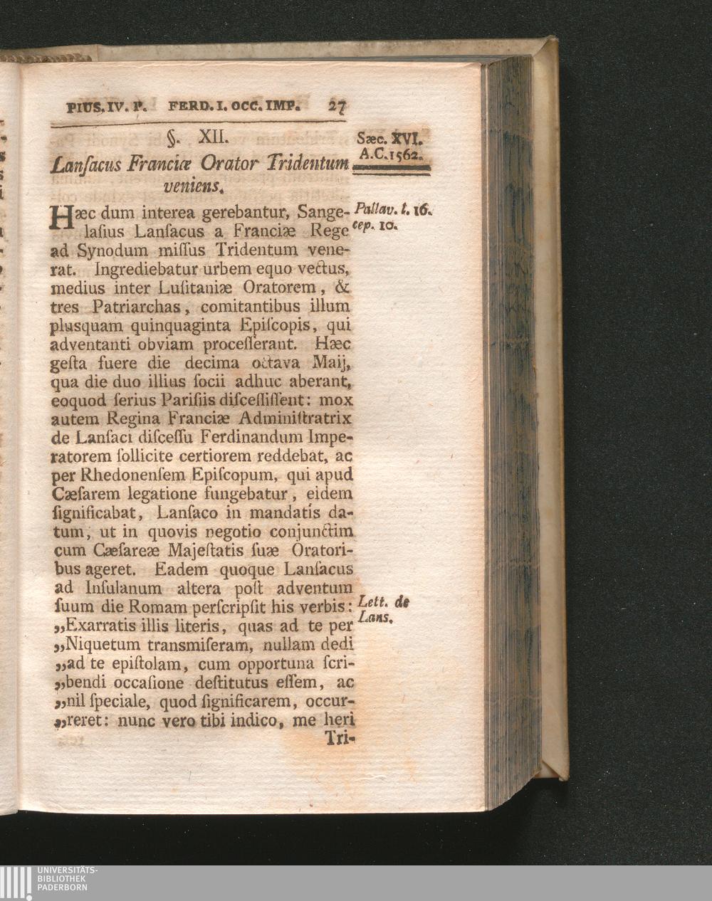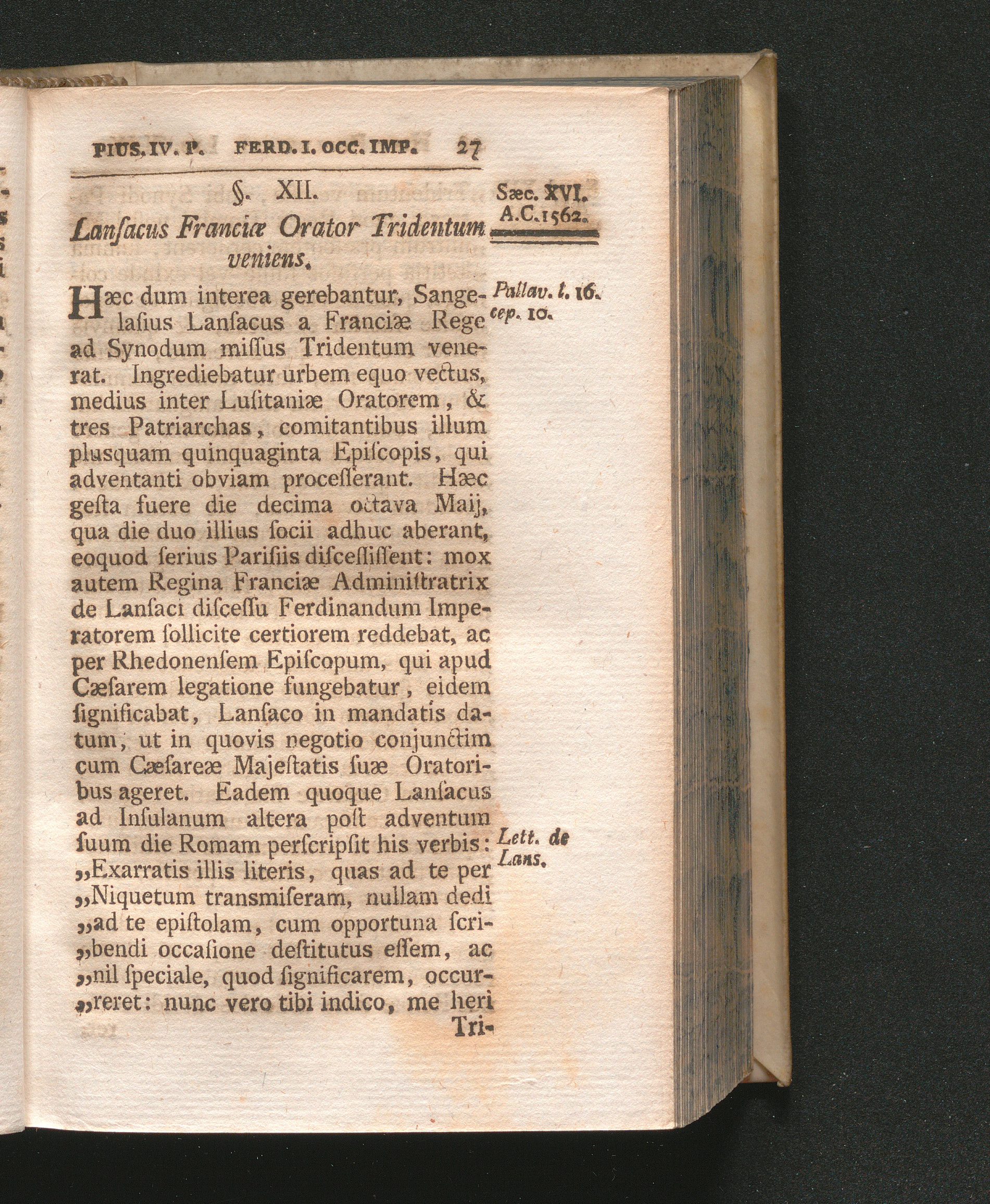 §. 12. Lansacus Franciæ Orator Tridentum veniens.