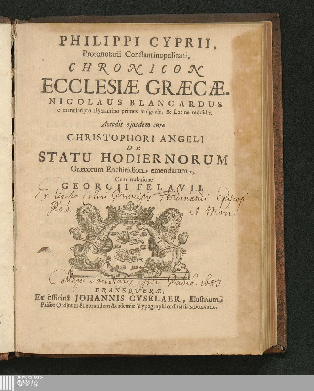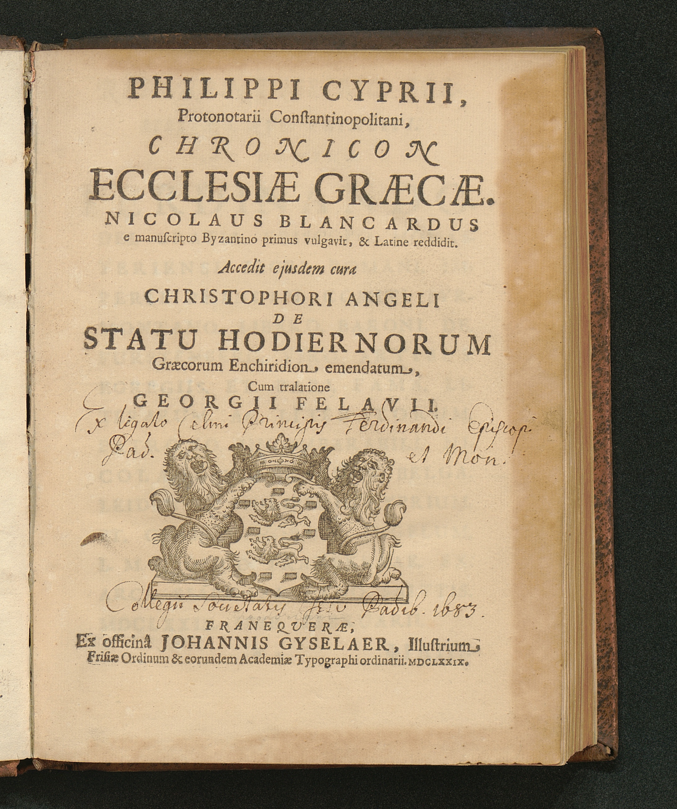 Philippi Cyprii, Protonotarii Constantinopolitani, Chronicon Ecclesiae Graecae / Nicolaus Blancardus e manuscripto Byzantino primus vulgavit, & Latine reddidit