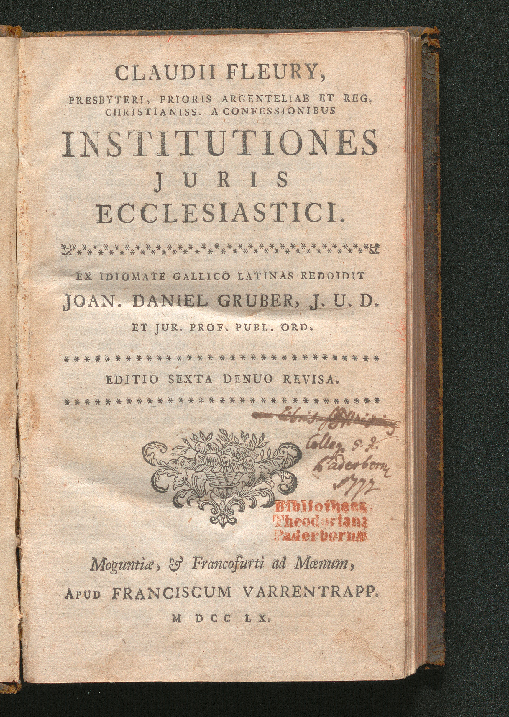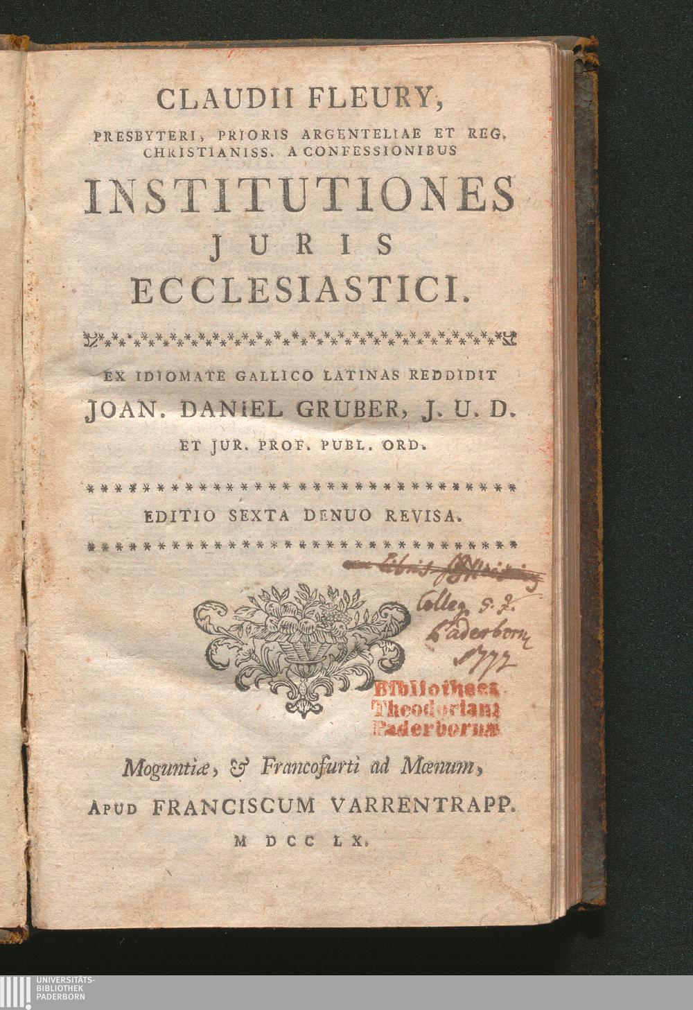 Claudii Fleury, Presbyteri, Prioris Argenteliae Et Reg. Christianiss. A Confessionibus Institutiones Juris Ecclesiastici / Ex Idiomate Gallico Latinas Reddidit Joan. Daniel Gruber, J.U.D. Et Jur. Prof. Publ. Ord.