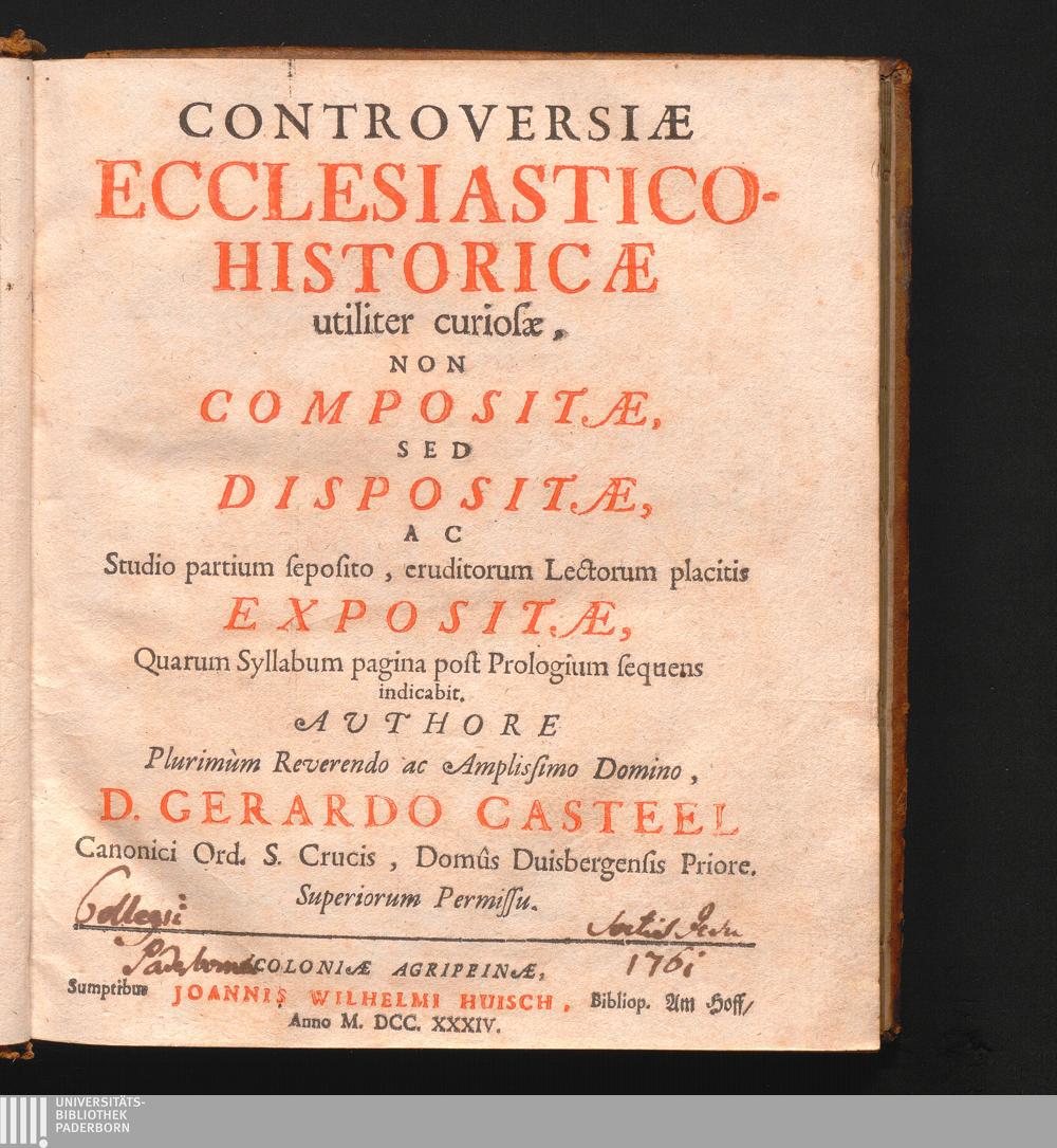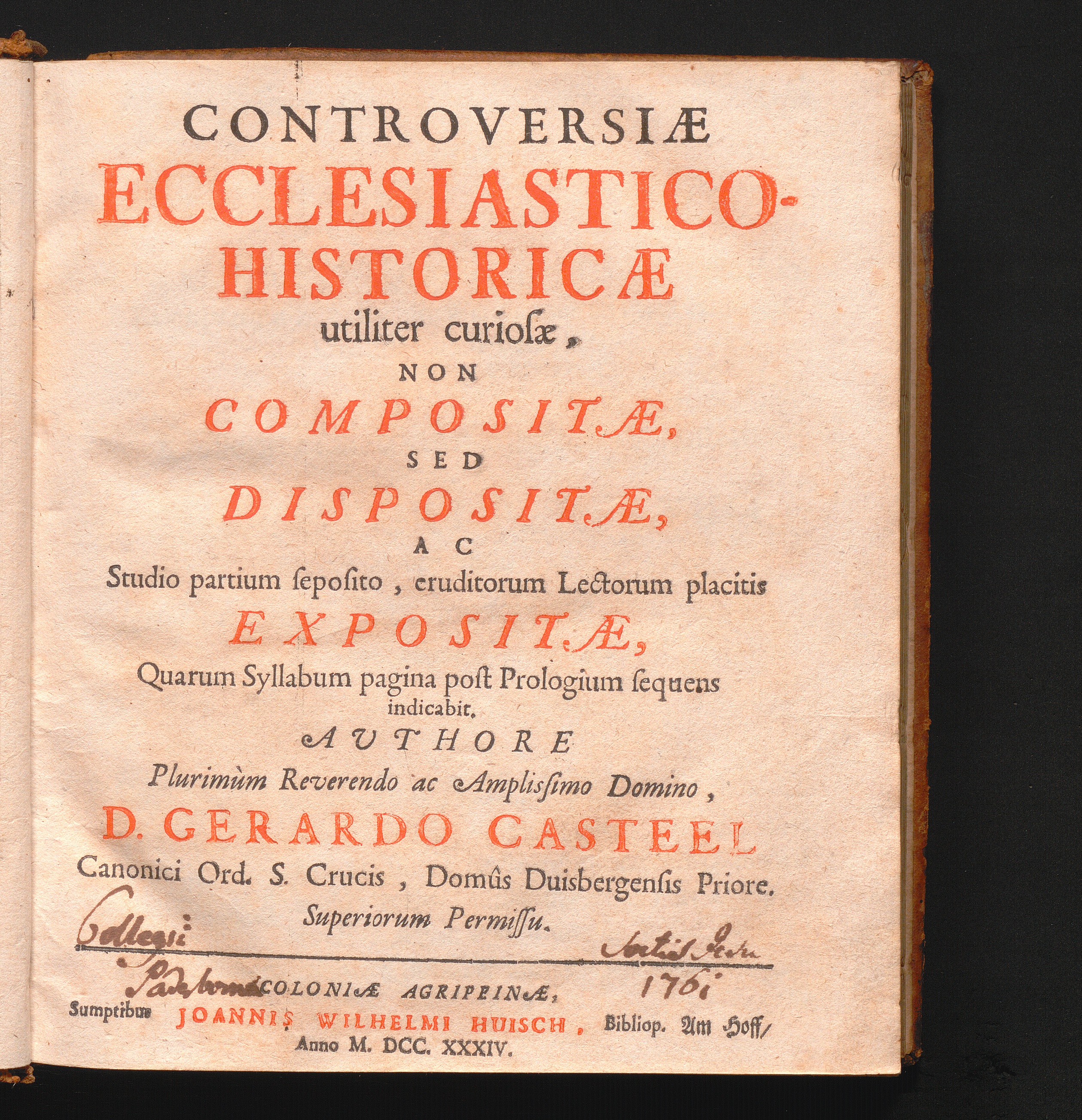 Controversiae Ecclesiastico-Historicae : utiliter curiosæ, Non Compositæ, Sed Dispositæ, Ac Studio partium seposito, eruditorum Lectorum placitis Expositæ, Quarum Syllabum pagina post Prologium sequens indicabit / Avthore Plurimùm Reverendo ac Amplissimo Domino, D. Gerardo Casteel Canonici Ord. S. Crucis, Domûs Duisbergensis Priore