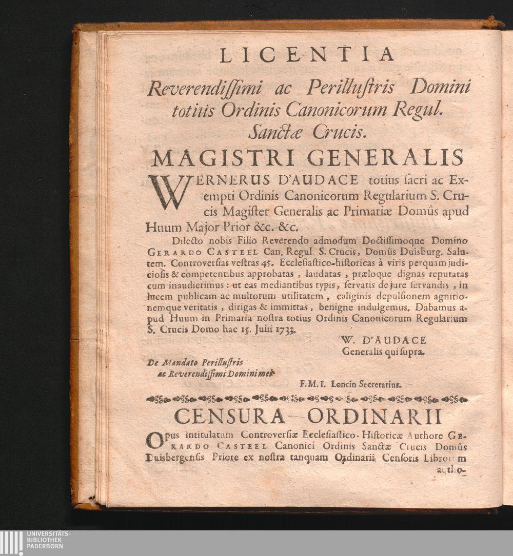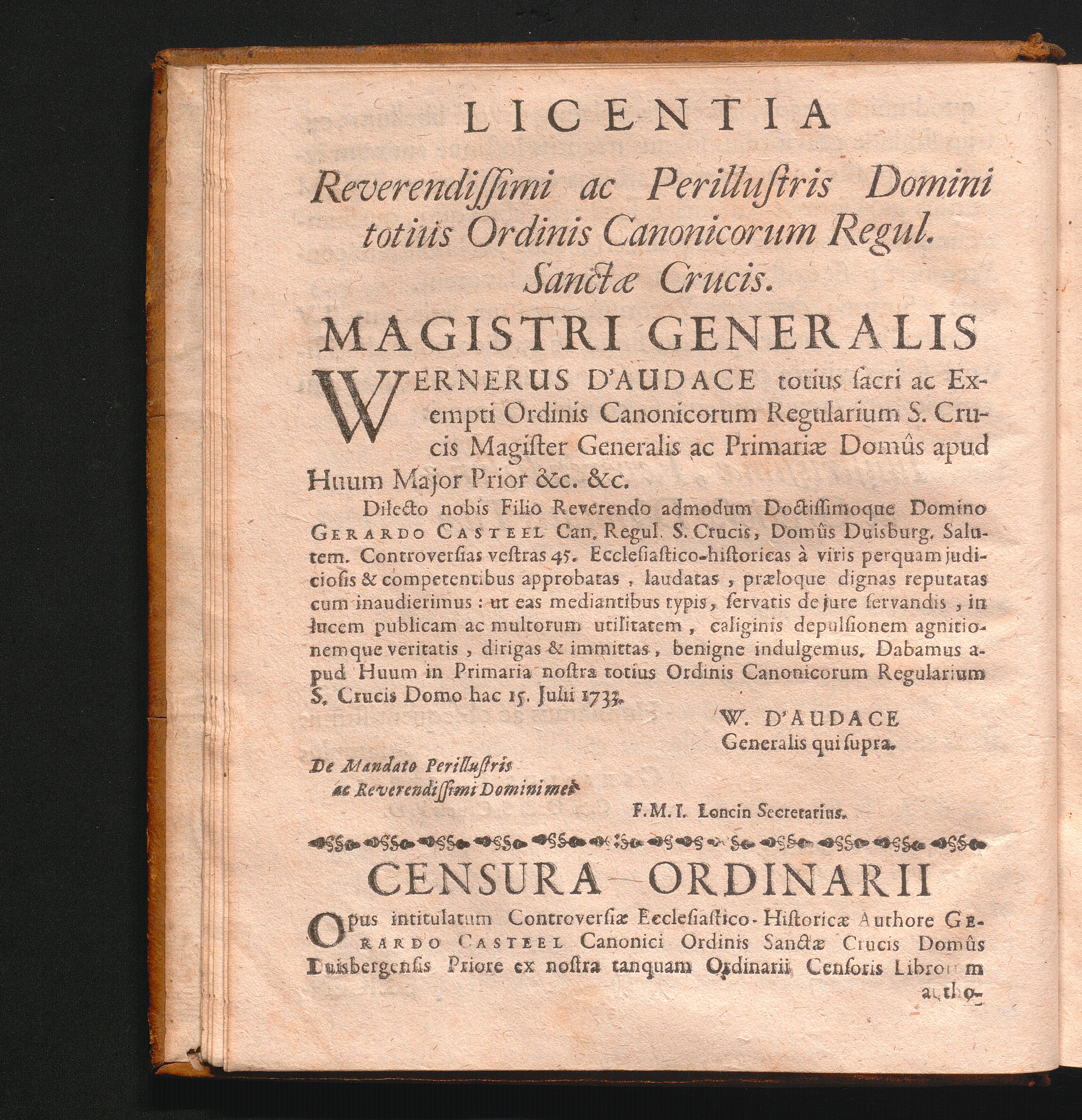 Controversiae Ecclesiastico-Historicae : utiliter curiosæ, Non Compositæ, Sed Dispositæ, Ac Studio partium seposito, eruditorum Lectorum placitis Expositæ, Quarum Syllabum pagina post Prologium sequens indicabit / Avthore Plurimùm Reverendo ac Amplissimo Domino, D. Gerardo Casteel Canonici Ord. S. Crucis, Domûs Duisbergensis Priore