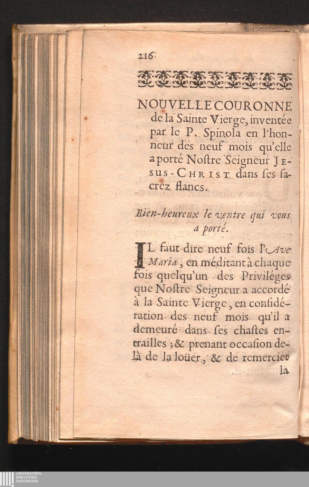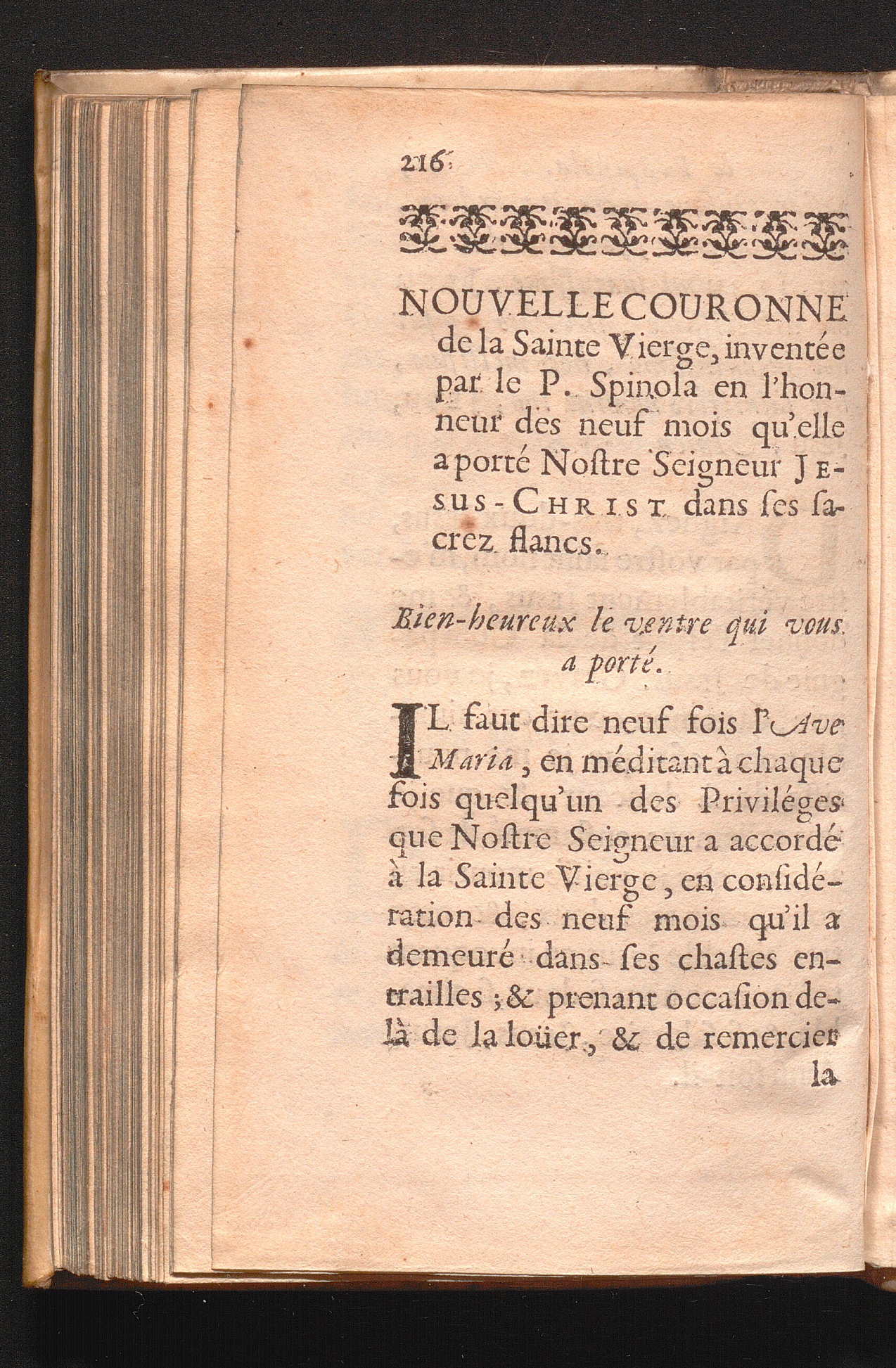 Nouvelle Couronne de la Sainte Vierge, inventée par le P. Spinola en l'honneur des neuf mois qu'elle a porté Nostre Seigneur Jesus-Christ dans ses sacrez flancs.