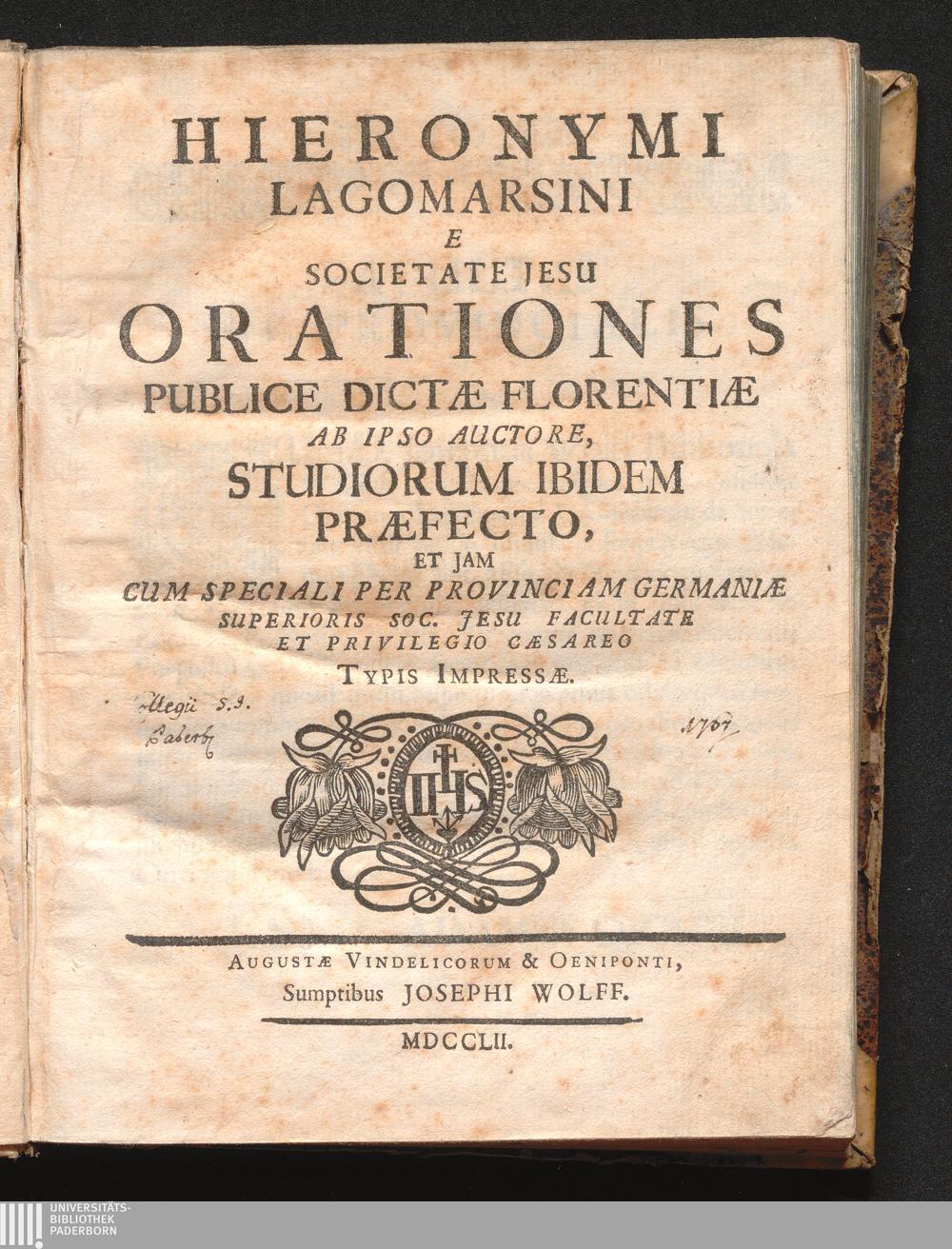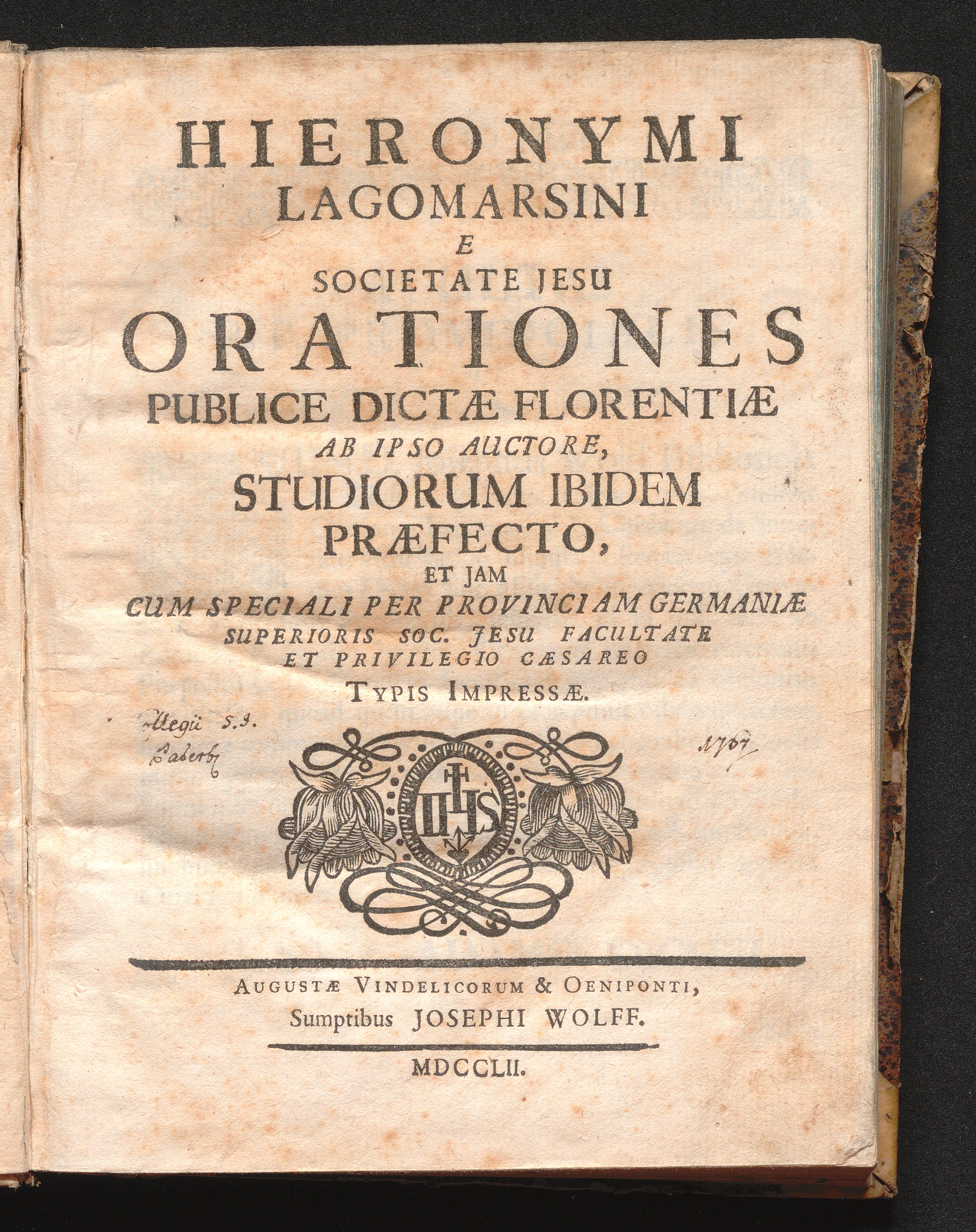 Hieronymi Lagomarsini Orationes Publice Dictæ Florentiæ : Ab Ipso Auctore, Studiorum Ibidem Præfecto, Et Jam Cum Speciali Per Provinciam Germaniæ Superioris Soc. Jesu Facultate Et Privilegio Cæsareo Typis Impressæ