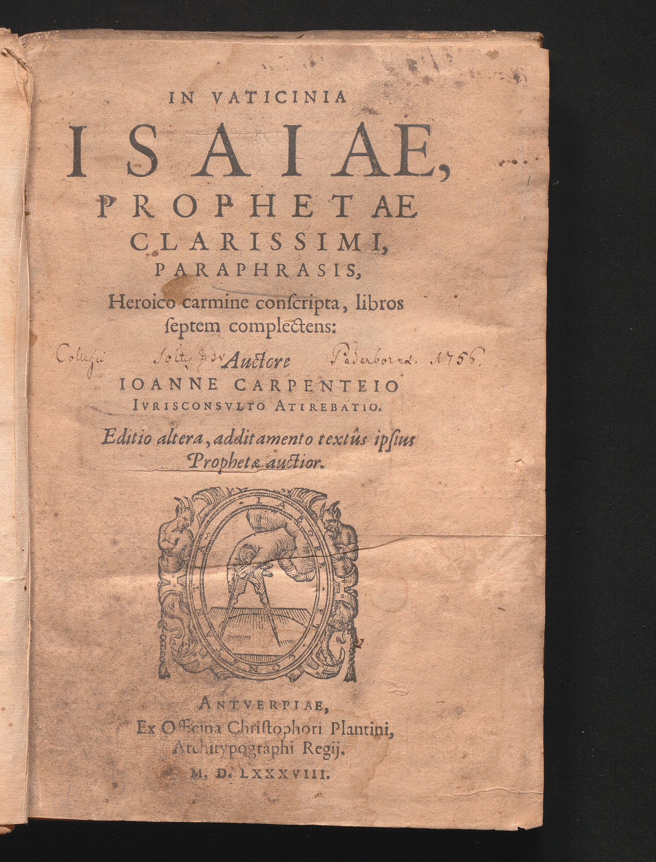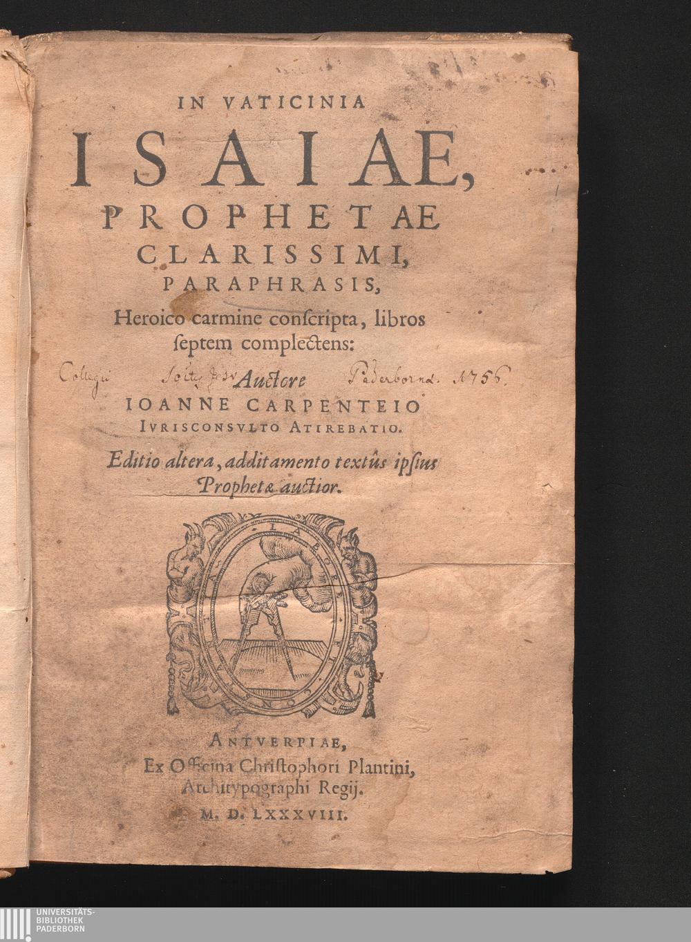 In Vaticinia Isaiae, Prophetae Clarissimi, Paraphrasis, Heroico carmine conscripta : libros septem complectens / Auctore Ioanne Carpenteio Ivrisconsvlto Atirebatio