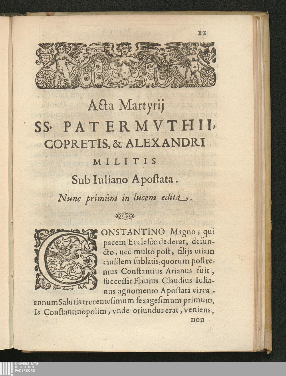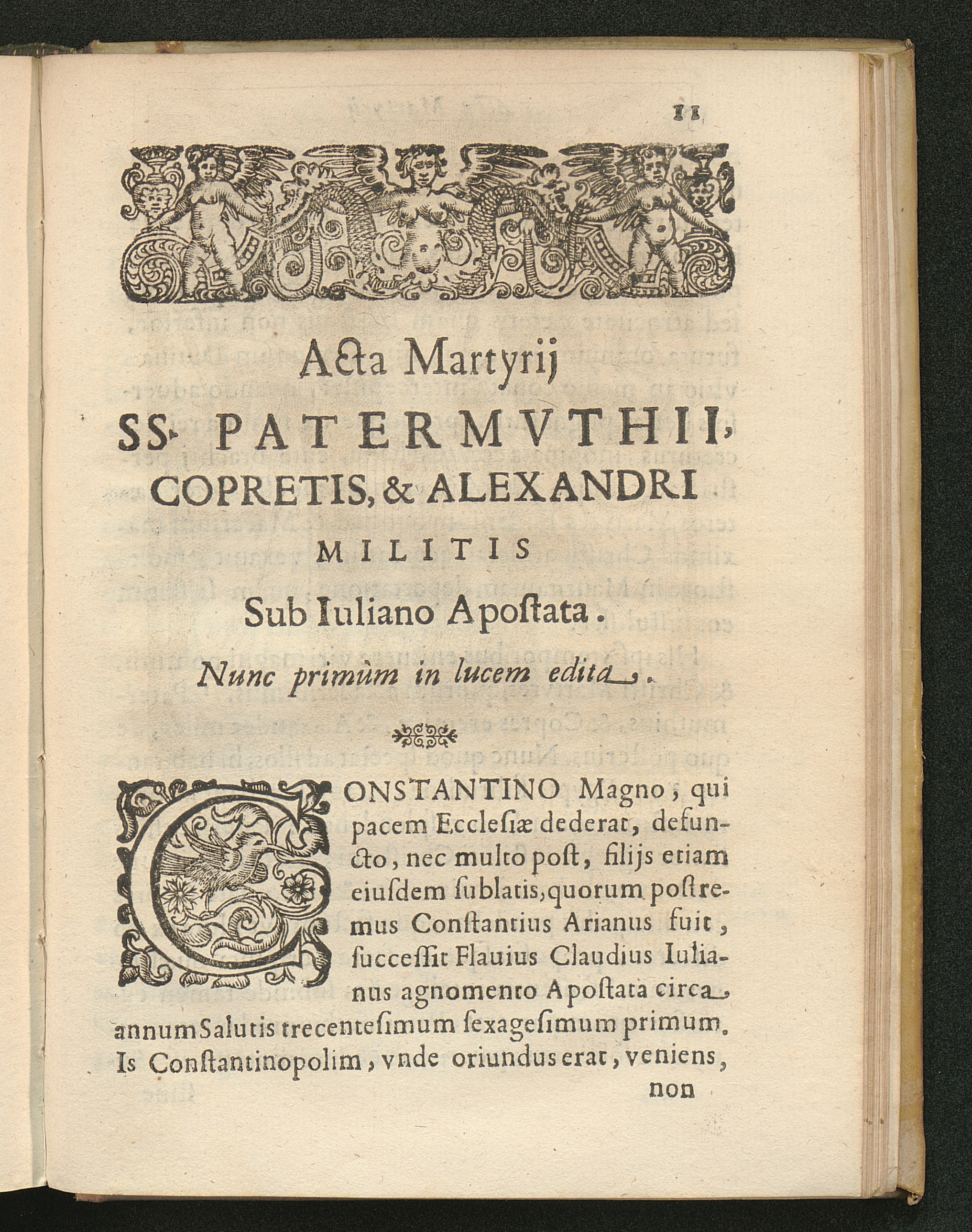 Acta Martyrii SS. Patermvthii, Copretis, Et Alexandri Militis Svb Ivliano Apostata : Quorum memoria olim in Collegiata Ecclesia Sancti Angeli in Foro Piscium celebrata, hodie in Oratorio S. Philipi Nerij in Vrbe viget / Nunquam hactenus in lucem edita & ad sensum vet. M. S. Cod. Basilicae Vaticanae notis etiam illustrata. Studio & Opera Ioannis Baptistae Mari Eiusdem Ecclesiae S. Angeli in Foro Piscium Canonici