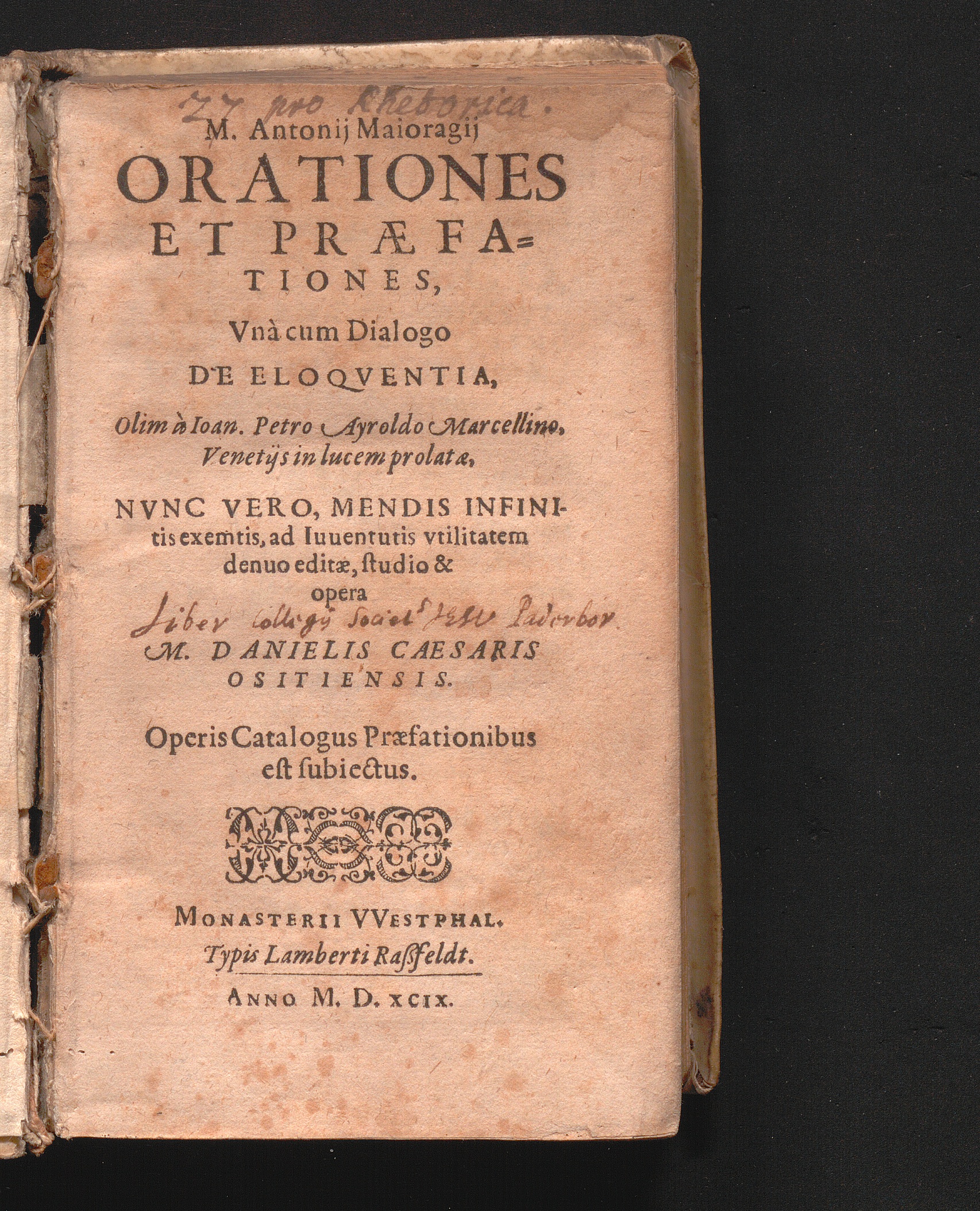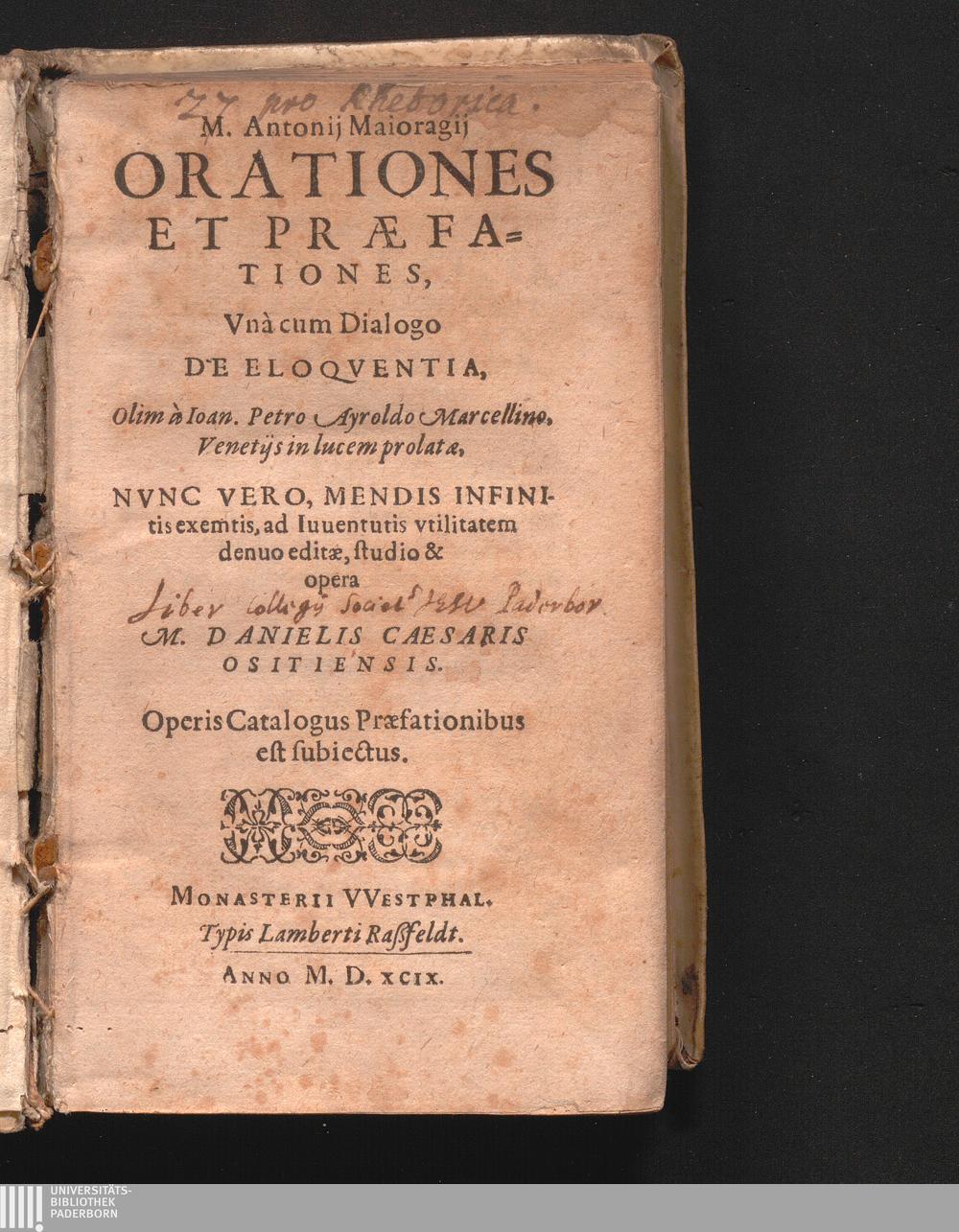 M. Antonij Maioragij|| Orationes|| Et Praefa-||tiones : Vnà cum Dialogo|| De Eloqventia,|| ; Operis Catalogus Praefationibus|| est subiectus.|| / Olim à Ioan. Petro Ayroldo Marcellino,|| Venetijs in lucem prolatae||