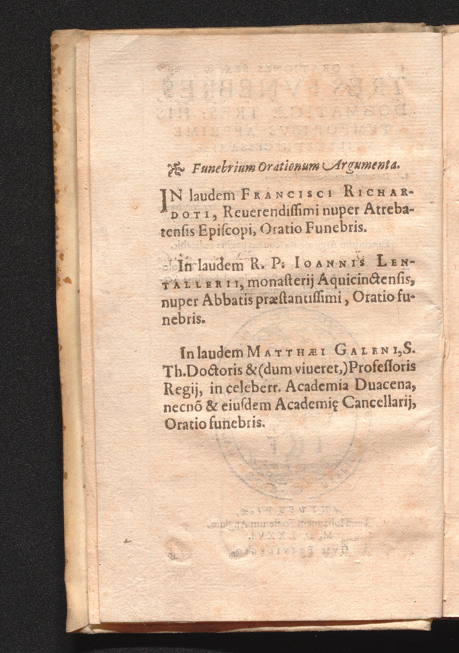 Orationes Sex, Tres Fvnebres, Dogmaticæ Tres : His Temporibus Apprime Utiles, Et Necessariae. / A Thoma Stapletono Anglo S. Theologiae Doctore&Professore Regio, in celeberrima Academia Duacena publicè omnes habitae
