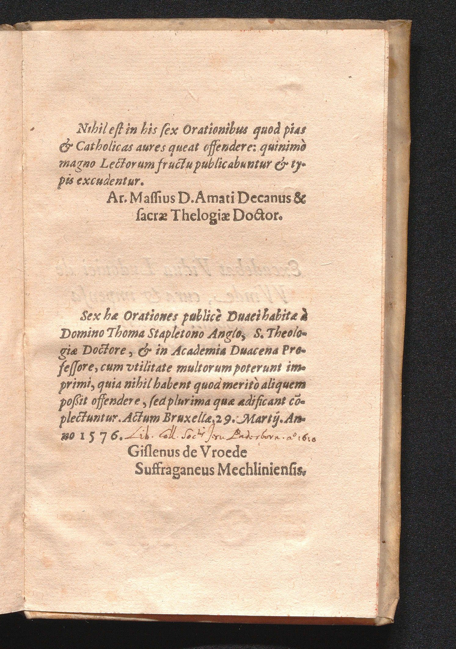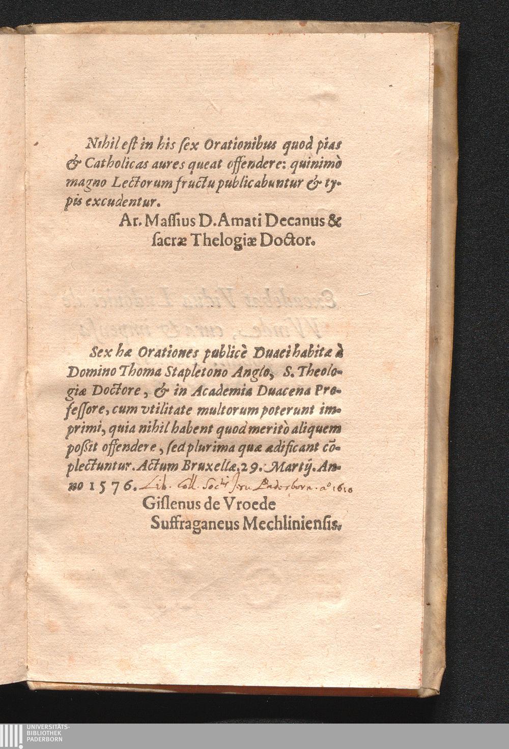Orationes Sex, Tres Fvnebres, Dogmaticæ Tres : His Temporibus Apprime Utiles, Et Necessariae. / A Thoma Stapletono Anglo S. Theologiae Doctore&Professore Regio, in celeberrima Academia Duacena publicè omnes habitae